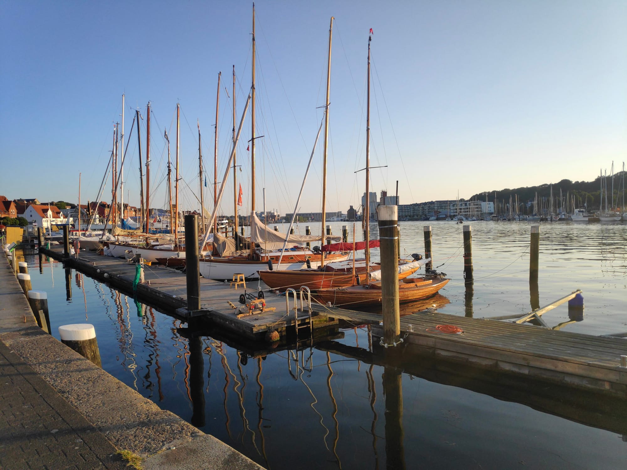 Dank meiner Gewohnheit und des frühen Sonnenaufgangs wache ich gegen sechs Uhr auf, lese noch ein wenig, mache mich dann aber rasch fertig für einen Erkundungsgang durch die Flensburger Stadtmitte; Heiko schläft noch und das Frühstück ist auch erst für neun Uhr bestellt. Das Wasser der Förde liegt still und hellblau im Morgenlicht und ich genieße den Ausblick auf zwei Wochen Urlaub, Zelten und Natur. Ich stricke mit Blick auf den Hafen, schlendere durch die schmalen Gassen, organisiere mir einen Kaffee, führe noch einen kurzen small talk mit einem Mann, der mich fragt, ob ich diejenige sei, die kürzlich am Hafen Gegenstände bestrickt hätte, dann ist es langsam Zeit fürs Frühstück, das uns Corona sei Dank einer Tüte vor die Zimmertür gestellt wird.