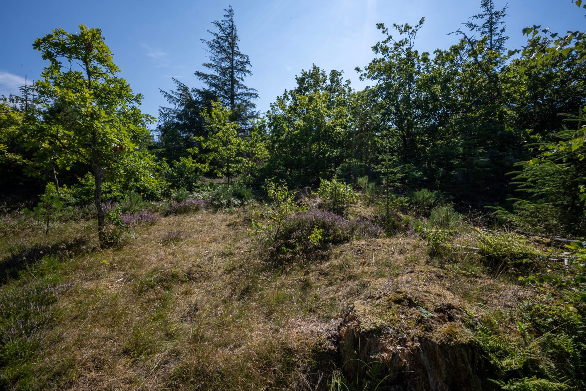 Am Vorabend hat mich eine Mail der Fährgesellschaft erreicht, aufgrund technischer Störungen verzögert sich die Abfahrt auf von ursprünglich gegen 18 Uhr auf 21:15 - so viel zu dem Plan, noch im Hellen anzukommen und das Zelt aufzubauen. Dafür haben wir reichlich Zeit, uns in Dänemark herumzutreiben. Wir fahren zunächst an die Küste westlich von Aalborg. Der Strand gefällt uns nicht, das Wasser ist trübe und hat kaum Brandung, dafür machen wir einen Spaziergang durch ein kleines Wäldchen, auf dem uns reichlich alte Kriegsbunker unterkommen. Wann immer wir auf Heide treffen, bin ich ganz entzückt, denn sie blüht und die Landschaft ist von ihrem Lila ganz verzaubert.