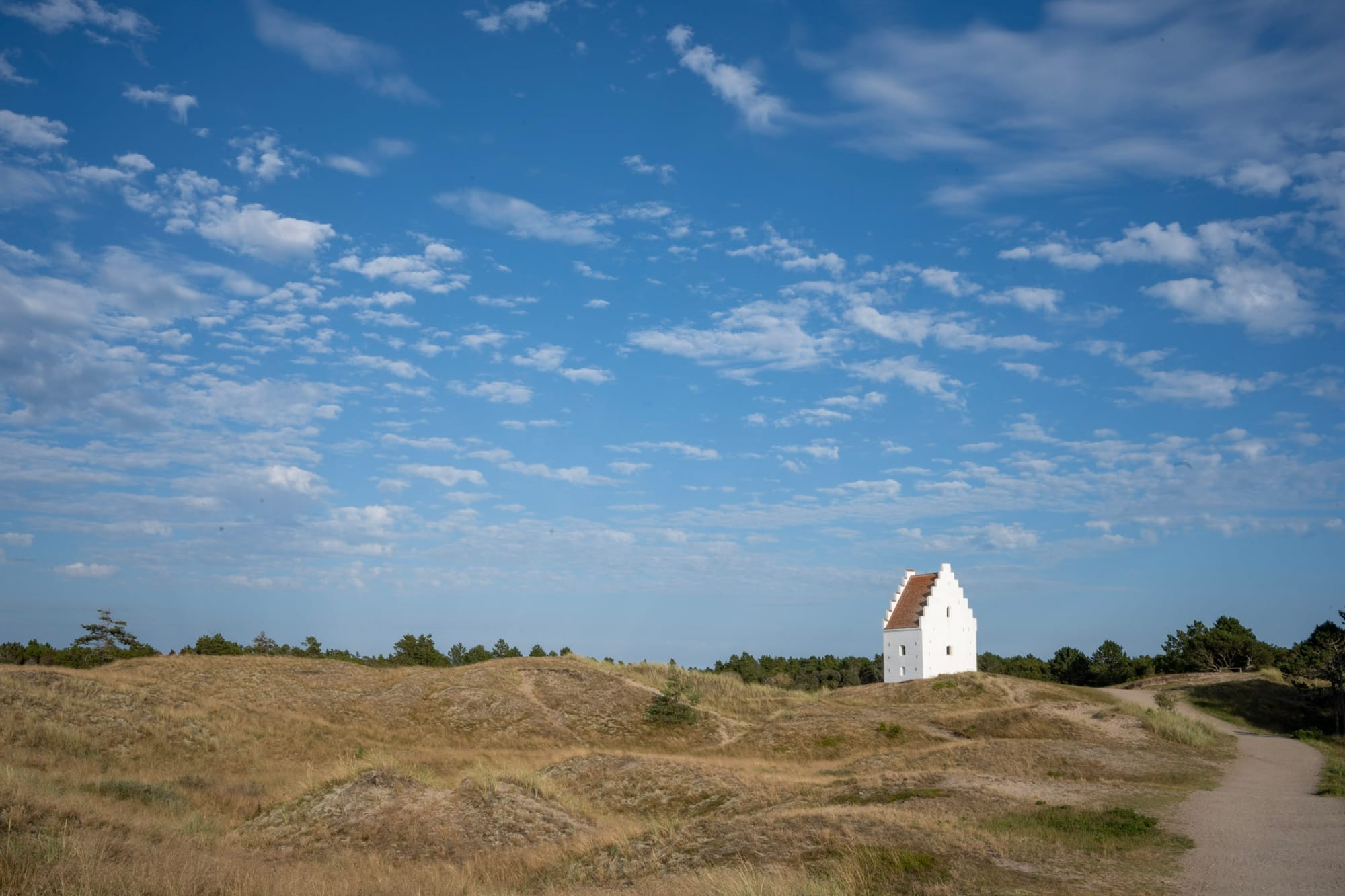 Dann geht es weiter nach Norden, wir müssen ja schließlich bis nach Hirtshals und wo wir schon mal da sind, will ich unbedingt an den nördlichsten Zipfel Dänemarks, nach Skagen. Als wir dort ankommen, wird es langsam Abend und das goldene Licht über der gelbgrünen Dünenlandschaft mit vereinzelten blühenden Heidebüschen dazwischen ist spektakulär. Nach dem Strandspaziergang zum Skagerrak gibt es zurück am Parkplatz einen dringend benötigten hot dog, auf dem Rückweg halten wir noch an der im Sand versunkenen Kirche und dann fahren wir einigermaßen eilig zum Hafen nach Hirtshals, denn man soll spätestens um 20:15 bereitstehen.