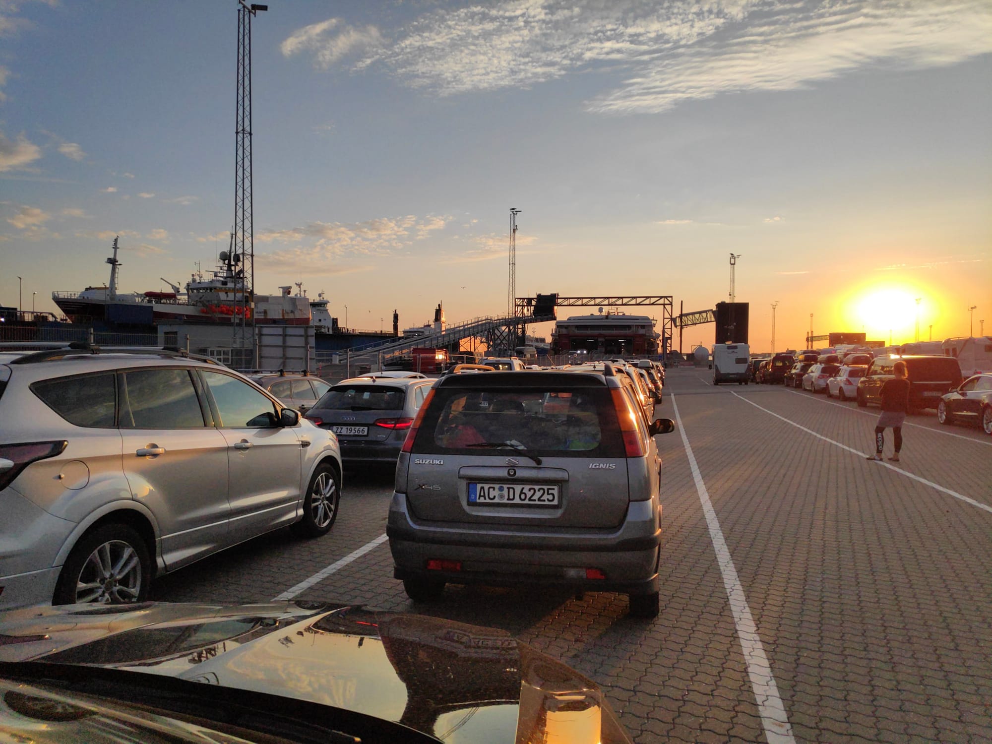 In weiser Voraussicht habe ich schon auf dem Parkplatz eine lange Hose angezogen und nehme auch noch Halstuch und Jacke mit an Bord - vielleicht will ich ja nach draußen gehen und da zieht es bestimmt. Tatsächlich ist das Außendeck so klein und gedrängt voll mit Rauchern und ich selber so platt vom Tag, dass ich keinen Fuß vor die Tür setze und in meinem ziemlich bequemen Sitz schnell eindöse. Die warmen Sachen kann ich dennoch brauchen, denn den Infektionsschutz versteht man auf der Fähre offenbar so, dass die Klimaanlage auf voller Leistung läuft. Auf einigen Sitzen fühlt man sich wie von einem kalten Föhn angeblasen und so zähle ich mal wieder fröstelnd die Minuten bis zur Ankunft.