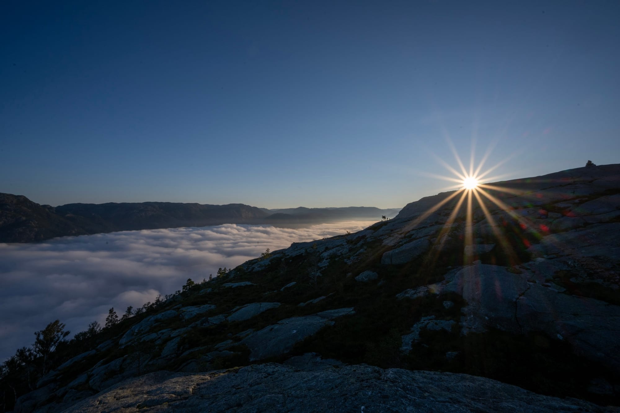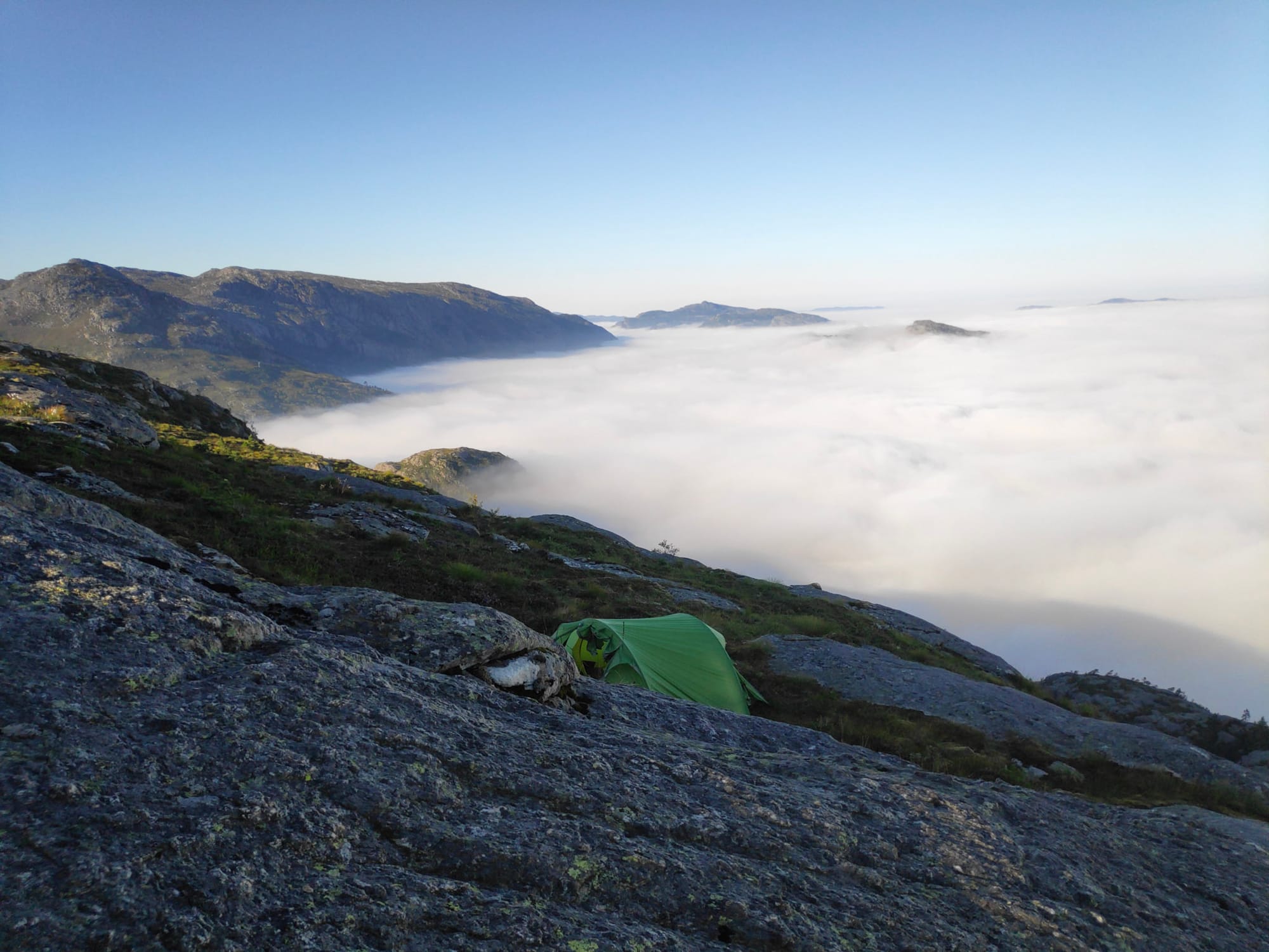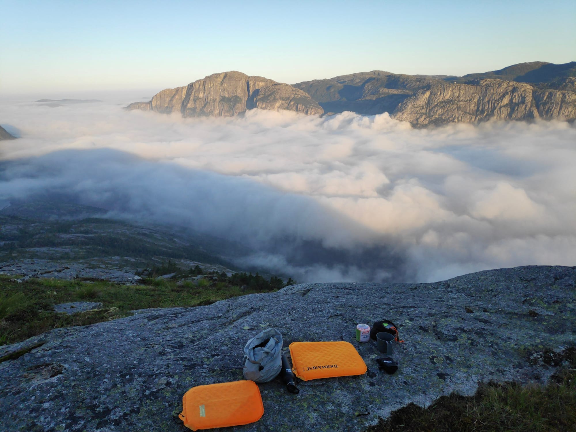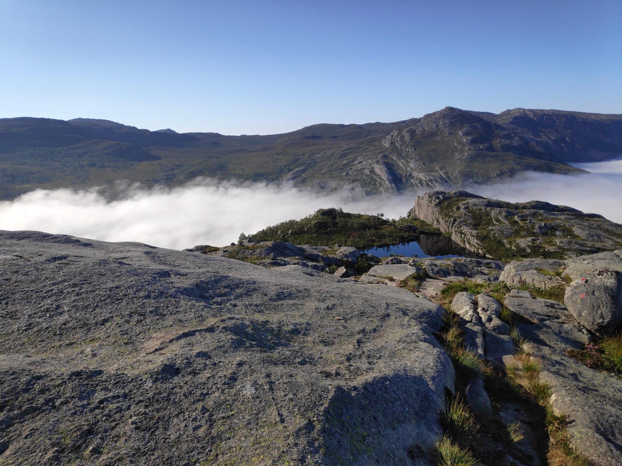Am nächsten Morgen wache ich früh auf, die Sonne scheint bereits vom wolkenlosen Himmel - alle Wolken sind unter uns, füllen den Lysefjord in einer dicken Schicht und kriechen langsam die Hänge hinauf. Das Schauspiel ist nicht mehr neu und doch jedes Mal wieder unvergleichlich. Wir schauen den sich langsam bewegenden Luftmassen zu, während wir TUCs und Kaffee frühstücken, und machen uns dann an Zeltabbau und Abstieg. Das kleine Plateau mit dem See unterhalb des Gipfels ist vom gleißenden Weiß wie eingerahmt, während der See den blauen Himmel widerstrahlt.