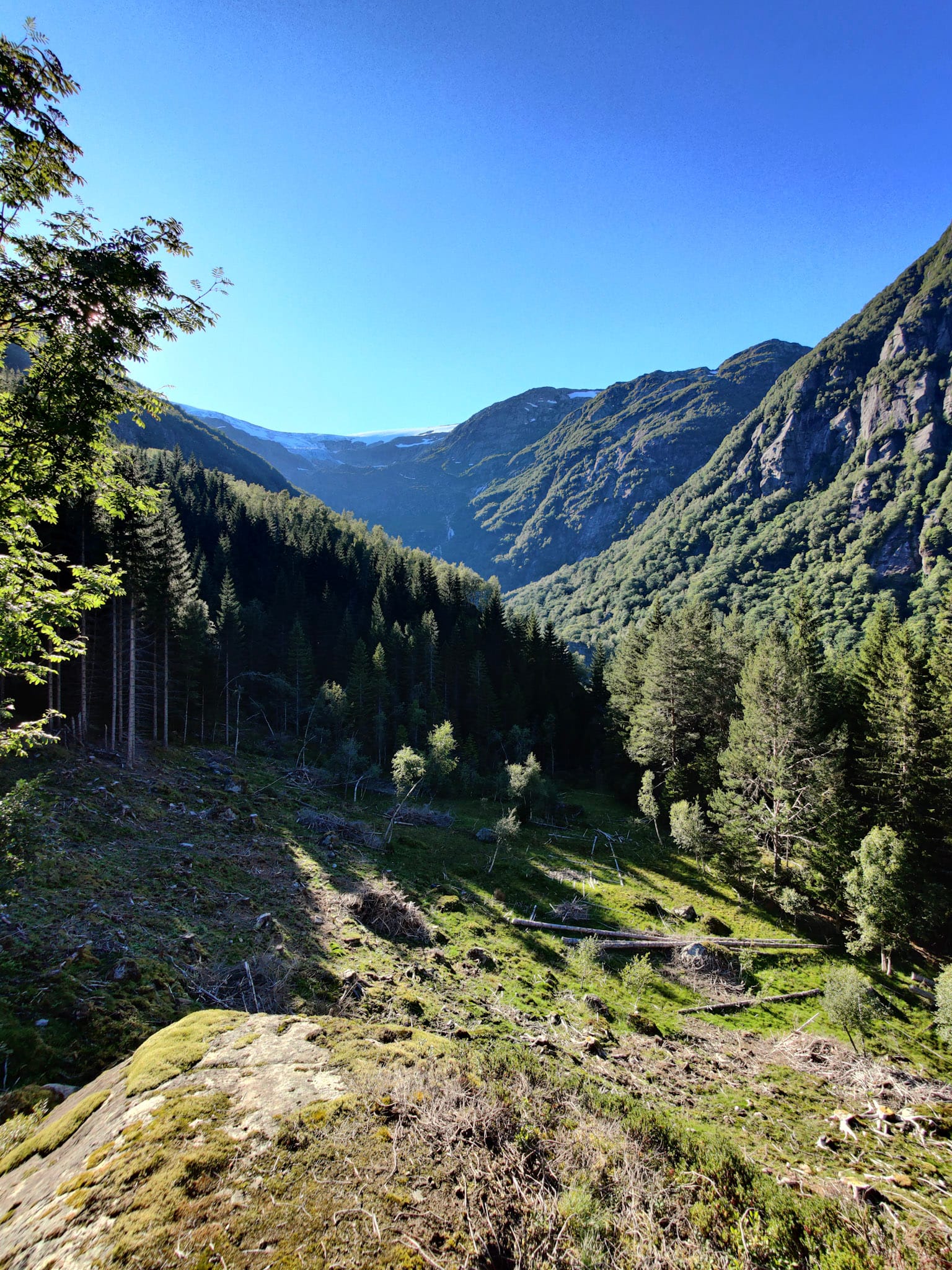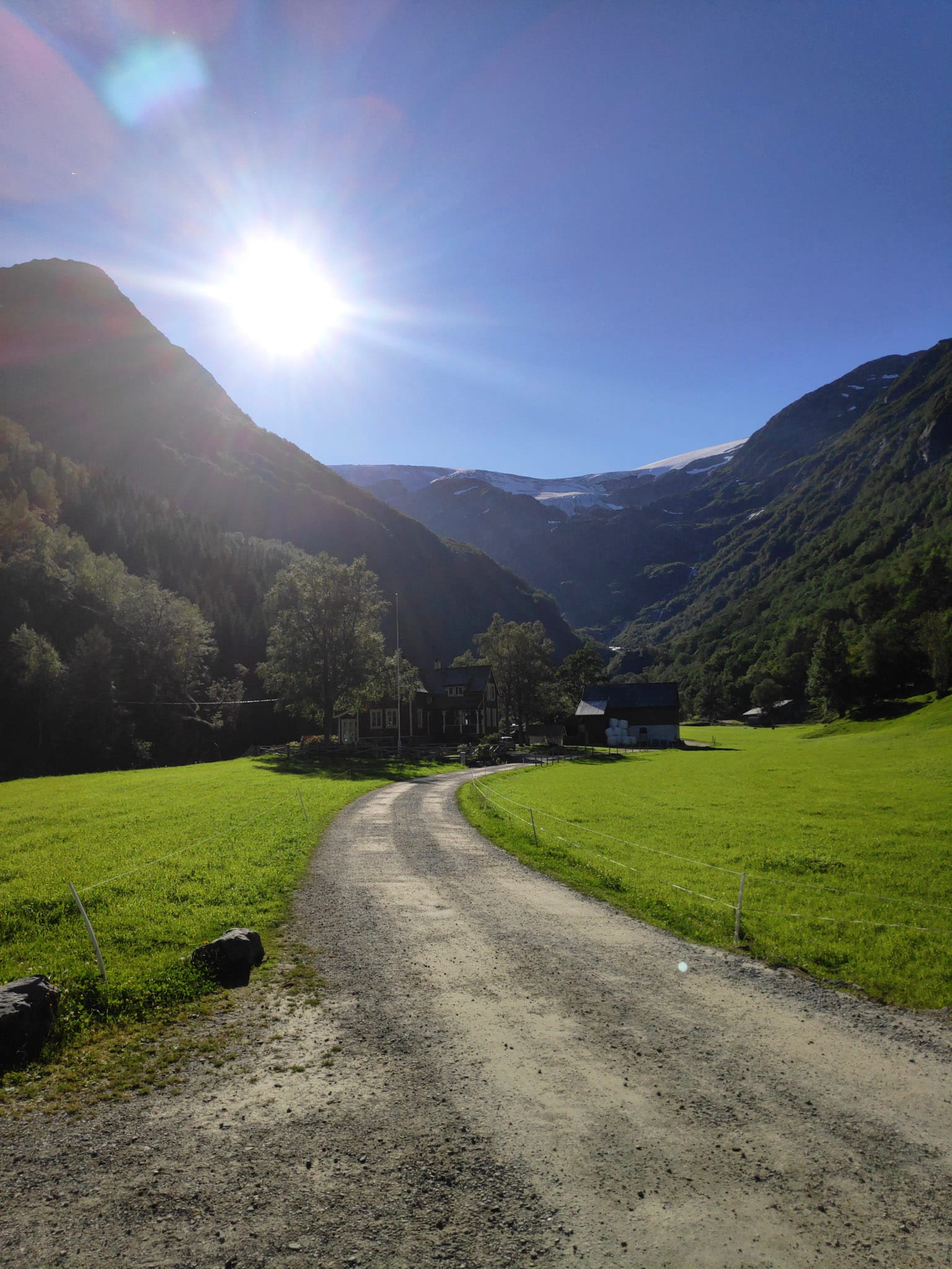 Das Städtchen selbst streifen wir nur und biegen direkt in die Straße zum Hof Buer ab, von wo aus wir zum heutigen Nachtlager starten werden. Auch hier begleitet uns wieder ein rauschender Wildbach. Der große Parkplatz am Hof ist als Basis für Wanderungen zum Gletscher sehr beliebt und gut frequentiert, was man schon daran sieht, dass alle Wiesen links und rechts der Straße sorgfältig abgezäunt sind und hin und wieder sogar “no camping”-Schilder stehen. Es ist das einzige Mal auf unserer Reise, dass sie uns begegnen. Da es schon 17 Uhr wird, ist der Parkplatz nicht mehr sonderlich gefüllt, nur einige wenige Vanbesitzer richten sich für den Abend ein; es ist ein idyllisches Plätzchen mit den sattgrünen Wiesen des Bauernhofs und den bewaldeten Hängen, über denen die Gletscherzunge thront, aber in der Gegend gibt sicherlich spektakulärere Nachtlager. Nach Klärung der üblichen großen Fragen (Haben wir alles? Was gibt es zu essen?) brechen wir zu einem davon auf und werden dem Wanderweg Richtung Reinanuten auf ein weites Hochplateau, das Buerdalen, folgen.