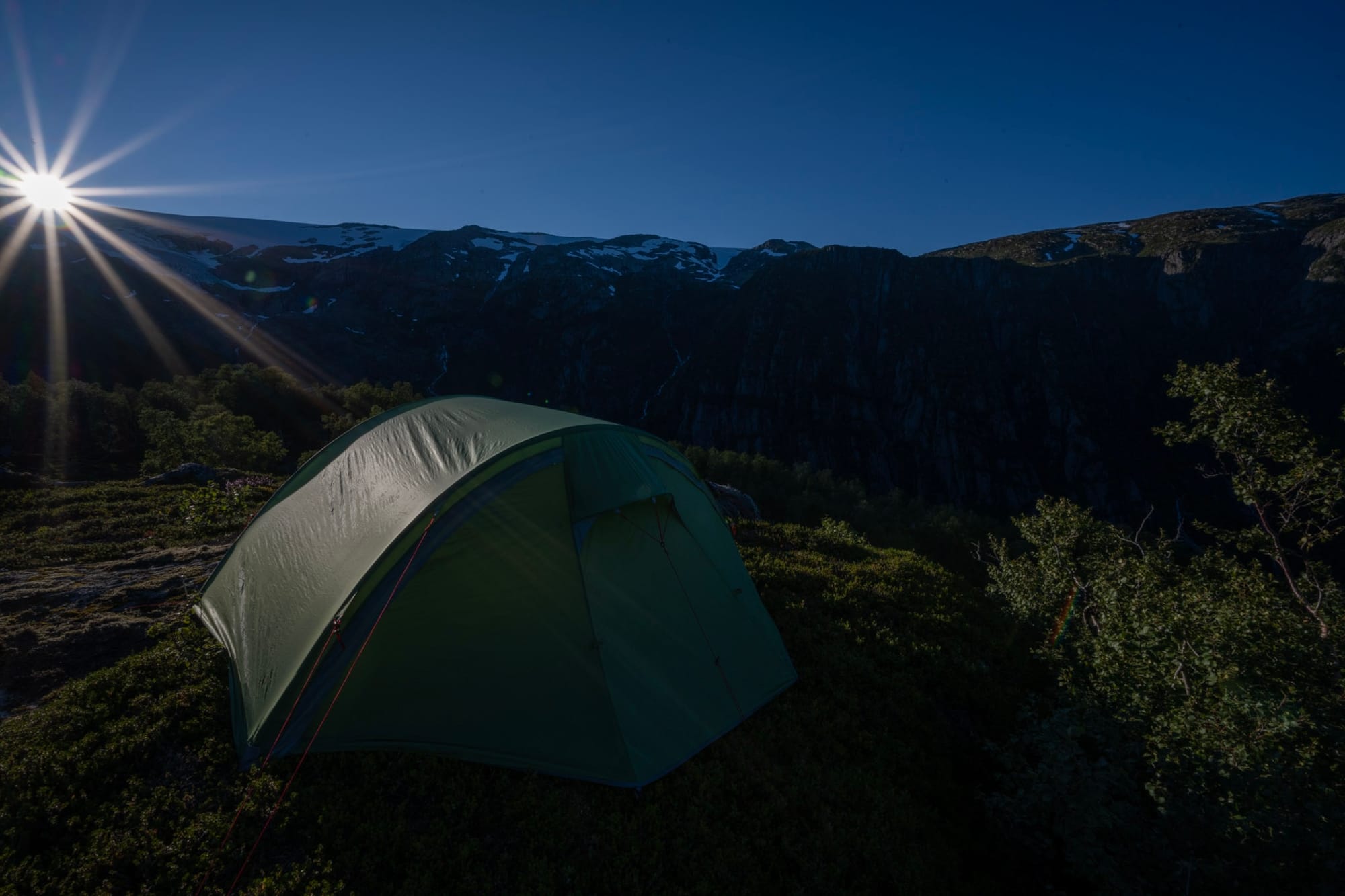 Die Routenbeschreibung lässt kurzes, aber knackiges vermuten und enttäuscht nicht, auf anderthalb Kilometern geht es fast 500 Höhenmeter nach oben, wobei die ersten hundert Meter nur wenig ansteigend über den Fluss und in den Wald führen. Der Hang liegt bereits im Schatten, die Luft im Wald ist kühl und feucht, der Weg führt, sobald er sich einmal zum Anstieg entschlossen hat, steil über Felsen und Wurzeln nach oben. Ich konzentriere mich auf meine Schritte und aufs Atmen. Wir kommen gut voran und es dauert nicht sehr lange, bis das Gelände wieder flacher wird, erste Beerenheide in Sicht kommt und mir das deutliche Aroma von Schafkötteln in die Nase steigt - das Plateau ist in Reichweite! Hier hat uns die Abendsonne wieder und Heiko findet einen Zeltplatz auf einem heidebewachsenen Mugel mit freier Sicht auf Gletscher in drei Richtungen. Während wir essen und in den Sonnenuntergang träumen, zähle ich die umgebenden Wasserfälle und komme auf mehr als 10 Stück, der lauteste davon rauscht nicht weit vom Zelt aus durch den Wald zu Tal. Da das Wetter gut bleiben soll, entschließen wir uns dazu, das Buerdalen morgen einmal längs zu durchwandern, am Sandvevatnet abzusteigen und in Odda gegebenenfalls ein Taxi zurück nach Buer zu nehmen. Der Tag war lang und bald, nachdem die Sonne hinter dem Gletscher verschwunden ist, liegen auch wir in unseren Schlafsäcken. Es ist mild genug, dass das Außenzelt offen bleiben kann. Ich bin gespannt, ob wir morgen auch wieder auf eine “Nebelsuppe” blicken oder gar darin stecken werden.
