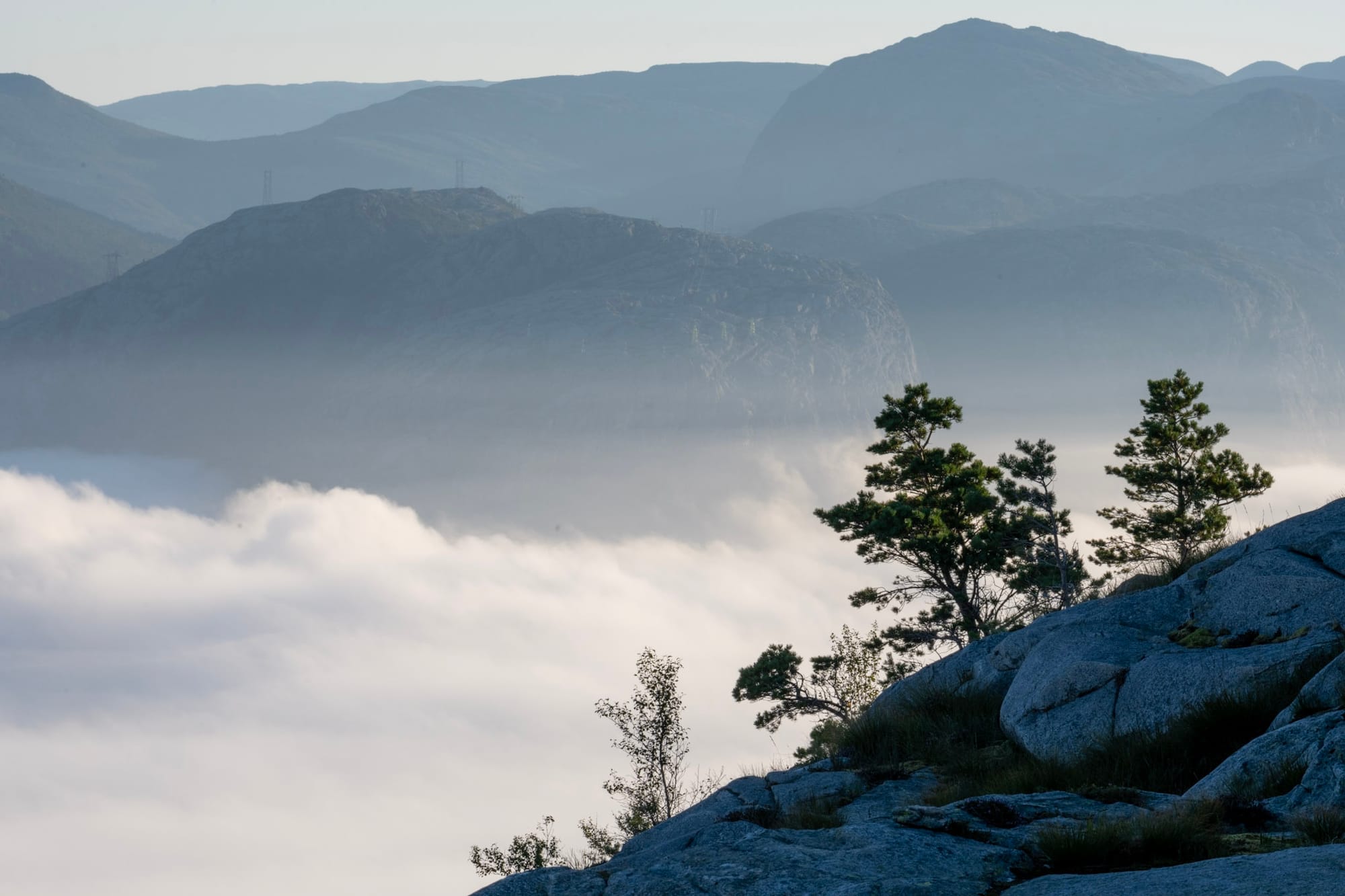 An dem See füllen wir die Trinkblase mit dem stark nach Eisen schmeckenden Wasser und machen uns auf den Weg zurück zum Auto. Die Camper am Parkplatz sind gedämpfter Stimmung, ihre morgendliche Aussicht ließ im Vergleich zu unserer zu wünschen übrig. Auf dem Weg zurück zur Lysefjordbrücke liegt das Wasser bleiern unter den durch den Hochnebel wie abgeschnittenen Bergen da.