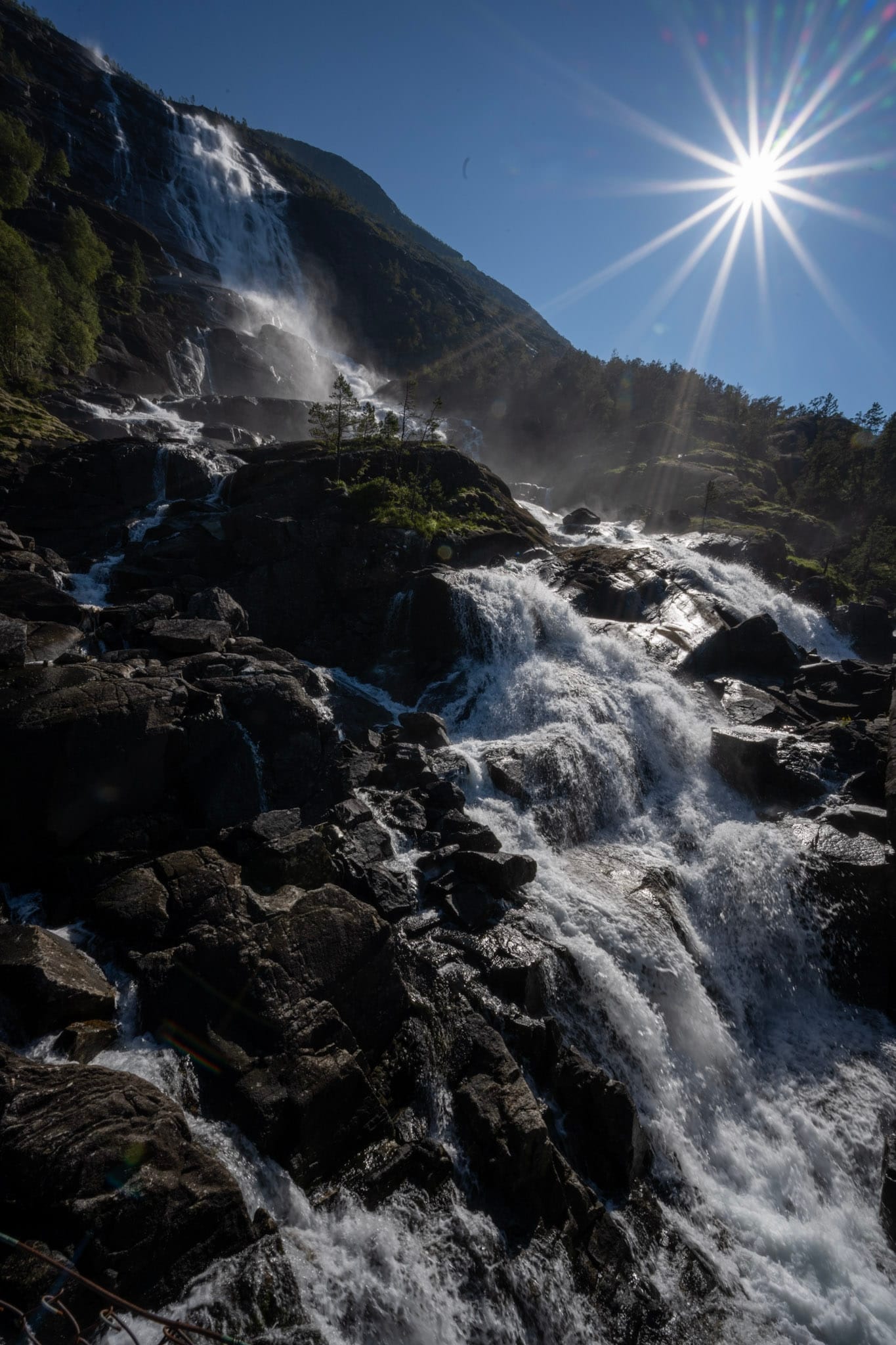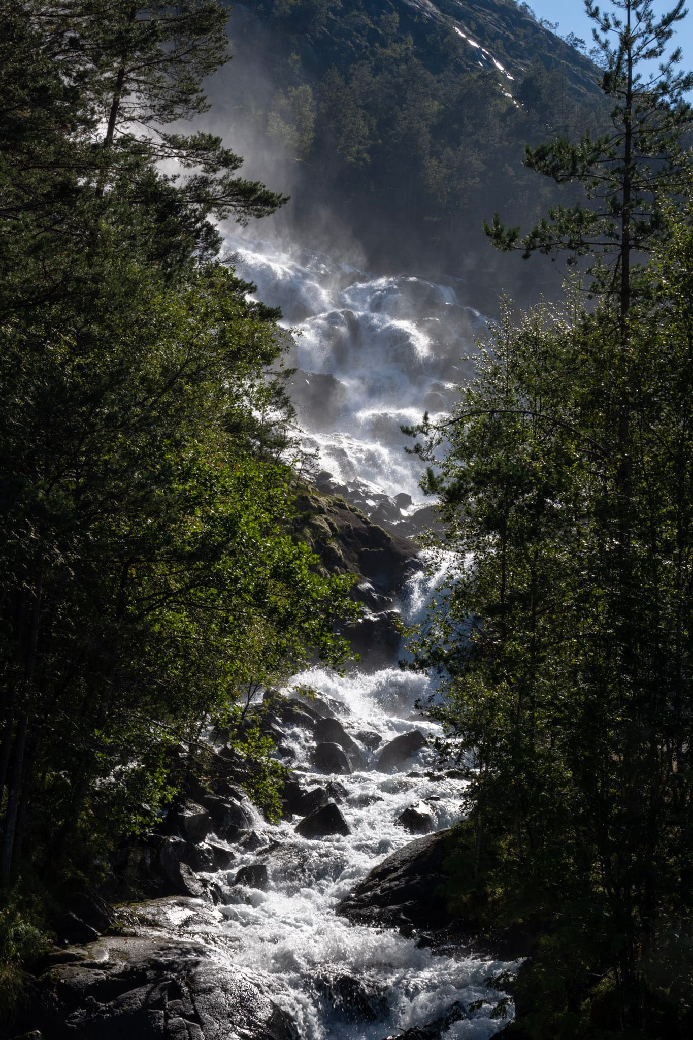 Kurz vor Etne verlassen wir einen Tunnel und wundern uns über die 50-Begrenzung, da passieren wir einen direkt neben der Straße zu Tal donnernden Wasserfall, den Langfossen. Wir halten an und bewundern von unten den sich in zahlreiche Kaskaden aufteilenden Strom. Man kann auch bis aufs Plateau wandern, aber dafür bleibt heute keine Zeit, nach einem Hot Dog an der Tankstelle in Etne geht es weiter zum Ziel. Über einen bewaldeten Pass fahren wir mit einem Zwischenstop beim Joker in Skarsmo über ein zunächst tief eingeschnittenes Flusstal im goldenen Nachmittagslicht Richtung Odda, ständig neue große und kleine Wasserfälle kommen vom Folgefonna auf unserer linken und der Hardangervidda auf der rechten Seite hinzu, bis das Tal sich etwas öffnet und der Fluss einen langgezogenen See bildet, den wir zunächst für einen Fjord halten; erst im Mittagslicht am folgenden Tag werden wir die verräterisch knallblaue Farbe des Gewässers sehen und auf der Karte feststellen, dass der Fjord erst hinter Odda beginnt.