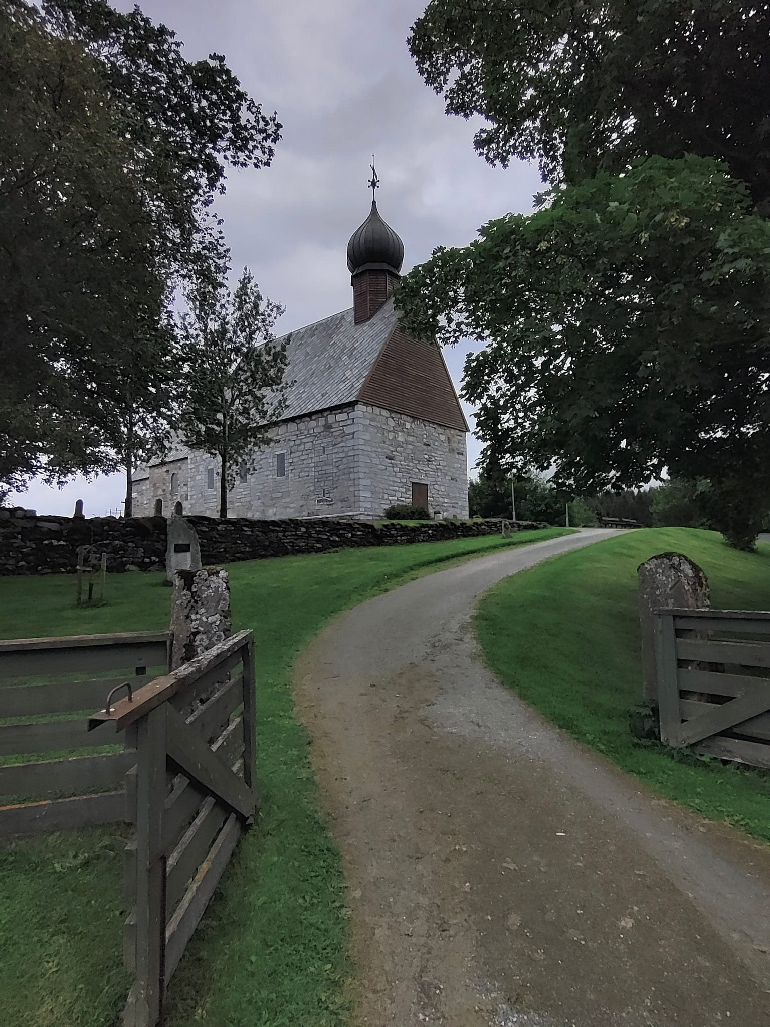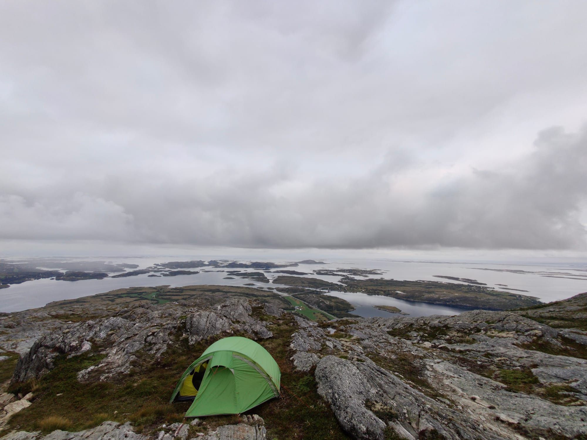 Auf Dønna führt uns die Straße zunächst über zahllose kleine Brückchen, Buchten und Inselchen und da wir noch Zeit haben, machen wir noch eine kleine Rundfahrt über die Insel, machen Fotos und besichtigen eine Steinkirche aus dem 12. Jahrhundert. Der Dønnamannen, der höchste und imposanteste Berg der Insel, den Heiko gern gegangen wäre, hüllt sich in eine Regenwolke, so dass wir statt dessen auf dem Akvikfjellet übernachten, eine mit weniger als 300 Höhenmetern bescheidene keilförmige Anhöhe. Der Himmel hat sich stark bewölkt, es ist düster und hin und wieder werden wir von den Regenwolken des Dønnamannen angesprüht, aber das Wetter hält und wir können in Ruhe einen Zeltplatz suchen. Wir haben einen weiten Blick über die Inseln und können erneut beobachten, wie im Laufe des Abends die Lichter in den Häusern und Schiffen als kleine, helle Punkte erscheinen. Auch die Brücken scheinen von unten beleuchtet zu sein.