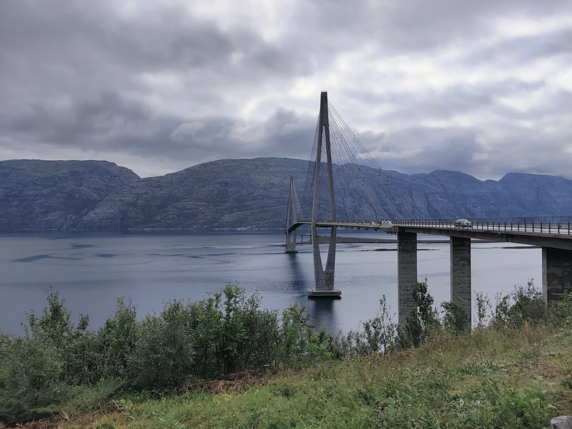 Bevor wir die Gegend verlassen, will ich einmal auf die Helgelandsbrua gehen; die Brücke fasziniert mich, schon seit ich sie am ersten Abend vom Reinesaksla, später nachts dann auch schön beleuchtet, gesehen habe.