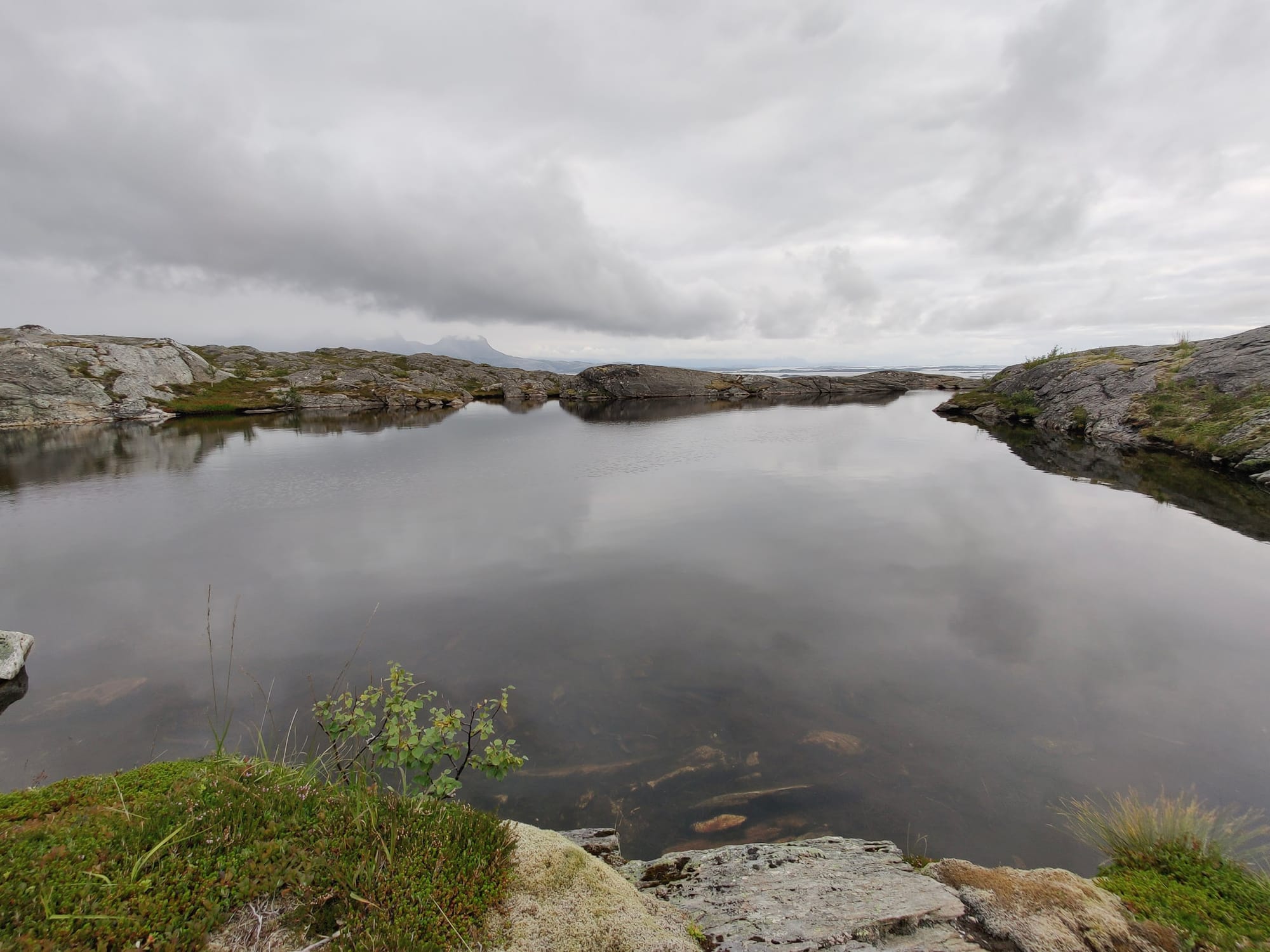 Morgens auf dem Kvasstind ist es bedeckt, aber der Wetterbericht hat Wort gehalten und es ist über Nacht trocken geblieben, so dass ich die Sorge über nasse, schräge Granitfelsen von der Liste streichen kann. Wir frühstücken Brot mit Marmelade und machen uns dann an den Abstieg, der erstaunlich angenehm ist. Schnell stehen wir wieder auf dem Feldweg und marschieren den letzten Kilometer zum Auto.