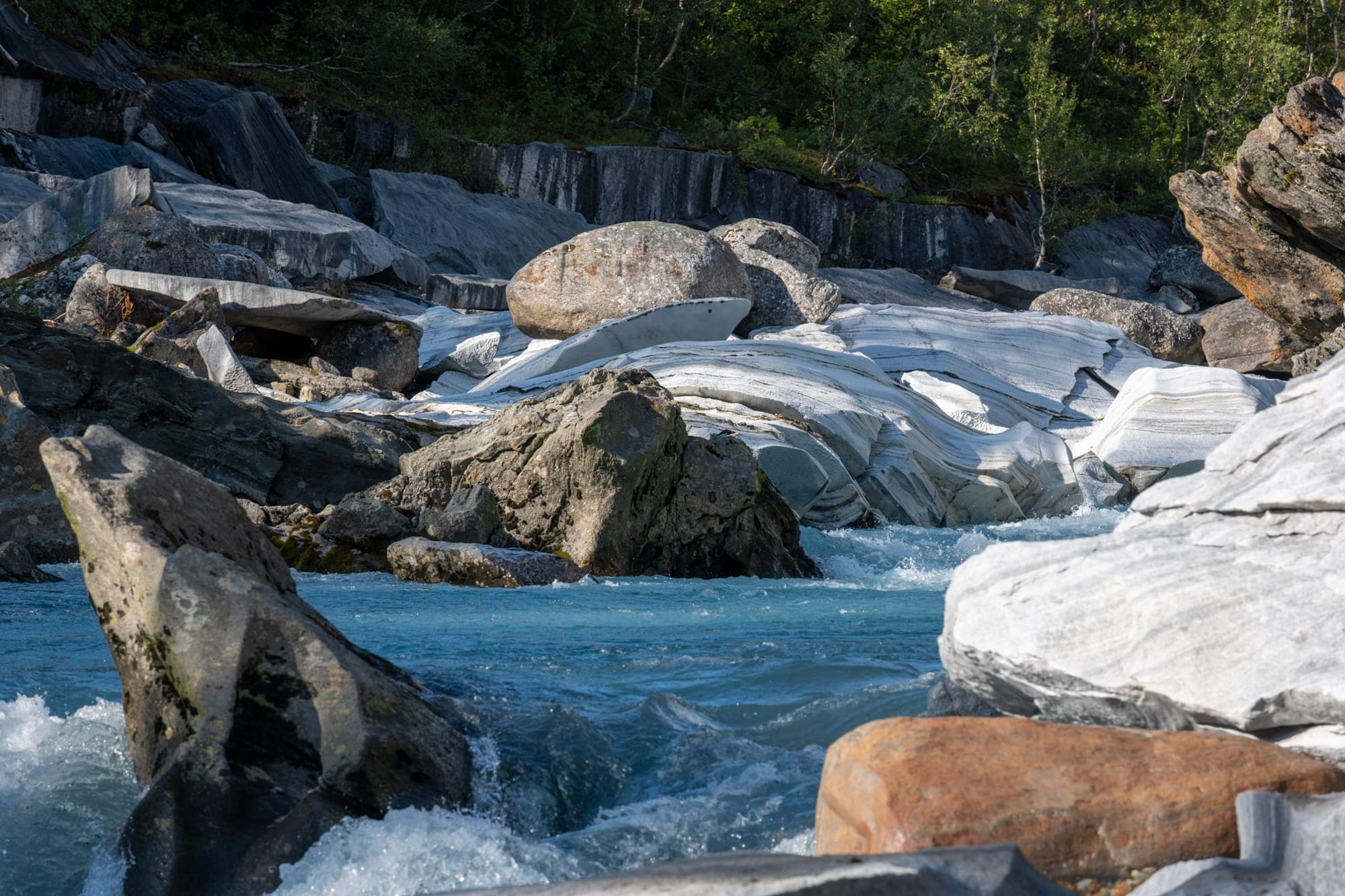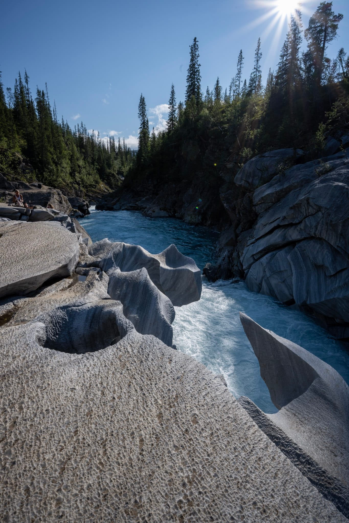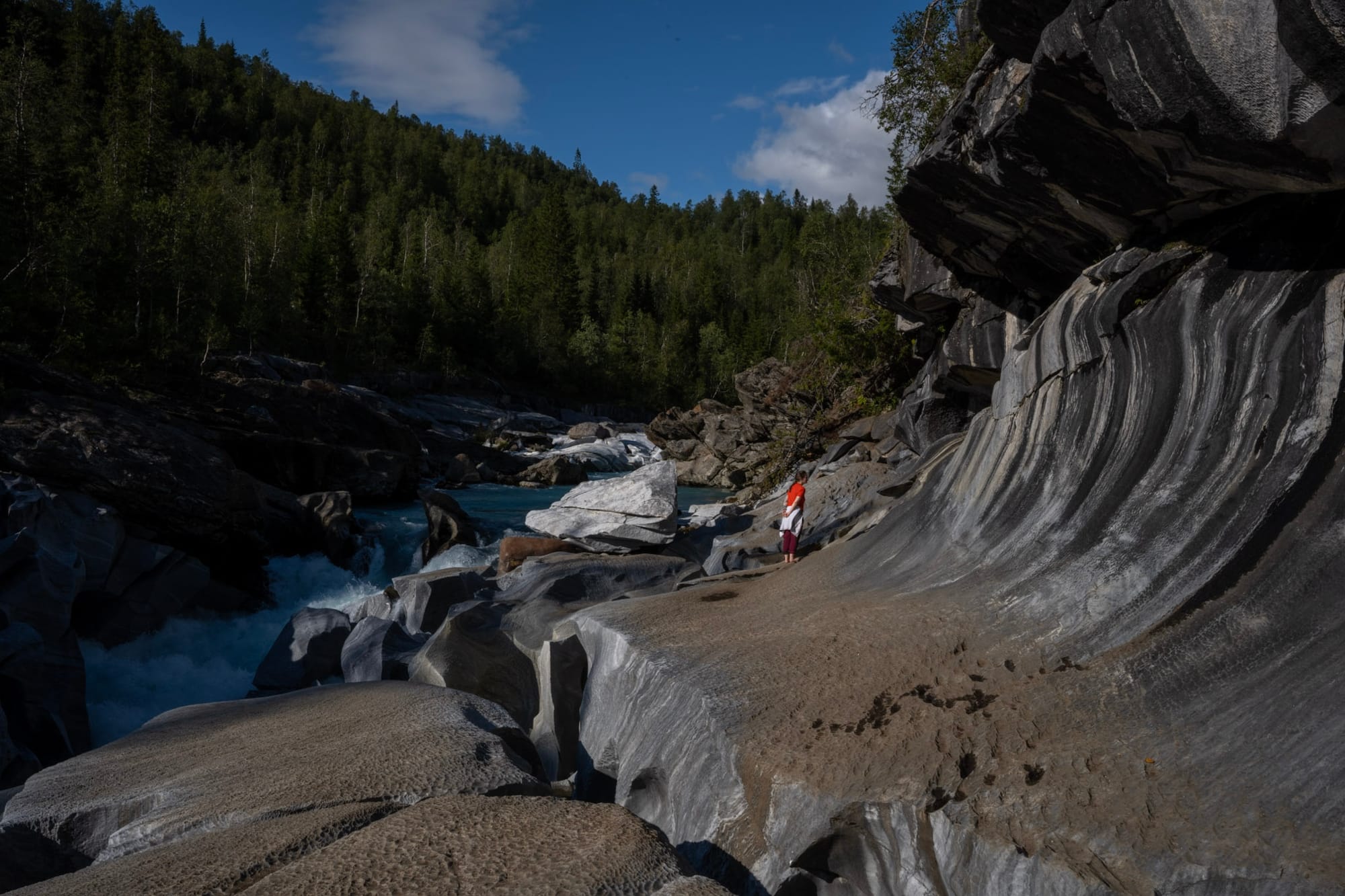 Hinter dem See führt uns eine Schotterstraße an einigen Bauernhöfen vorbei in den Wald und endet an einem Parkplatz in Fisktjonna. Von dort aus machen wir uns zu Fuß auf den Weg zum “Marmorschloss”: Der Gletscherfluss Glomaga bahnt sich seinen Weg durch eine Marmorader und hat dabei natürliche Skulpturen geschaffen. Der Weg führt erst idyllisch durch den Wald und ein entgegenkommendes Paar warnt uns, dass das letzte Stück steil sei und wir vorsichtig sein sollen. “Sie hatte schon so ein säuerliches Gesicht dabei”, meint Heiko, und als wir an der Stelle ankommen, bin ich es, die sein säuerliches Gesicht macht: der Abstieg ist in der Tat steil, das Erdreich zum Teil schon wegerodiert, hin und wieder hängen ein paar Seile in der Landschaft. So kann ich mich zunächst nicht entschließen und schicke Heiko alleine vor. Erst ein paar Minuten später, als er schon längst um eine Kurve verschwunden ist, wird es mir zu blöd und ich arbeite mich leise schimpfend den Abhang hinunter. Am Ufer geht es dann noch über ein paar Blöcke und dann stehe ich mitten in der wilden Marmorlandschaft. Der Fluss donnert und die Sonne glitzert auf dem Gestein. Selbst die flachen Marmorblöcke sind vom Wasser geformt und von tausenden kleiner Dellen überzogen; da wir die Schuhe ausziehen, um den Abrieb auf dem Gestein zu reduzieren, spüren wir sie ganz genau unter den nackten Füßen.