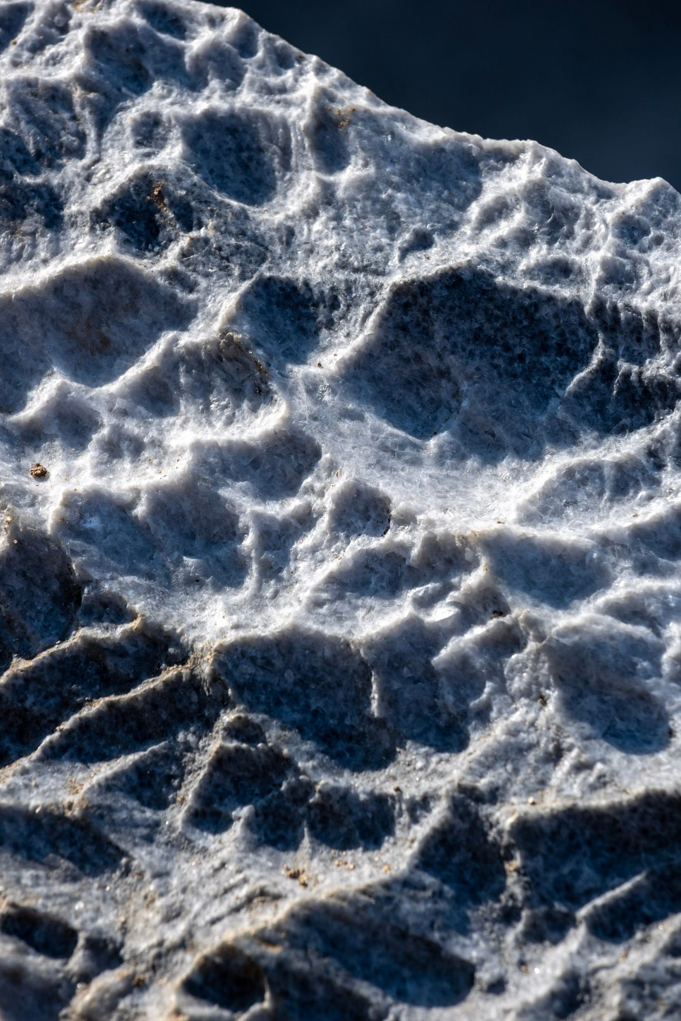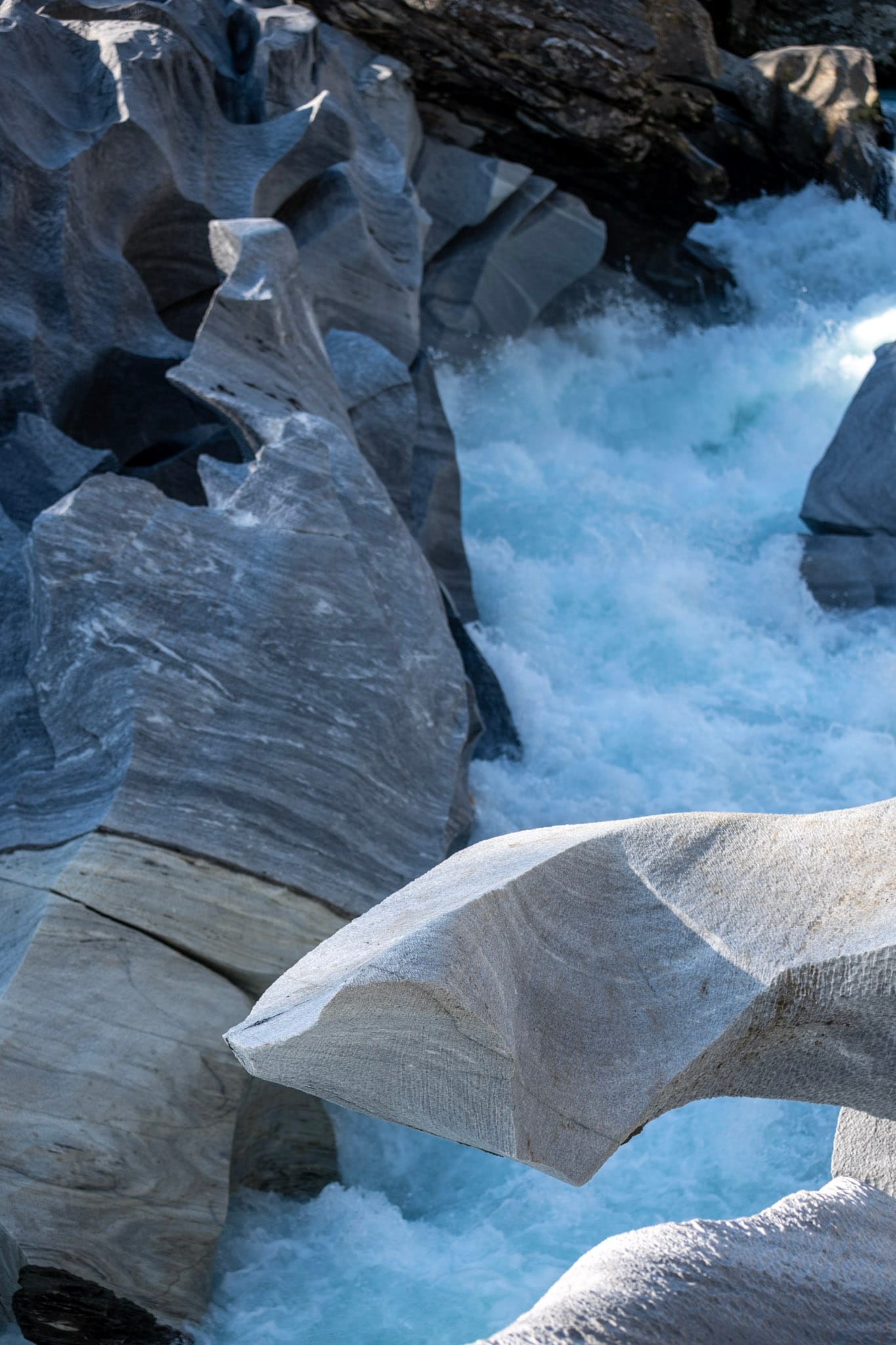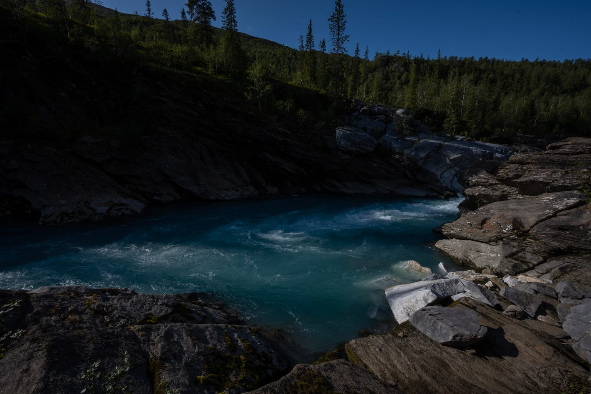 Hinter dem See führt uns eine Schotterstraße an einigen Bauernhöfen vorbei in den Wald und endet an einem Parkplatz in Fisktjonna. Von dort aus machen wir uns zu Fuß auf den Weg zum “Marmorschloss”: Der Gletscherfluss Glomaga bahnt sich seinen Weg durch eine Marmorader und hat dabei natürliche Skulpturen geschaffen. Der Weg führt erst idyllisch durch den Wald und ein entgegenkommendes Paar warnt uns, dass das letzte Stück steil sei und wir vorsichtig sein sollen. “Sie hatte schon so ein säuerliches Gesicht dabei”, meint Heiko, und als wir an der Stelle ankommen, bin ich es, die sein säuerliches Gesicht macht: der Abstieg ist in der Tat steil, das Erdreich zum Teil schon wegerodiert, hin und wieder hängen ein paar Seile in der Landschaft. So kann ich mich zunächst nicht entschließen und schicke Heiko alleine vor. Erst ein paar Minuten später, als er schon längst um eine Kurve verschwunden ist, wird es mir zu blöd und ich arbeite mich leise schimpfend den Abhang hinunter. Am Ufer geht es dann noch über ein paar Blöcke und dann stehe ich mitten in der wilden Marmorlandschaft. Der Fluss donnert und die Sonne glitzert auf dem Gestein. Selbst die flachen Marmorblöcke sind vom Wasser geformt und von tausenden kleiner Dellen überzogen; da wir die Schuhe ausziehen, um den Abrieb auf dem Gestein zu reduzieren, spüren wir sie ganz genau unter den nackten Füßen.