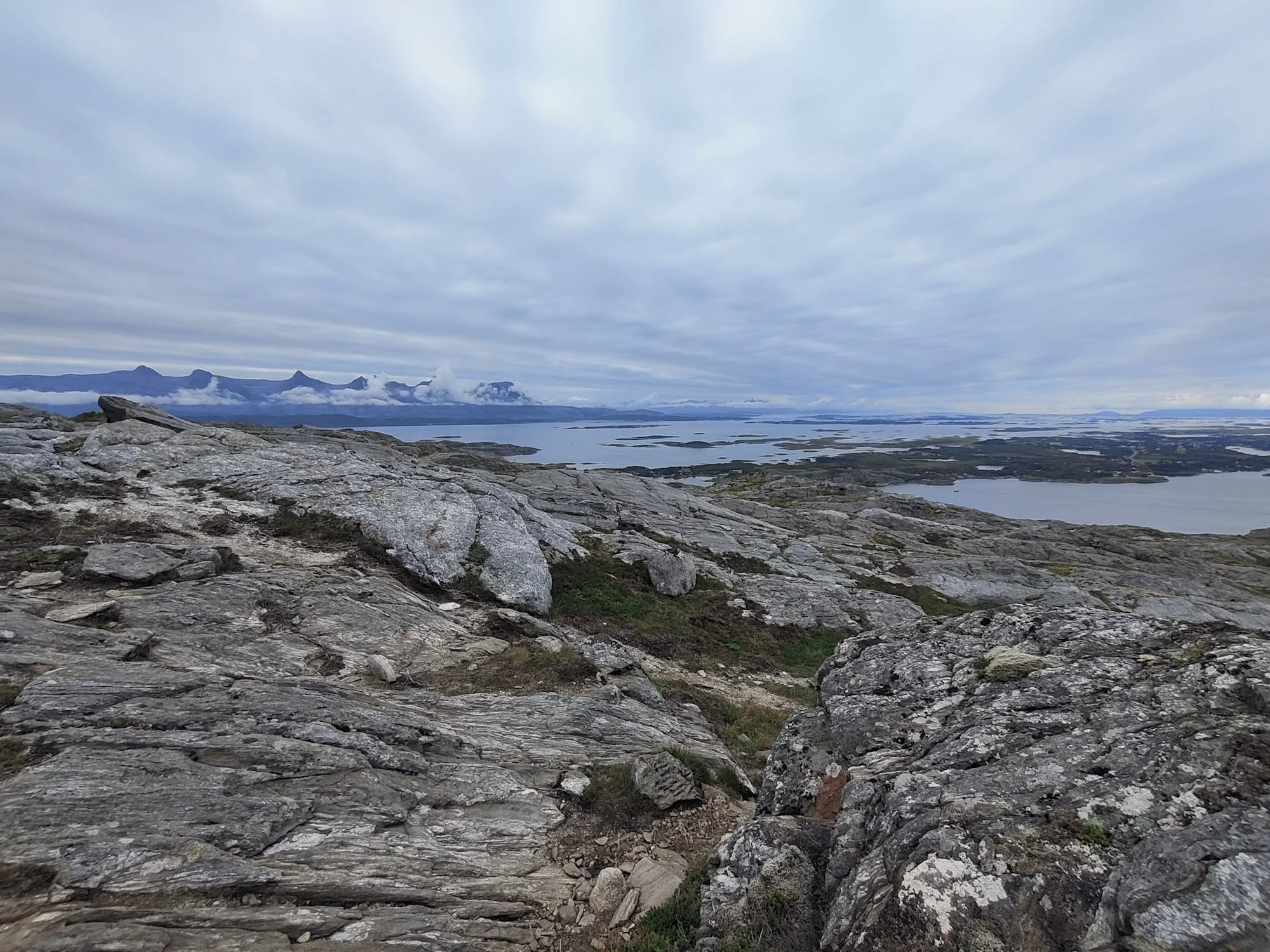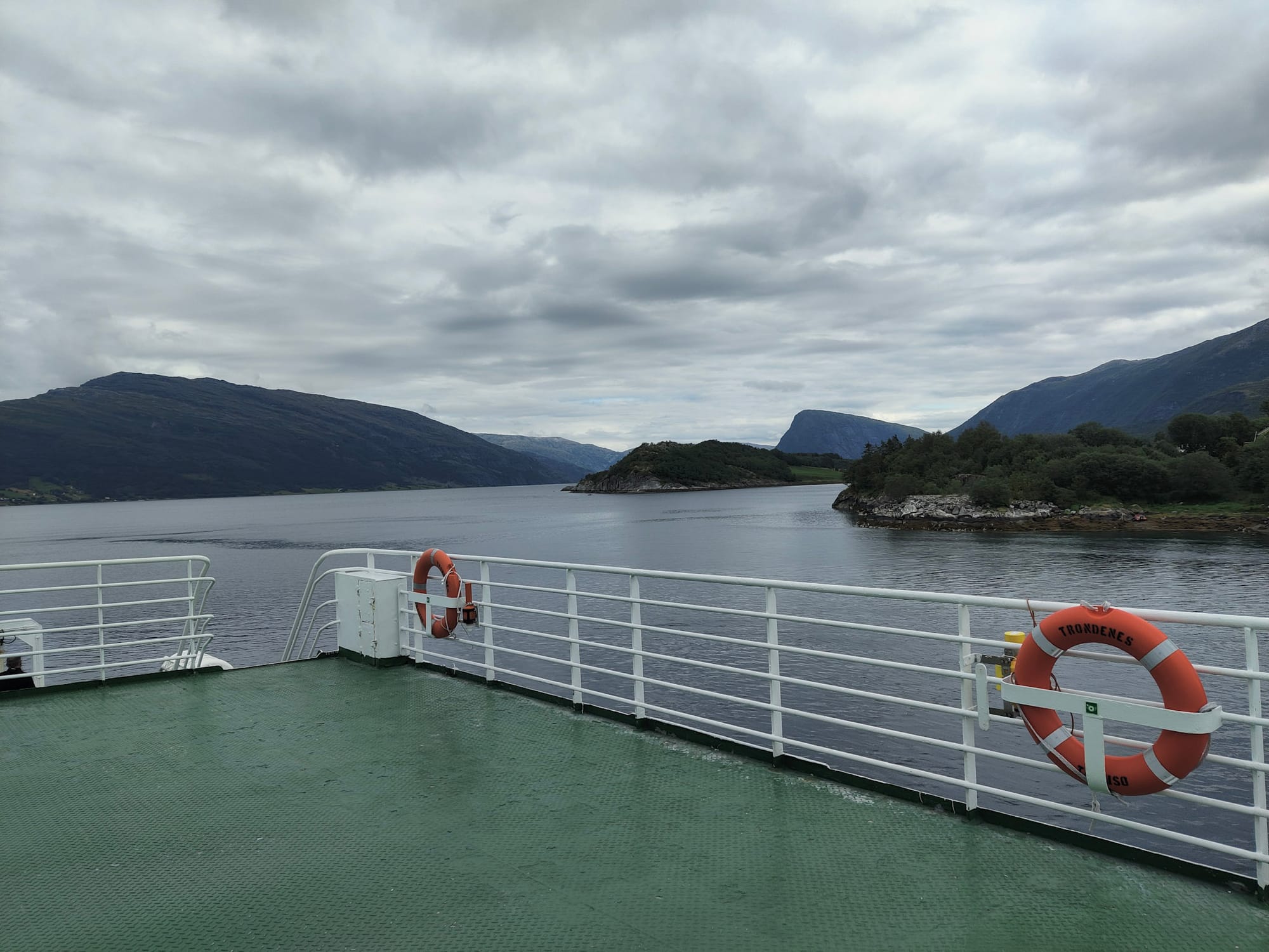 Morgens ist es bedeckt, aber mit deutlich besserer Fernsicht als gestern und so genießen wir beim Zähneputzen das Panorama. Als wir nach dem gemütlichen Abstieg, belohnt von Himbeeren, beim Auto ankommen, stelle ich fest, dass wir, wenn wir schnell sind, die nächste Fähre von Björn nach Sandnessjoen noch bekommen und so ziehen wir uns in aller Eile um und machen uns bei spektakulären Aussichten auf den Weg. Mit reichlich zeitlichem Puffer kommen wir am Fährhafen an, wo sich neben Touristen noch eine oder mehrere Schulklassen tummeln.