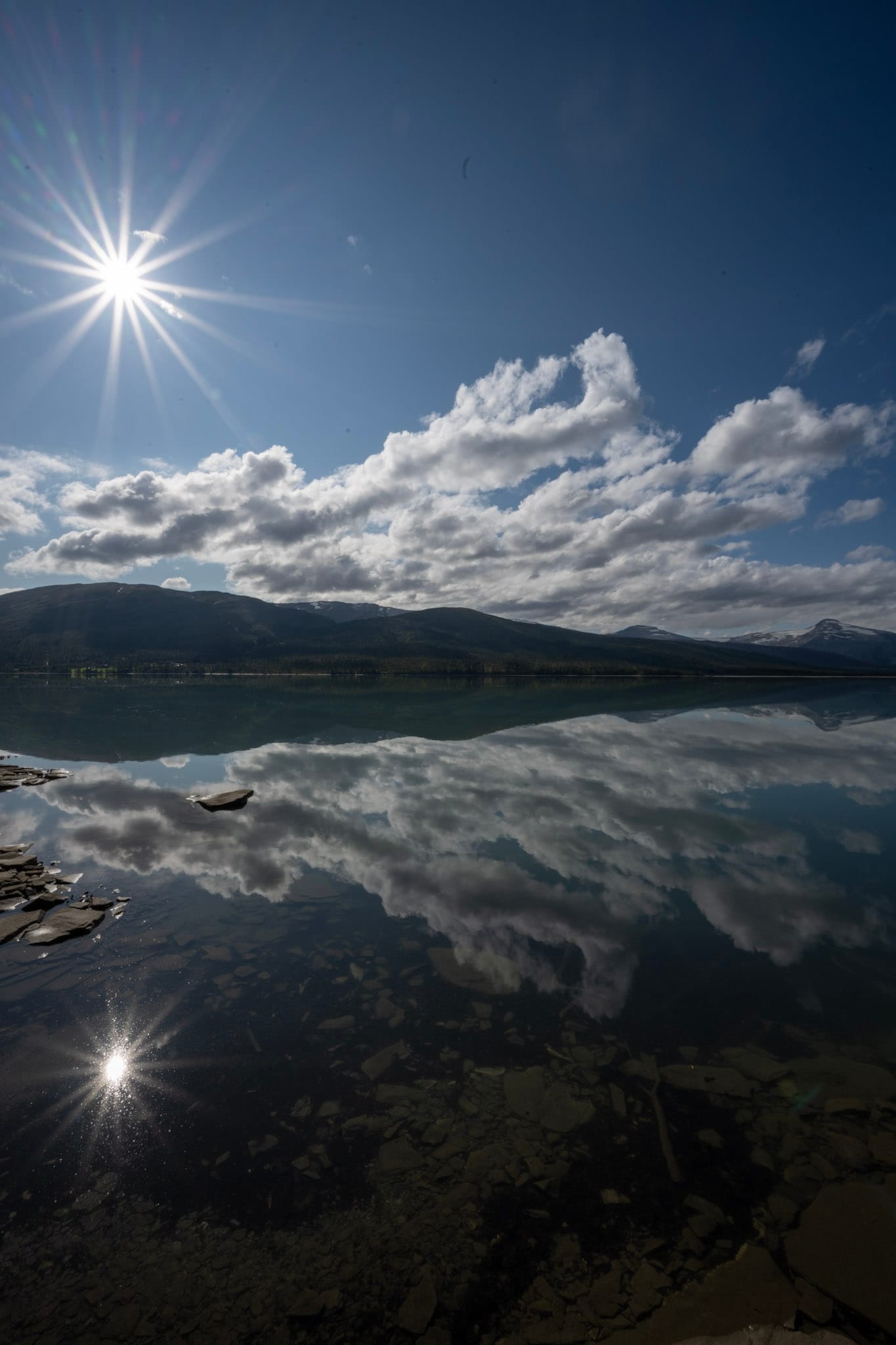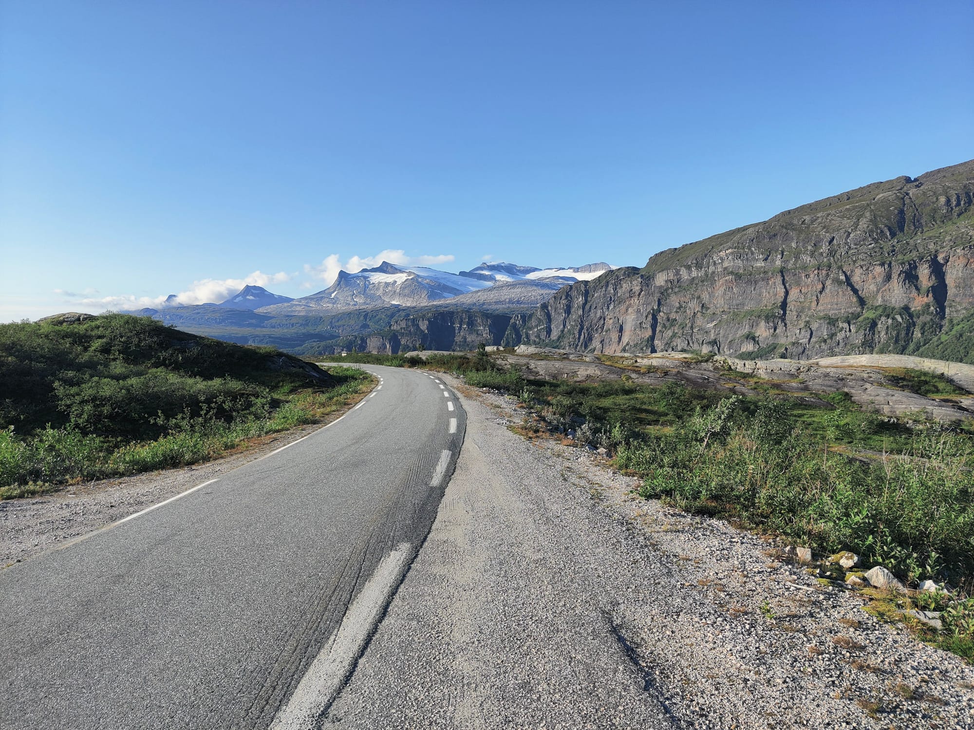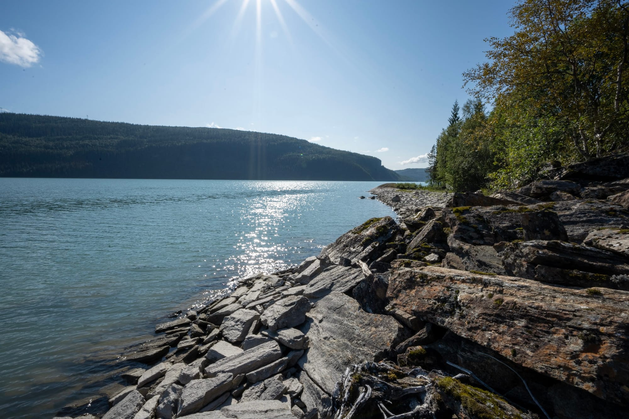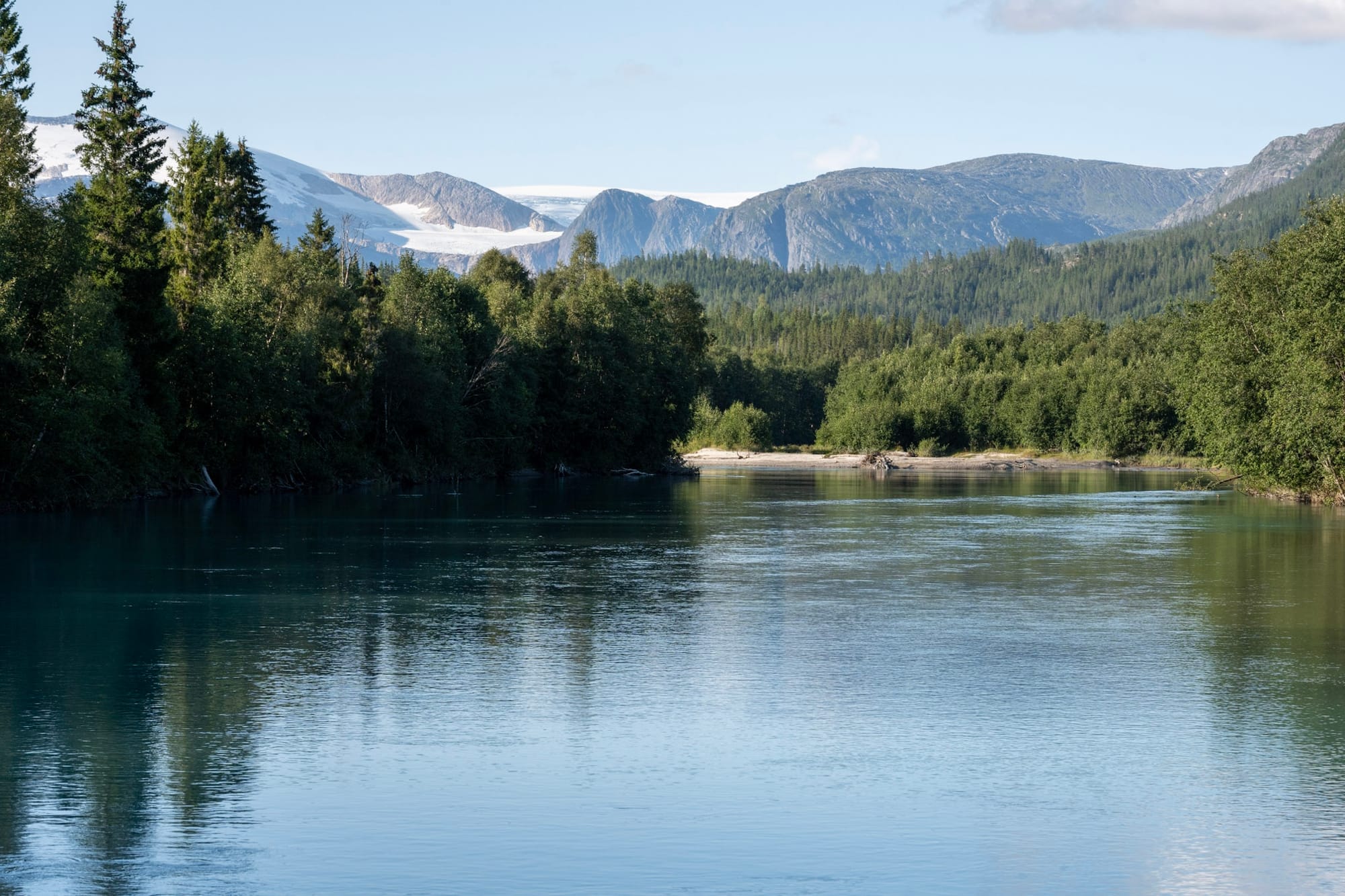 Die Straße führt hoch am Hang entlang und wir haben einen Blick auf die hohen, vergletscherten Berge des Svartisen Nationalparks auf der anderen Seite - kalt und uneinnehmbar sehen sie aus. Aber das Wetter wird immer schöner. Hinter Mo i Rana fahren wir im strahlenden Sonnenschein endlos den Langvatnet entlang, einen türkisblauen See, der von den Abflüssen des Svartisen-Gletschers gespeist wird. Das eisblaue Wasser, die Nadelwälder links und rechts und die schneebedeckten Berge im Hintergrund, all das lässt mich an Kanada denken. Das Geröll und die Felsen am Ufer sind kalkweiß von den Mineralien, die das Gletscherwasser mit sich führt.
