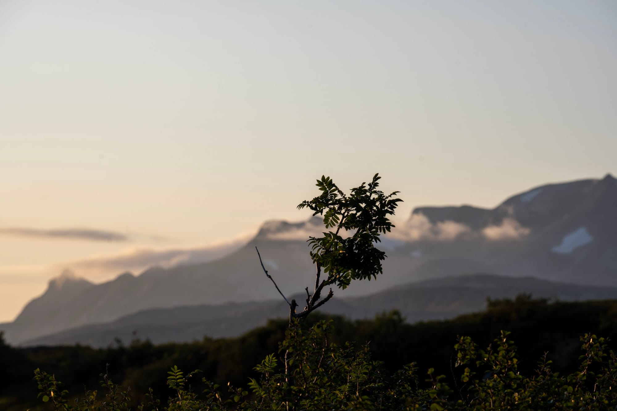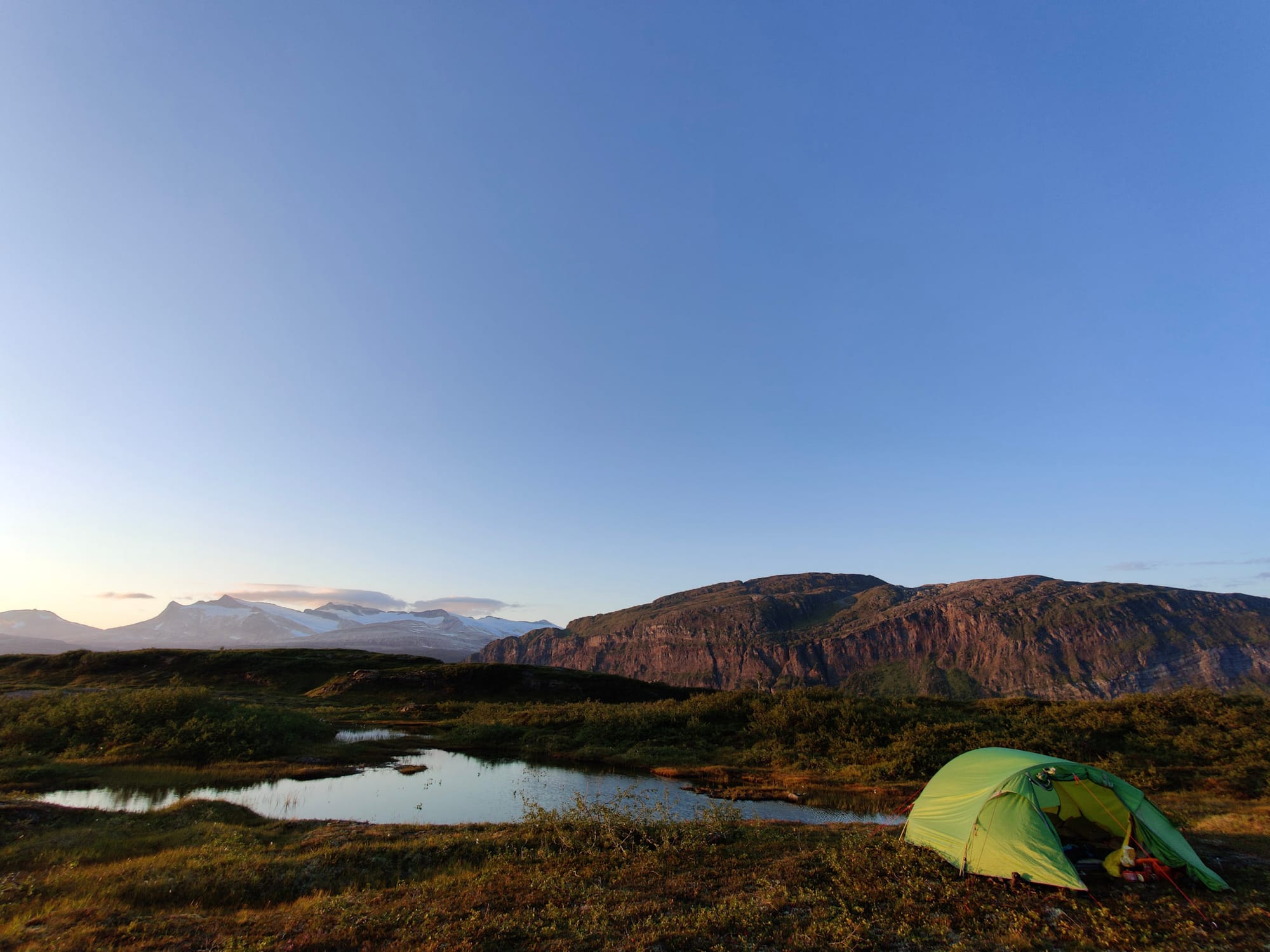 Auf der Hochebene, zwischen den schroffen Bergen südlich und dem Svartisengletscher nördlich, finden wir problemlos einen schönen Zeltplatz zwischen blühender Heide und Tümpeln. Mit mehr als ein bisschen Wehmut genießen wir unseren letzten Tag, denn auch wenn es heute noch nicht danach aussieht, über Nacht wird uns ein sehr fruchtbares und ausgedehntes Tiefdruckgebiet erreichen, dem wir nicht mehr davonfahren können und da wir im Dauerregen weder wandern noch zelten mögen, werden wir morgen früh, hoffentlich noch vor dem ersten Guss, die Rückfahrt antreten. Es gibt Chili sin Carne und als es, spät aber doch, dämmrig wird, legen wir uns schlafen.