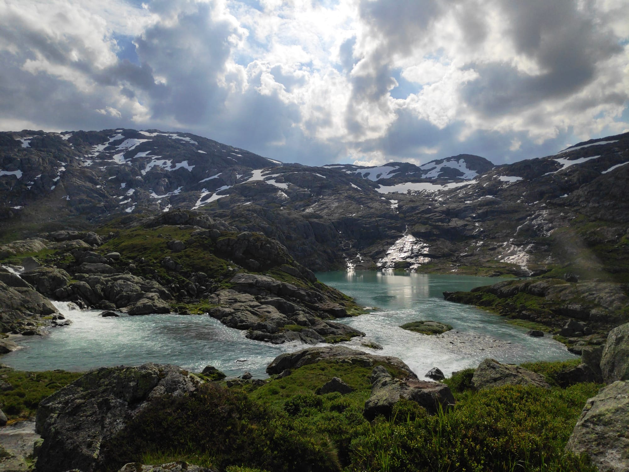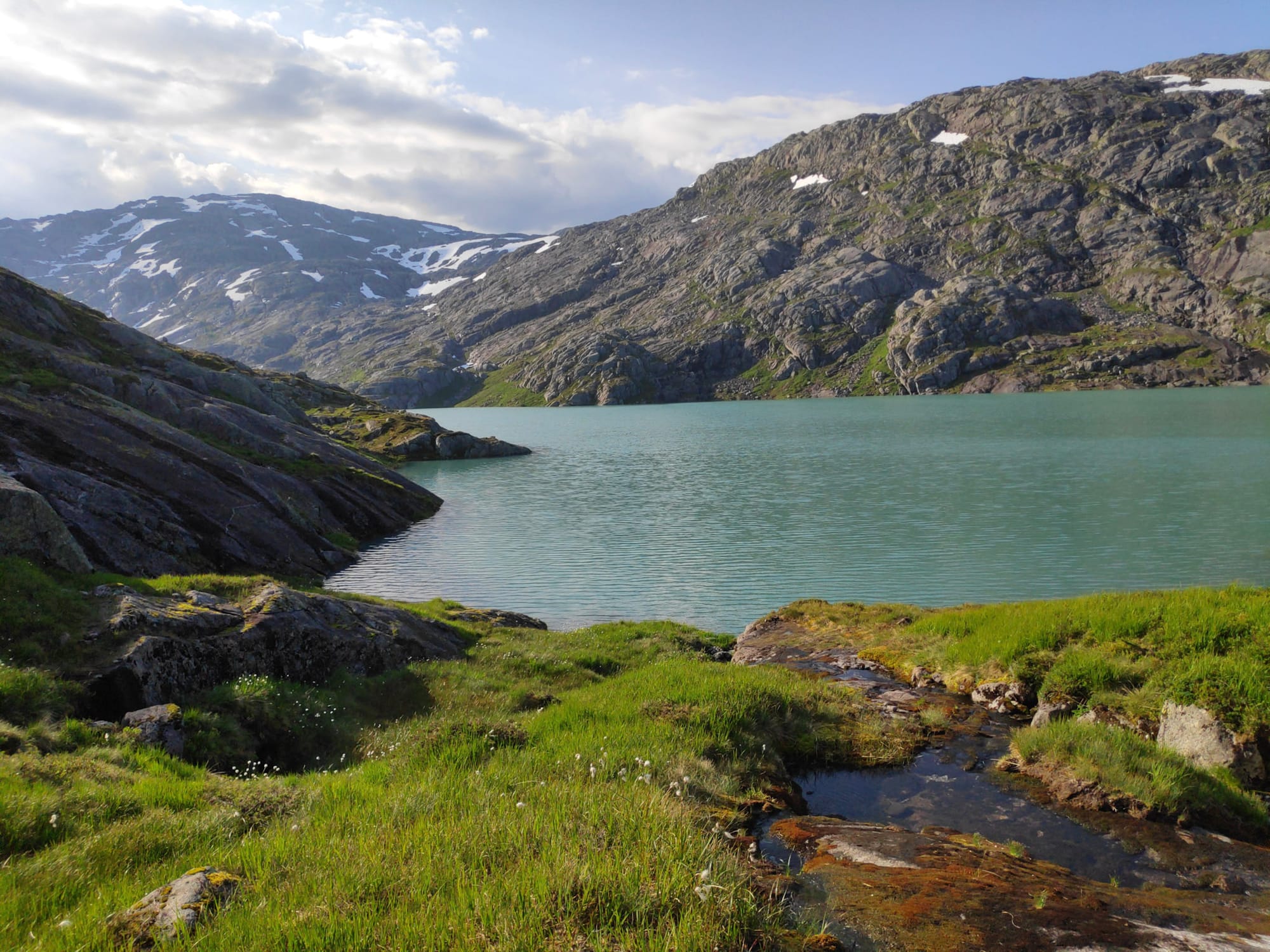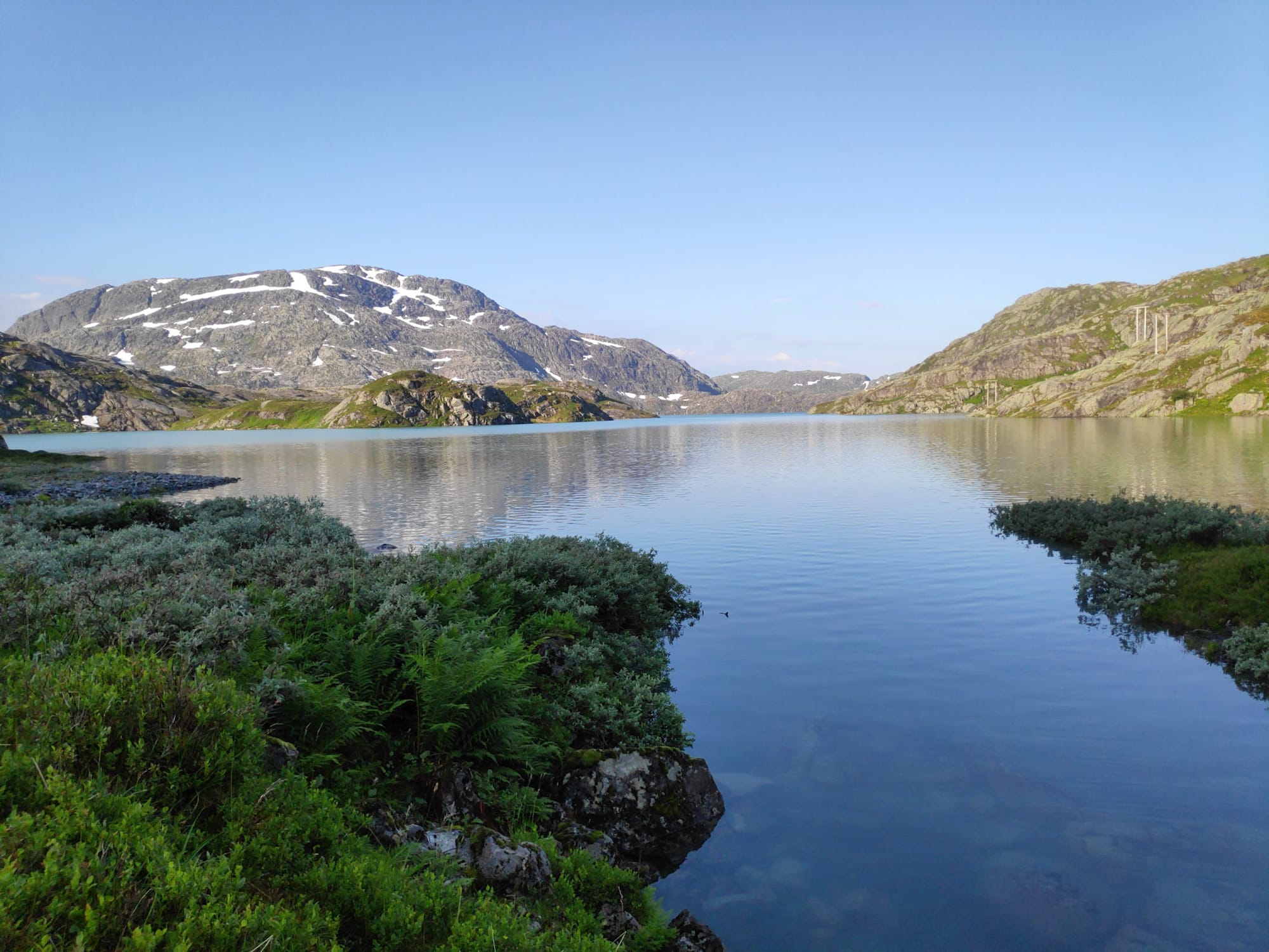 Der Rückweg zieht sich hin; kaum sind wir über die erste Anhöhe, brennt die Sonne wieder und die hundert Höhenmeter auf den Hügel, auf dem das Zelt steht, sind zäh, so dass Heiko mir bescheidet, ich möge "mich unter den Stein setzen und einen Apfel essen", während er das Zelt abbaut. Mittlerweile hat sich der Himmel zugezogen und es fallen sogar ein paar Tropfen, was mich erneut in Besorgnis versetzt, dass der Untergrund glatt und rutschig werden könnte, aber dafür ist es nicht genug Regen. So schlängeln wir uns zurück über die kleine Staumauer und die kleine ausgesetzte Stelle am Mosevatnet zurück zum Auto, wobei auf den letzten Metern die Füße schon ordentlich schmerzen.