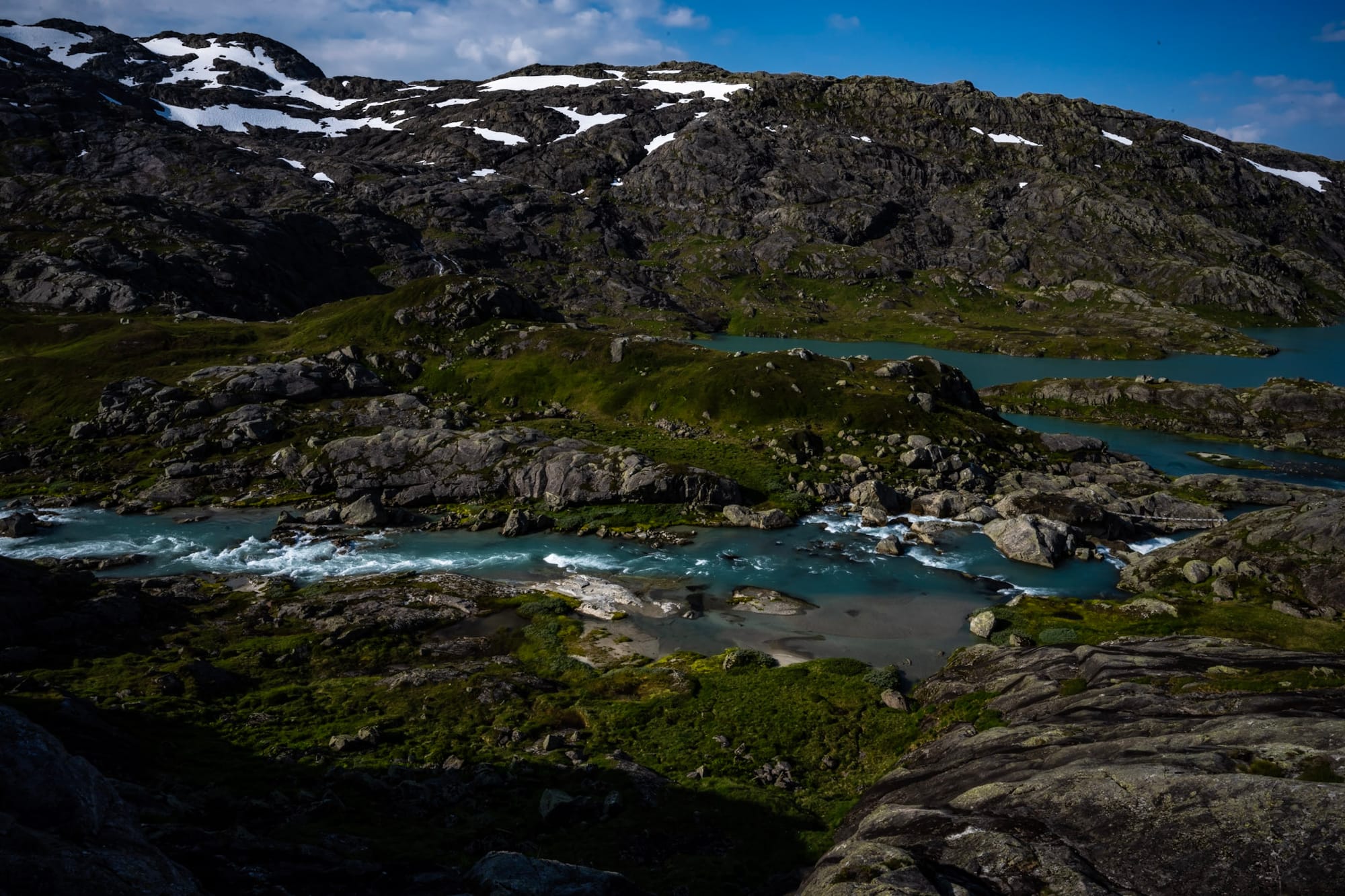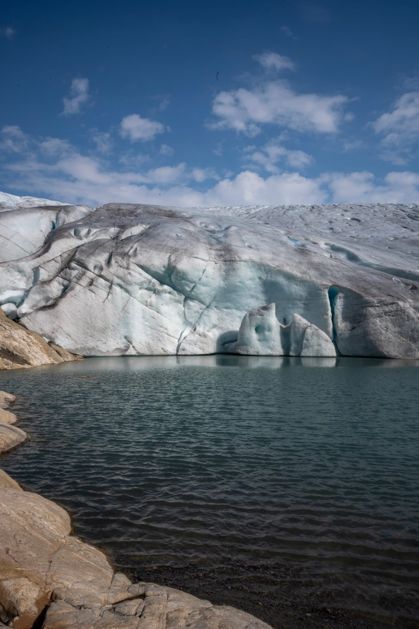 Der Pfad zum Gletscher ist zwar markiert, aber wenig begangen und schlängelt sich zunächst einen steilen Wiesenhang zum Midbotnevatnet hinunter, wo wir über reichlich Geröll staksend einen unsichtbaren Bach kreuzen; hier im Tal haben sich sogar ein paar Weiden ansiedeln können. Der weitere Weg führt über nackten Fels, teilweise mit Ketten gesichert, hin zu dem eisblauen und reißenden Fluss. Alles leuchtet in der Morgensonne und es ist laut; wie laut, merken wir erst auf dem Rückweg, als wir uns wieder von ihm entfernen. Wir wandern durch ein bei aller Felsigkeit liebliches Tal, kleine Wasserläufe kreuzen den Weg, hin und wieder bimmelt hoch am Hang eine Schafsglocke; auf der anderen Seite des Flusses glitzert die weitgefächerte Spur eines Wasserfalls auf dem Fels. Die Sonne glüht, aber zu trinken haben wir reichlich; nur Essen haben wir keines mitgenommen.