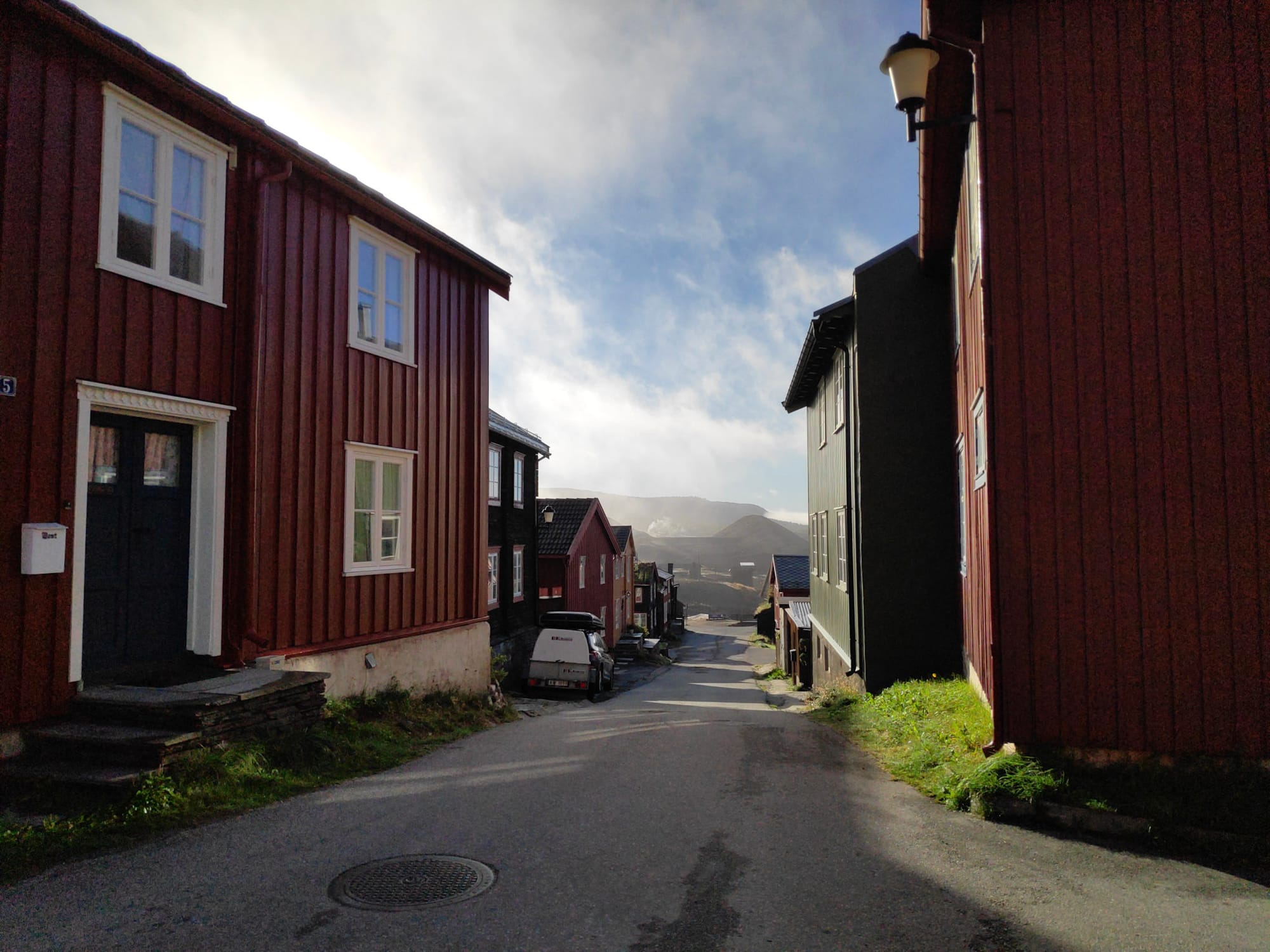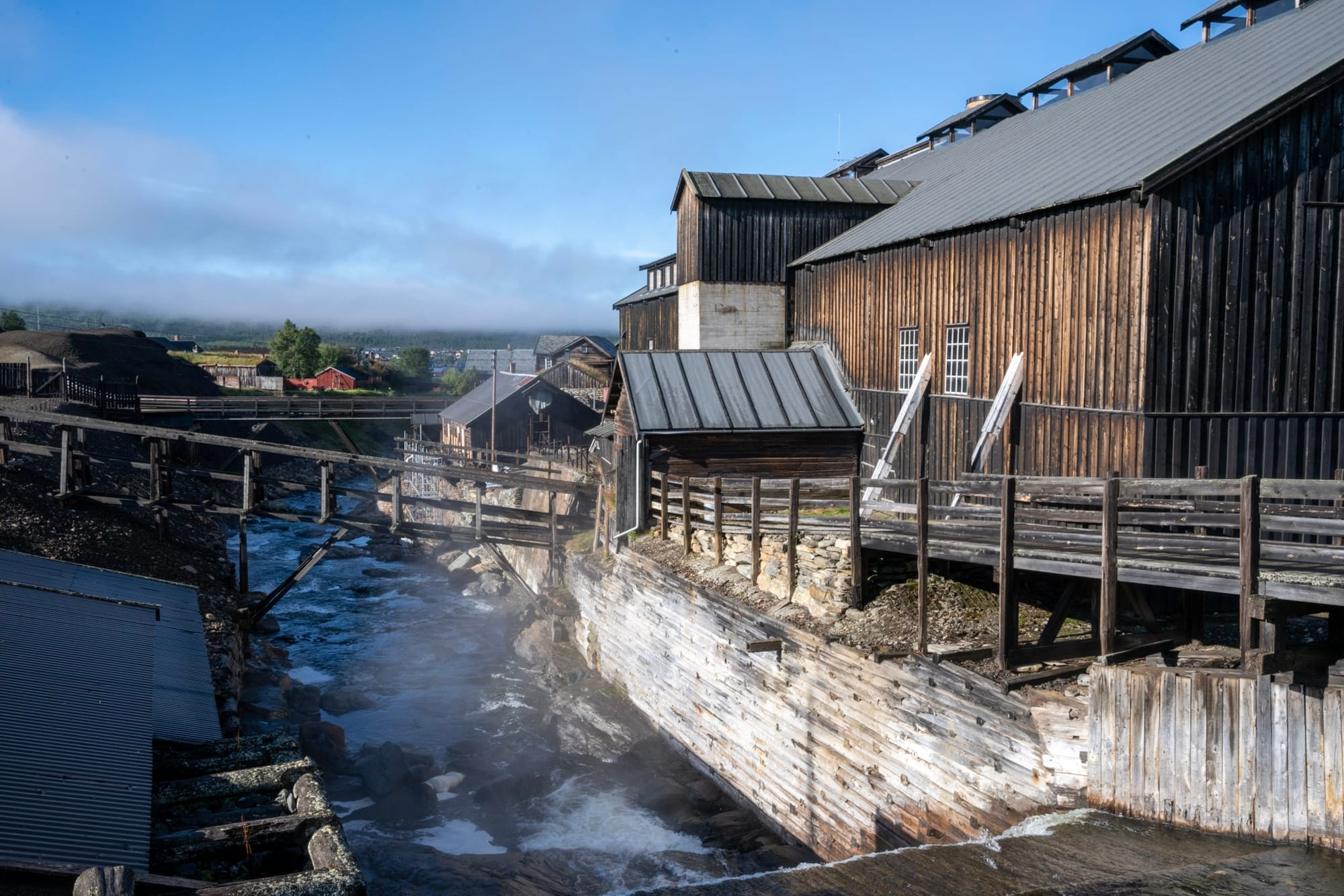 Morgens ist es nach einer frostigen Nacht gleißend weiß vor dem Hotelzimmerfenster; die ganze Stadt liegt im Nebel, aber darüber ist es ein schöner Tag. Während des tollen Frühstücks - mit Waffeln - löst sich der Nebel weitgehend auf und wir machen nach dem Auschecken noch einen Rundgang um die Stadt und auf dem Gelände der alten Kupfermine. Die Brachen mit den aufsteigenden Nebelschwaden erinnern uns an die dampfenden Geothermalgebiete in Island.