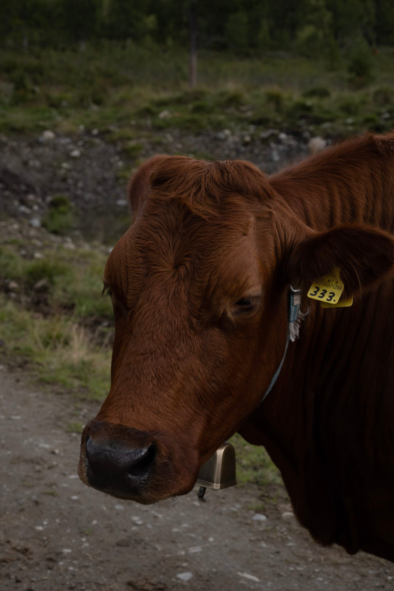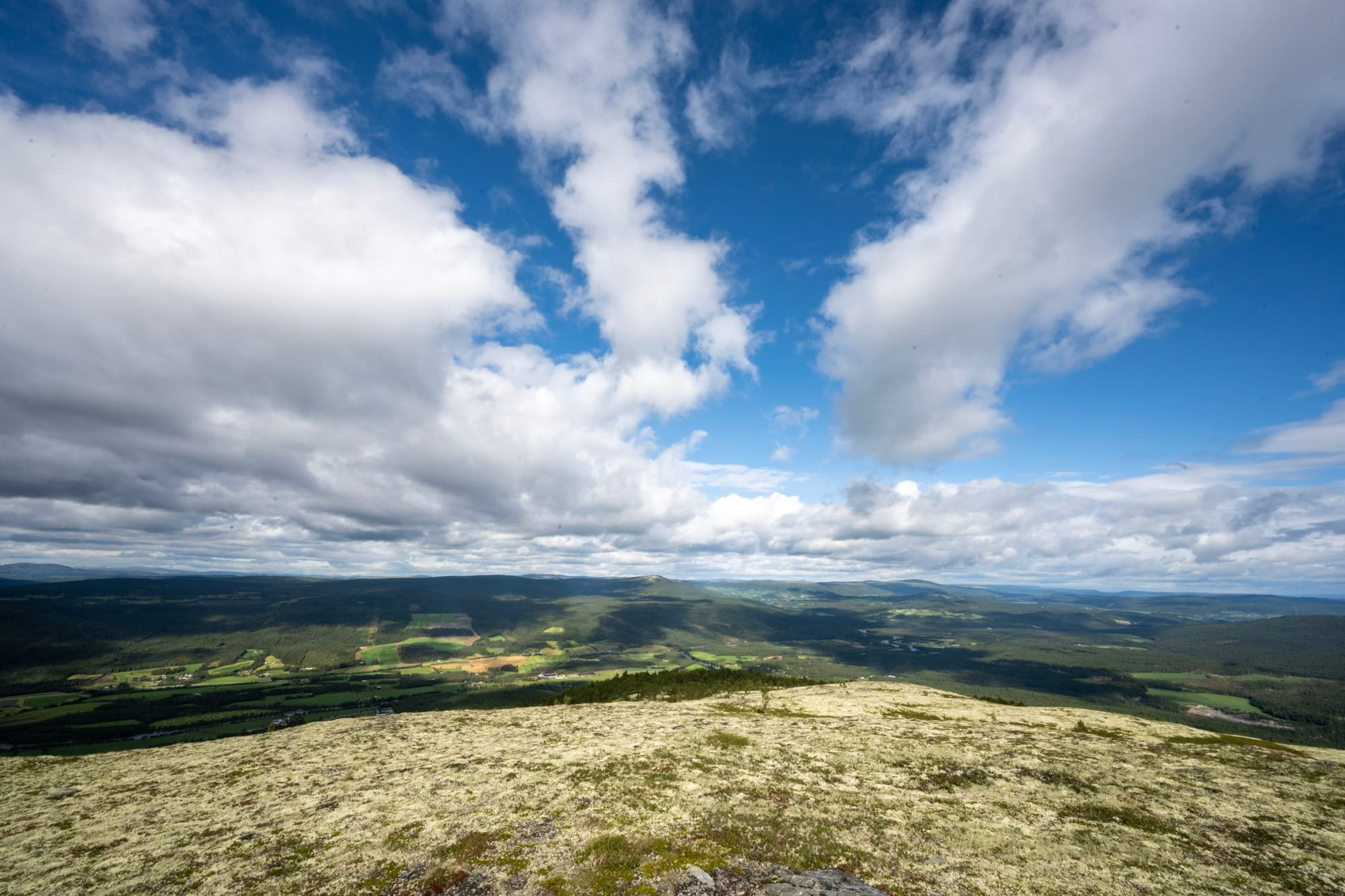 Als wir mit dem Rundgang fertig sind, ist der Himmel strahlend blau und einzelne Berggipfel haben frische Schneekuppen. Hinter Tynset suchen wir uns etwas zum Wandern: von einer bewirtschafteten Alm mit Kühen und Schafen führt ein Pfad zwischen flechtenbewachsenen Birken und niedrigen Wacholderbüschen auf eine nahegelegene Anhöhe, die Mana. Wir haben einen schönen Blick auf die sehr bewaldete Gegend und werden auf dem Rückweg von den Kühen neugierig begutachtet.