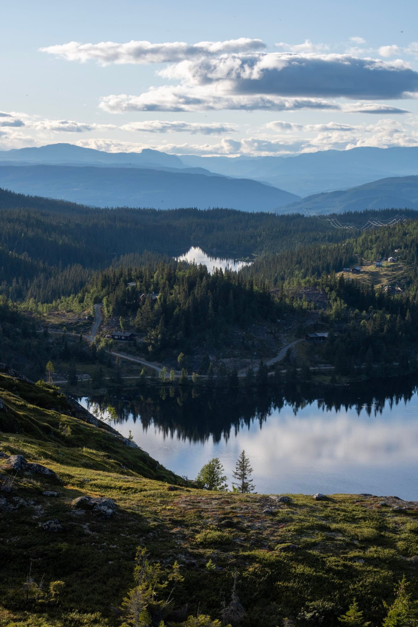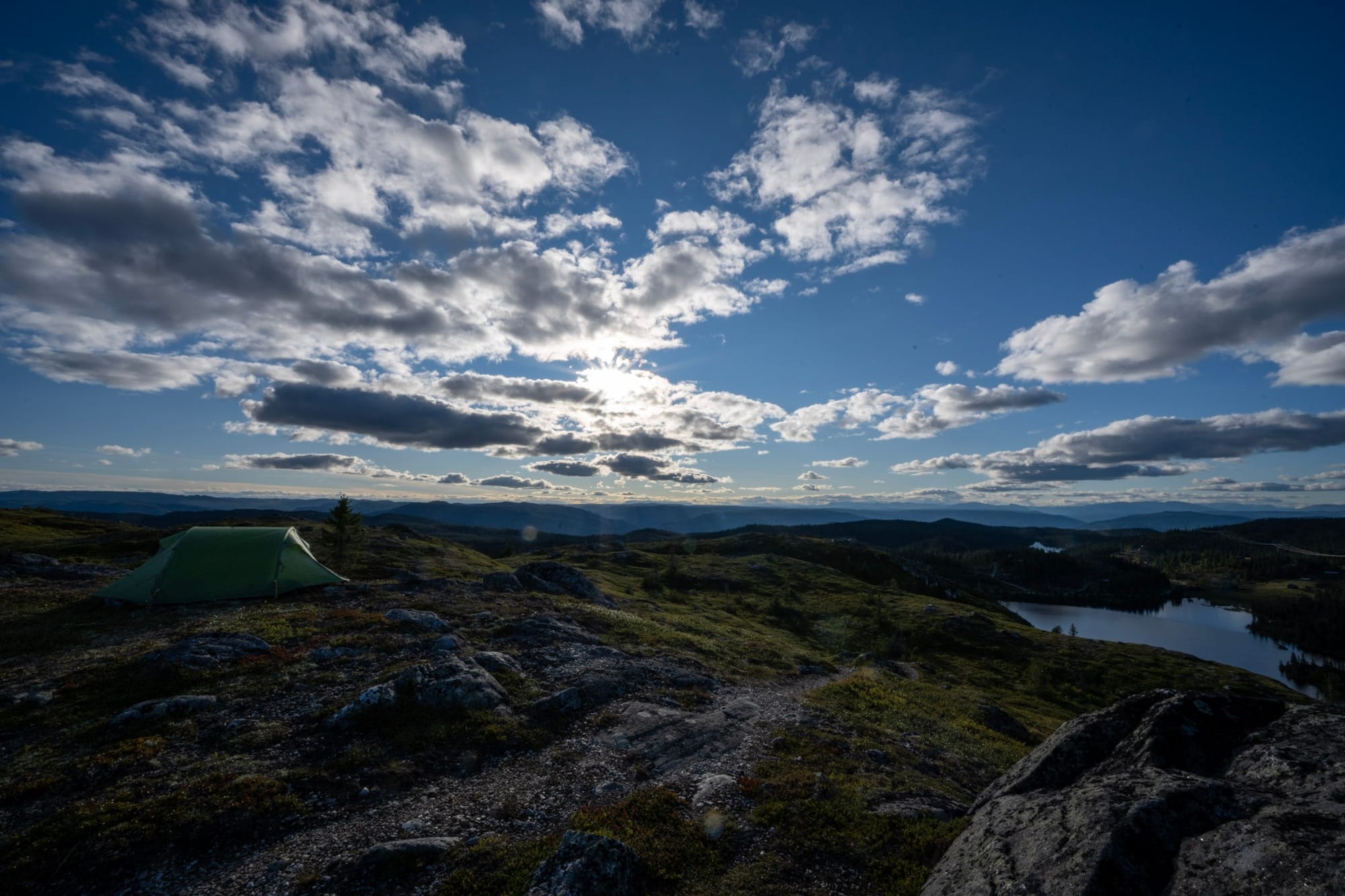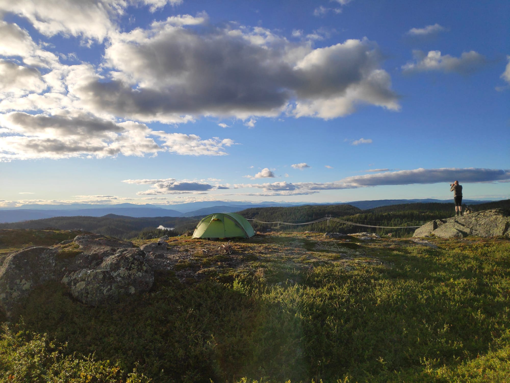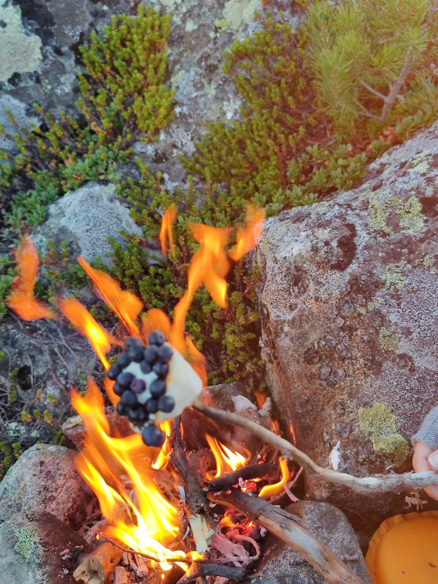 Hinter Honefoss fahren wir durch einige Tunnel und kommen im Hallingdal heraus, das wir uns zwischen stets enger zusammenrückenden Felswänden mit der Bergenbahn teilen. Es ist ein schöner Sommernachmittag und das Licht wird schon abendlich, als wir auf einer Brücke, die sich das Navi hartnäckig anzuerkennen weigert, den Fluss überqueren und auf einer Mautstraße zu der Hüttensiedlung auf dem Blafjell hochfahren. Dort parken wir das Auto am Straßenrand, folgen einem sehr hübschen Fußpfad auf ein der Erhebungen und schlagen dort unser Lager auf. Die Gegend eignet sich für ein Lagerfeuer und wir verbringen den restlichen Abend damit, Holz und Heidelbeeren zu sammeln und am Feuer Marshmallows zu rösten, die wir dann in den Becher mit den Beeren stippen - das Süßsaure schmeckt großartig zusammen. Was für ein schöner letzter Abend!