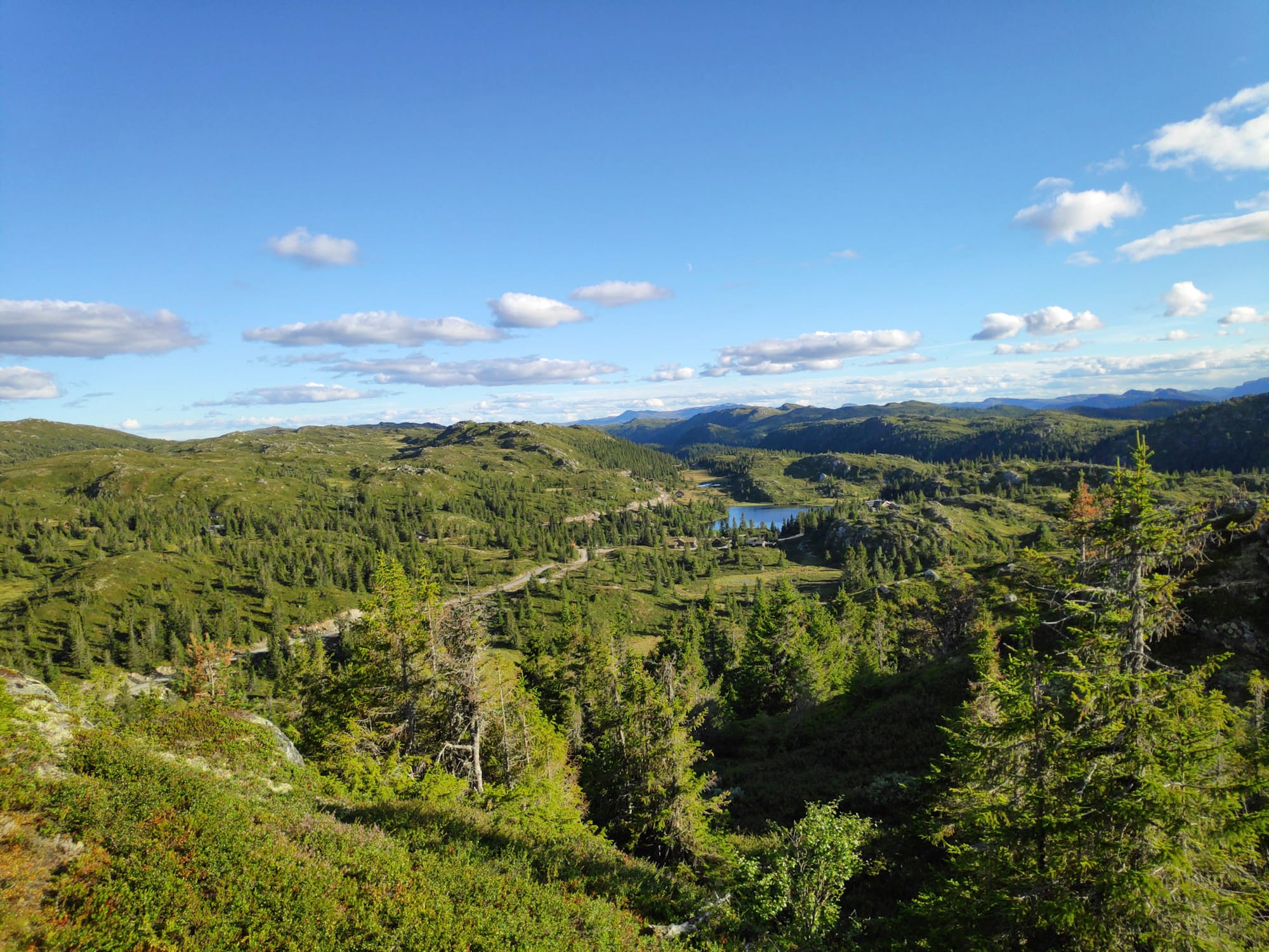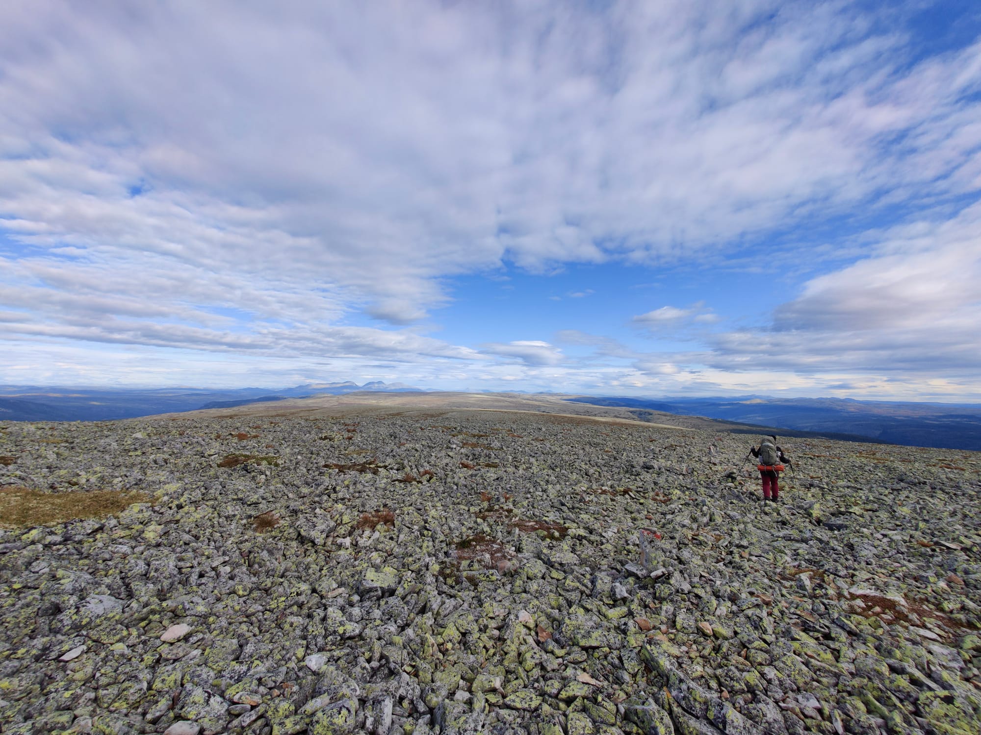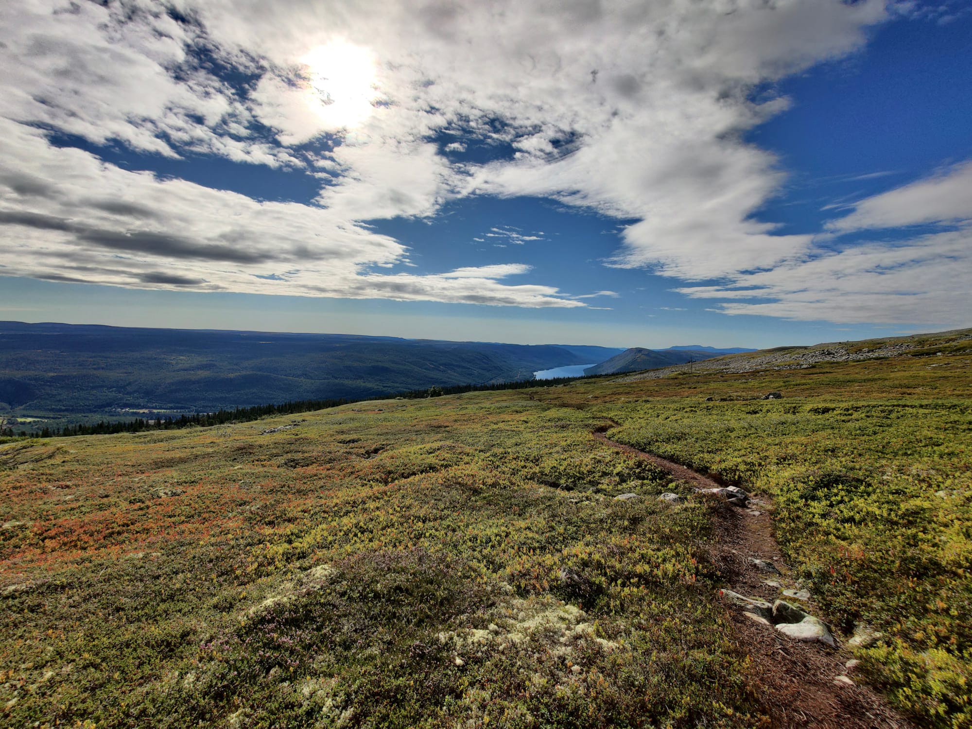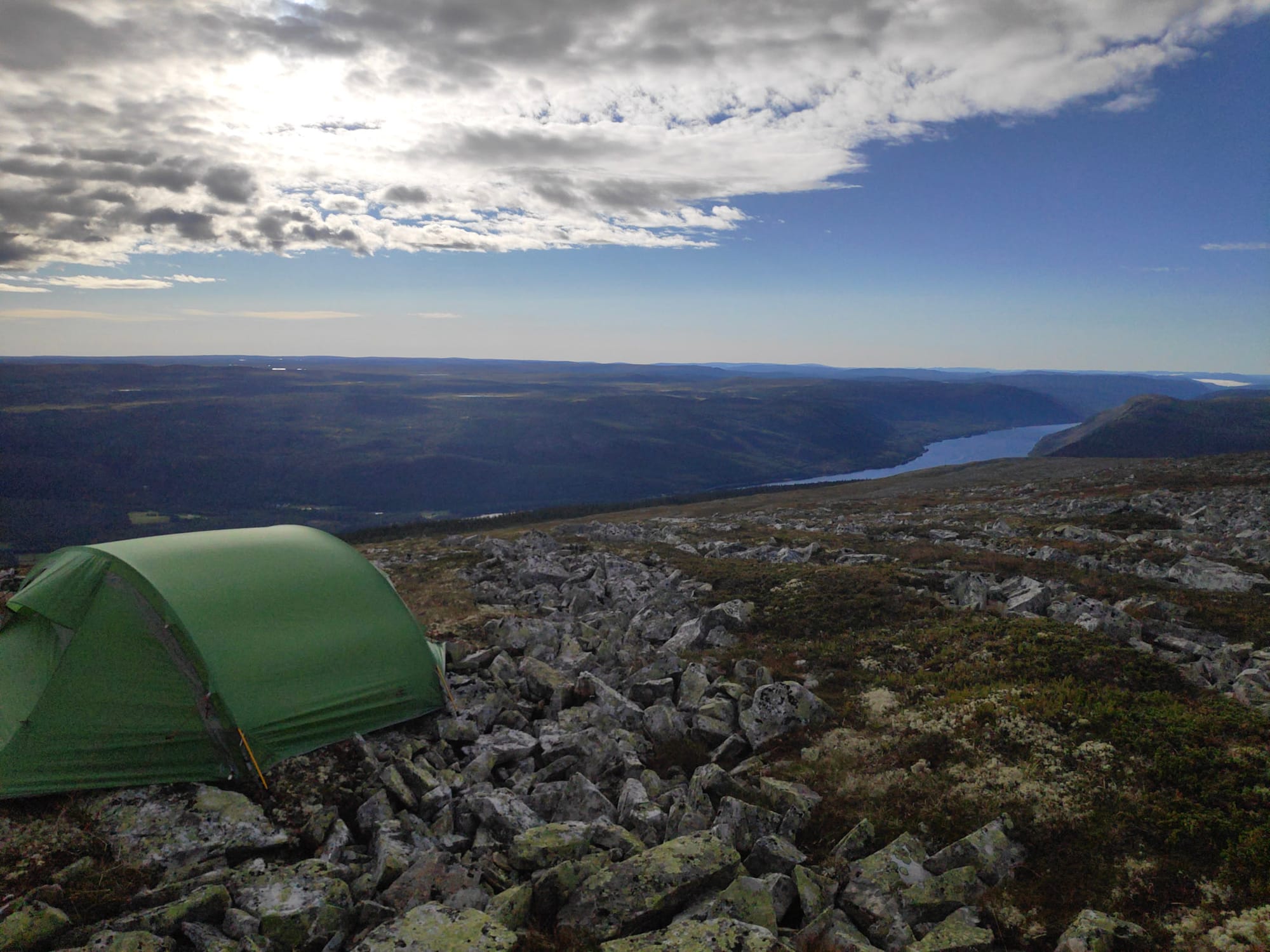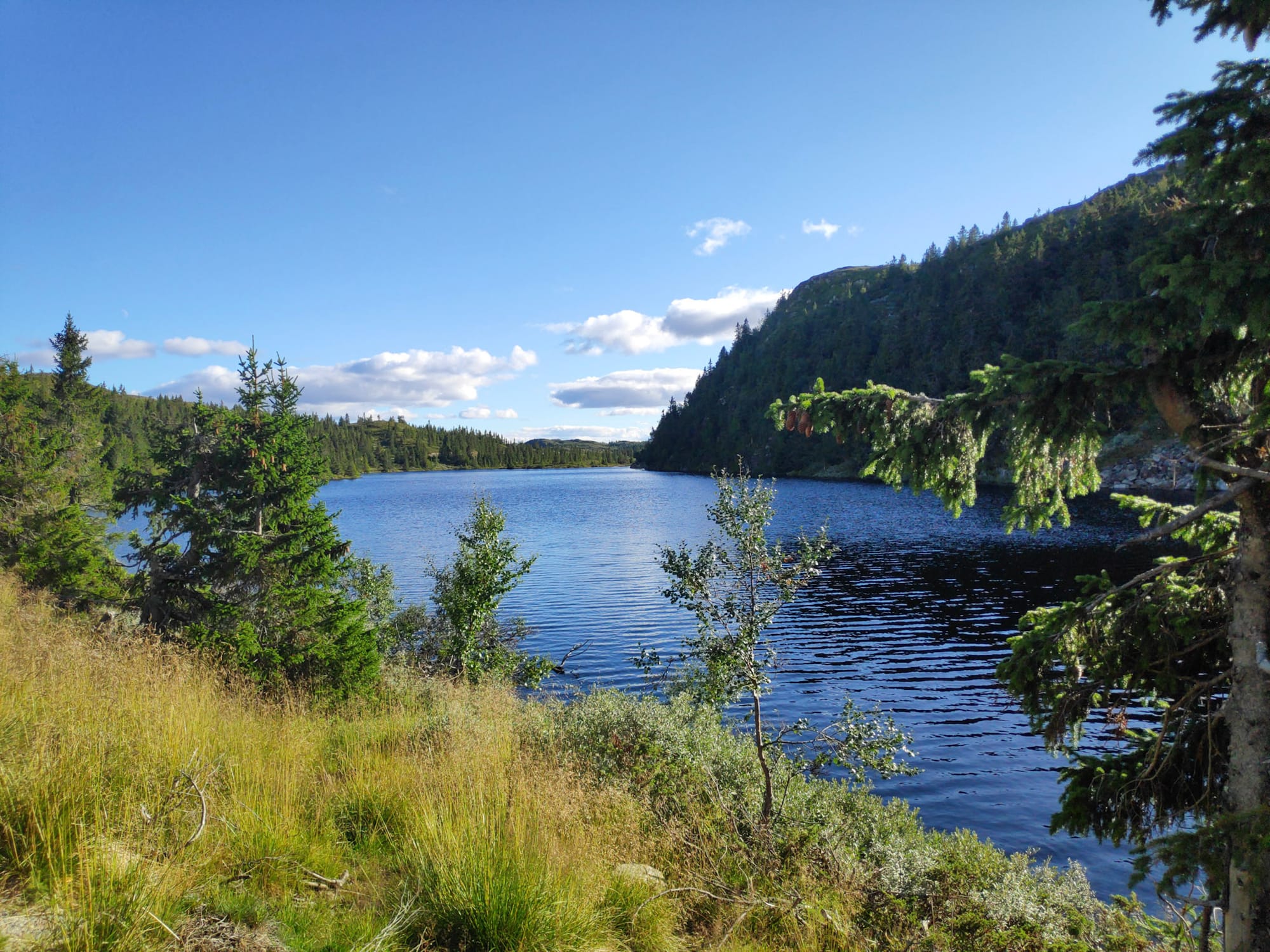 Die Nacht wird richtig kalt und es weht immer noch ein frischer Westwind, als wir aufwachen; dafür ist es ziemlich sonnig. Wir entscheiden uns, nach der Morgentoilette direkt aufzubrechen und irgendwo auf dem Weg nach unten eine Frühstückspause einzulegen, wenn wir im Windschatten sind. Meine Hände schmerzen trotz Handstulpen, als das Zelt endlich verpackt ist und wir uns über das Geröllfeld hinweg in Richtung Gipfel und Pfad in Bewegung setzen, aber schon wenige Meter unterhalb ist der Wind weniger, die Sonne wärmt und die Heide, durch die sich der Pfad schlängelt, leuchtet in schon sehr herbstlichen Farben, im Hintergrund der schmale, langgezogene Engerensee. Auch beim Abstieg finde ich wieder Moltebeeren! Mittlerweile bin ich mir sicher, dass mich der Geschmack nicht übermäßig begeistert, aber interessant sind sie allemal.