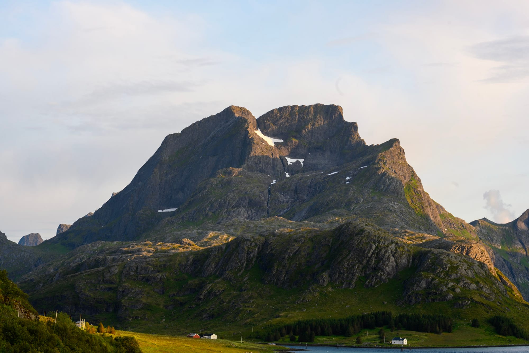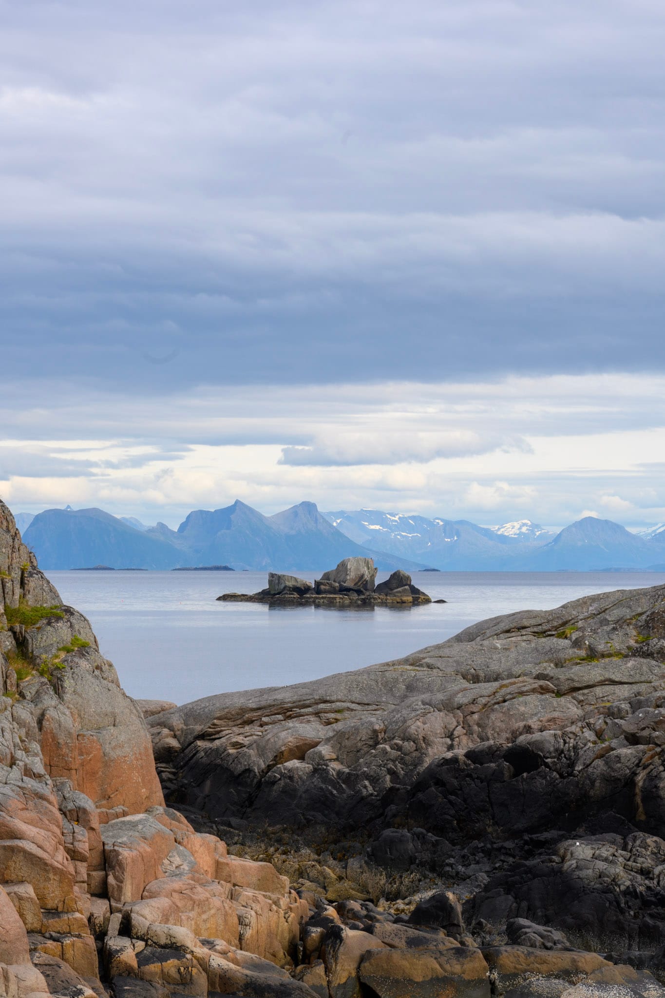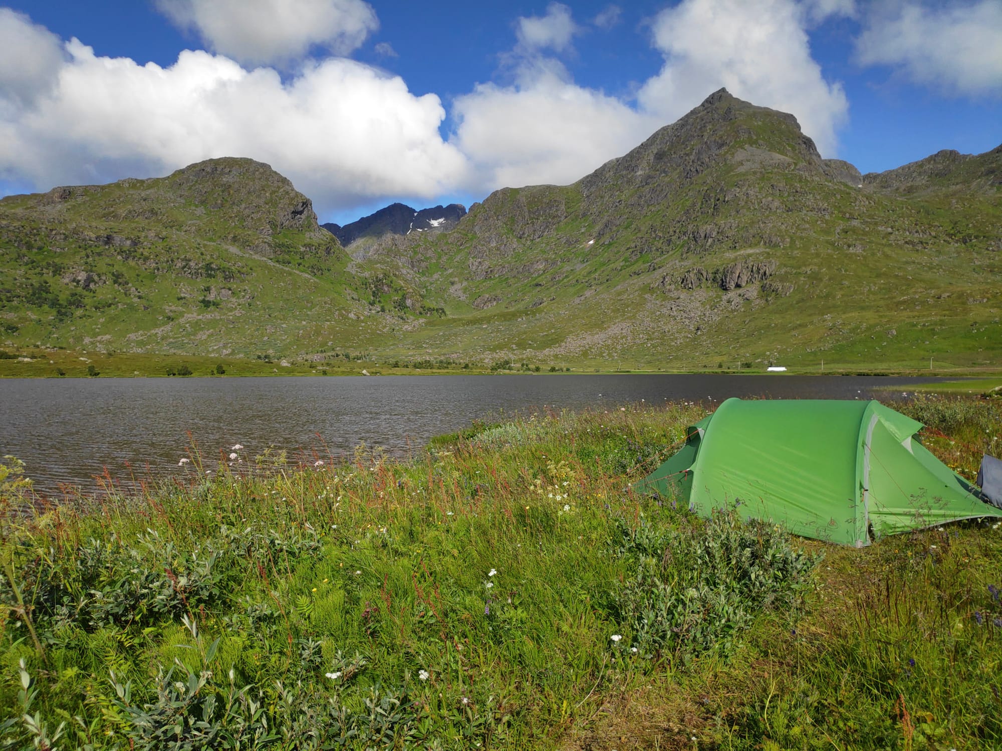 Das Auto kommt zu “Autoservice AS” nach Leknes und ich scanne OSMand nach Zeltmöglichkeiten in der Nähe, bevor ich mich entschließe, den Ortskundigen zu fragen. Er ist unheimlich hilfsbereit und fährt uns noch zu einem Seeufer in der Nähe seines Hofs, wo er uns auch am nächsten Vormittag wieder abholen und zur Autowerkstatt bringen wird. Der Platz liegt sehr idyllisch am kiesigen Ufer des Farstadvatnet, der Boden ist bedeckt von Blumen, im Hintergrund bimmeln leise die Kuhglocken. Mit immer noch sehr gemischten Gefühlen stellen wir das Zelt auf und fallen dann auch zügig in die Schlafsäcke.