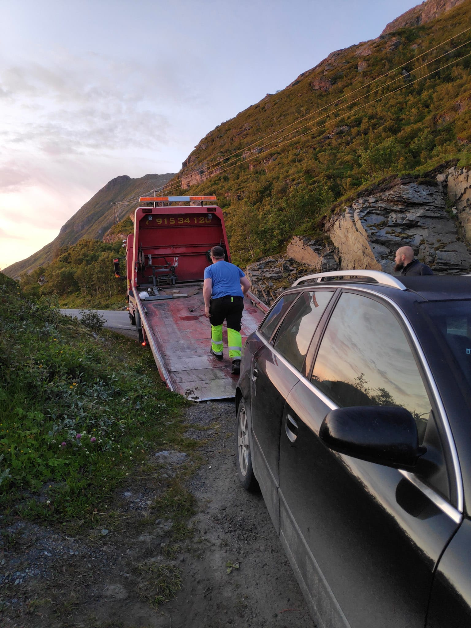 Von den Eindrücken der Fahrt ist mir wenig in Erinnerung außer dass es schön war, gebirgig und rauh, aber die Fahrstrecke war einfach zu lang, um alles Gesehene wirklich aufzunehmen und/oder von den nachfolgenden Ereignissen überschattet: Kurz hinter Leknes im Nappstraumentunnel gibt das Auto plötzlich schrille Töne von sich und vermeldet ungenügenden Öldruck. Wir vermuten zunächst eine unzureichende Ölmenge, sodass ich mich per Autostop auf zur nächsten Tankstelle mache, um Motoröl zu holen. Ich werde direkt von drei sehr netten Australiern in einem gemieteten Wohnmobil mitgenommen und lustigerweise haben sie genau das gesuchte Motoröl an Bord. Wir machen also nach einem Kilometer wieder kehrt, das Motoröl und eine Banknote wechseln die Besitzer. Leider ist das Problem damit nicht gelöst und die Motorengeräusche werden ebenfalls unerfreulicher. In einer Parkbucht kurz vor Ramberg bleiben wir endgültig liegen und verständigen den Schutzbrief unserer KFZ-Versicherung, womit wir beim aufnehmenden Angestellten einige Erheiterung verursachen. Schnell wird es nicht gehen, soviel ist klar.