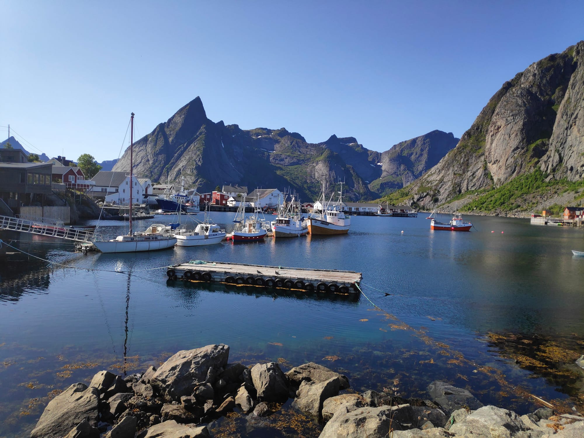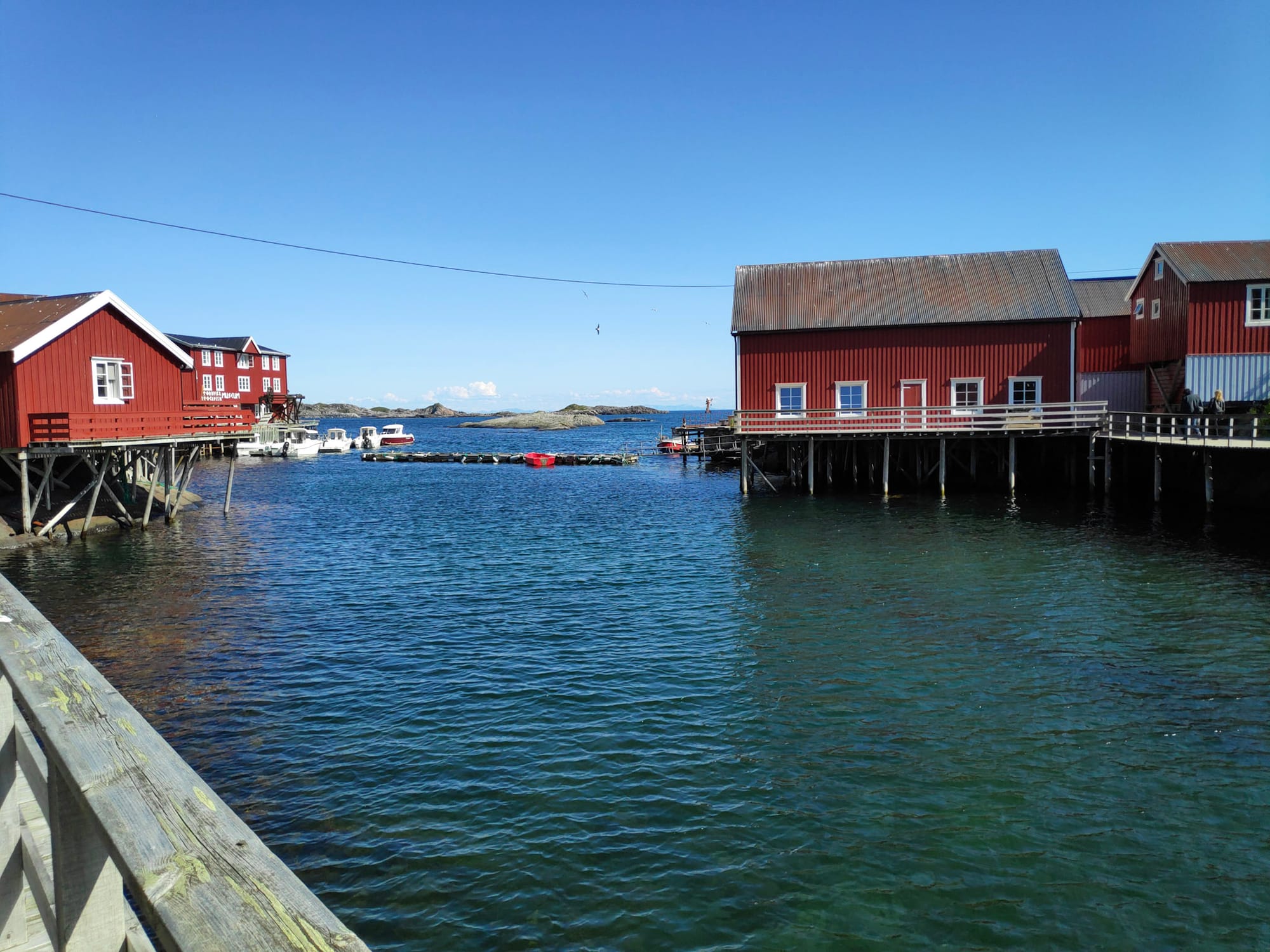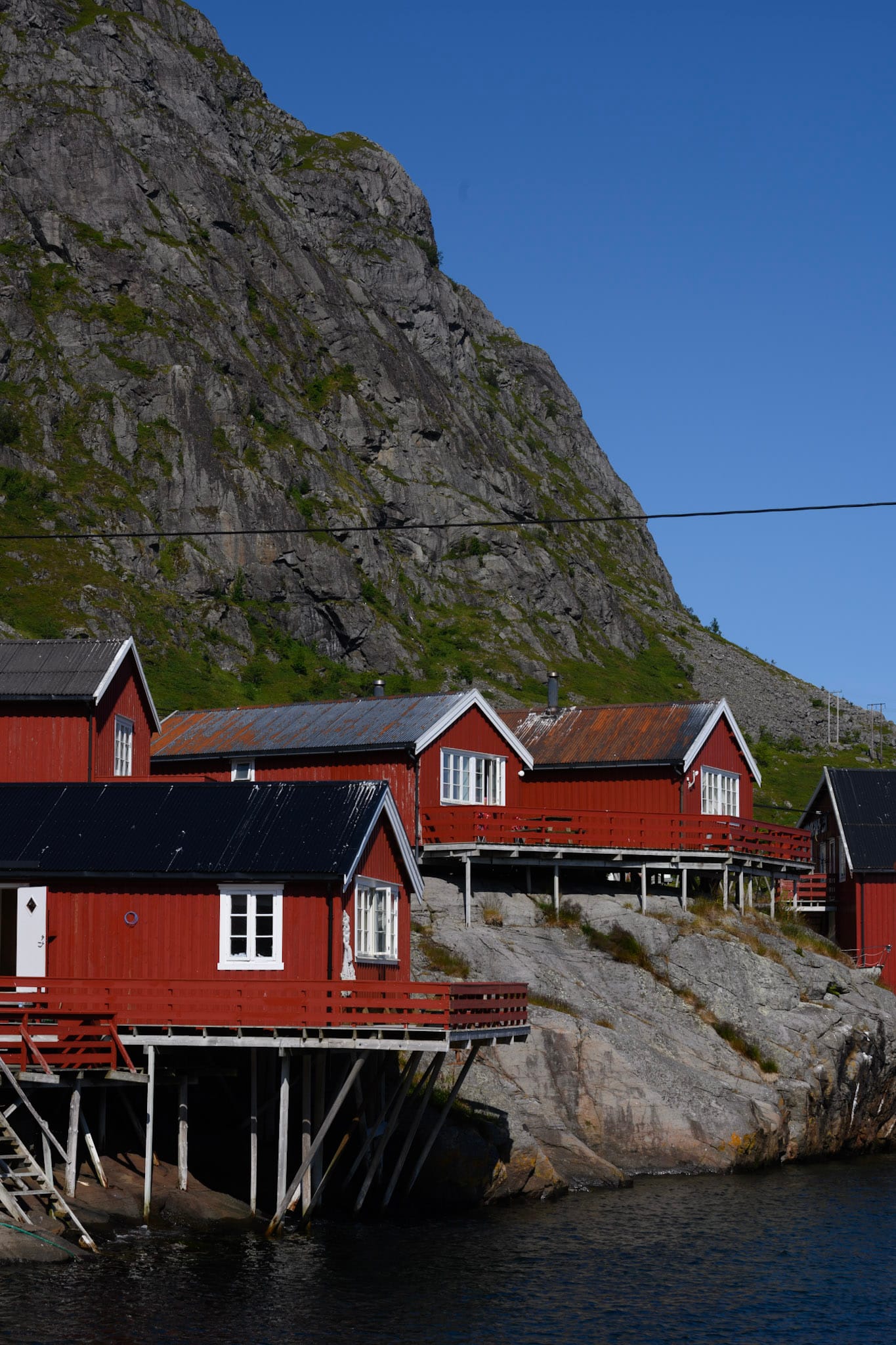 Richtung Reine knubbelt es sich, jedermann und seine Oma wollen mit ihrem Wohnmobil durch das kleine, malerisch an der Küste gelegene Kaff fahren und so brauchen wir für die letzten Kilometer nach A eine Weile. Dort angekommen, stellen wir fest, dass es nicht so schlecht war, dort nicht des abends auf der Suche nach einem Nachtquartier eingetroffen zu sein, denn es ist arg überfüllt und das ist der Sache doch irgendwie abträglich, auch wenn die roten Pfahlbauten über der felsigen Küste zweifellos wunderschön ist. Vielleicht ist es auch der Verlust unseres Autos, der uns A überschattet - im Nachhinein frage ich mich, ob die Gegend nicht vielleicht vor einem wolkenverhangenen Himmel oder einer stürmischen See mehr zu mir “gesprochen” hätte als an diesem strahlenden Sommertag. Eindeutig ein Luxusproblem!