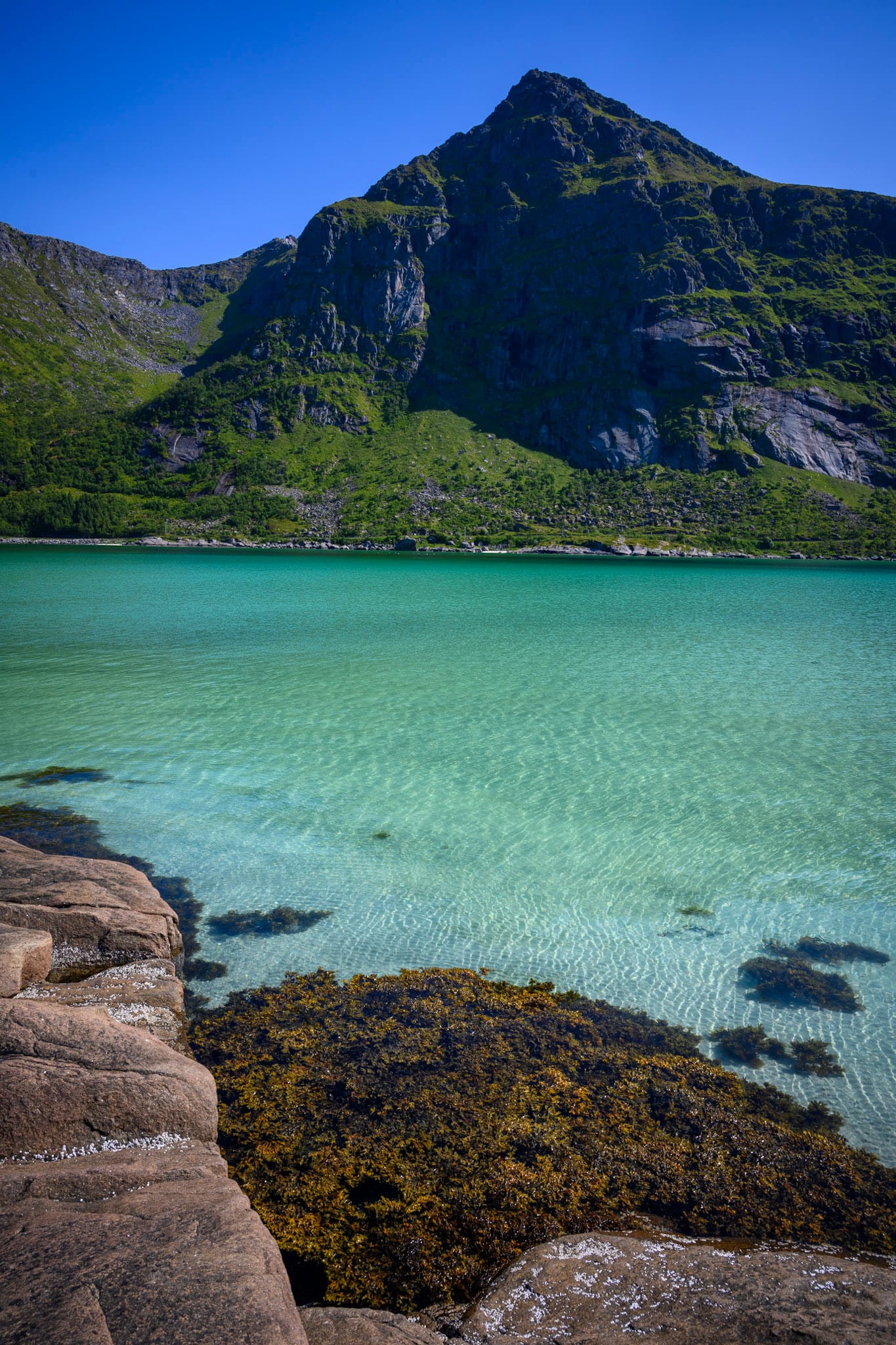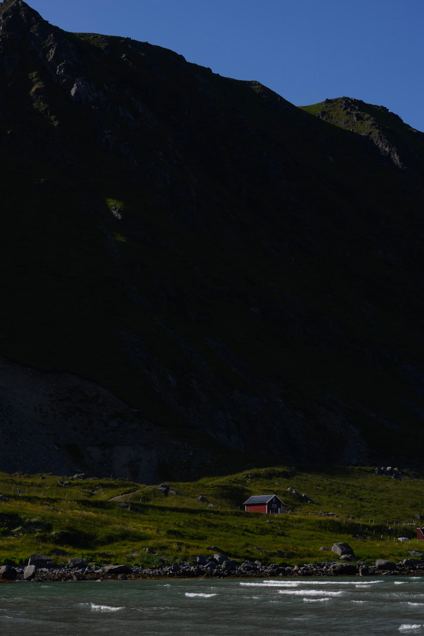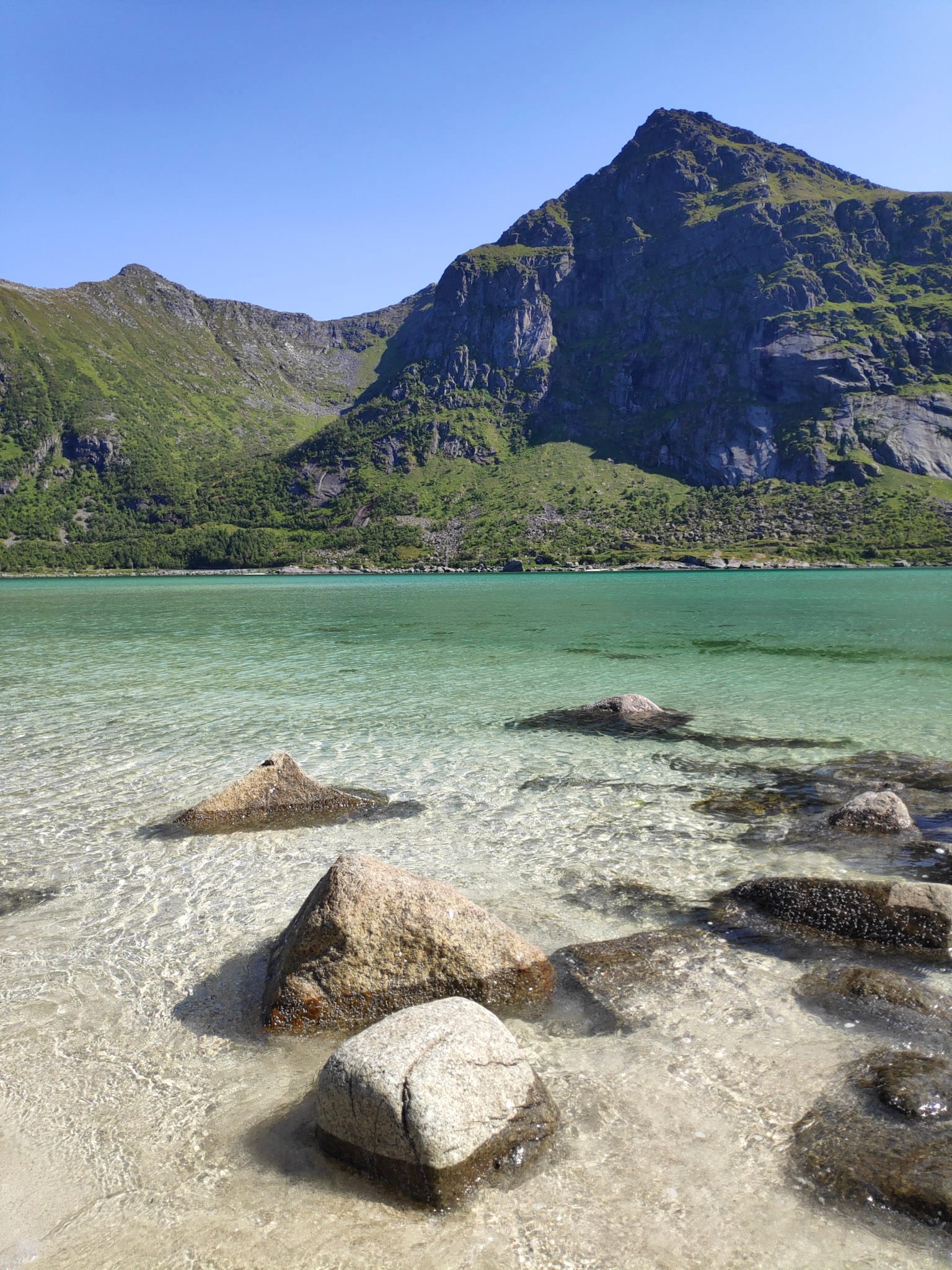 Richtung Reine knubbelt es sich, jedermann und seine Oma wollen mit ihrem Wohnmobil durch das kleine, malerisch an der Küste gelegene Kaff fahren und so brauchen wir für die letzten Kilometer nach A eine Weile. Dort angekommen, stellen wir fest, dass es nicht so schlecht war, dort nicht des abends auf der Suche nach einem Nachtquartier eingetroffen zu sein, denn es ist arg überfüllt und das ist der Sache doch irgendwie abträglich, auch wenn die roten Pfahlbauten über der felsigen Küste zweifellos wunderschön ist. Vielleicht ist es auch der Verlust unseres Autos, der uns A überschattet - im Nachhinein frage ich mich, ob die Gegend nicht vielleicht vor einem wolkenverhangenen Himmel oder einer stürmischen See mehr zu mir “gesprochen” hätte als an diesem strahlenden Sommertag. Eindeutig ein Luxusproblem!