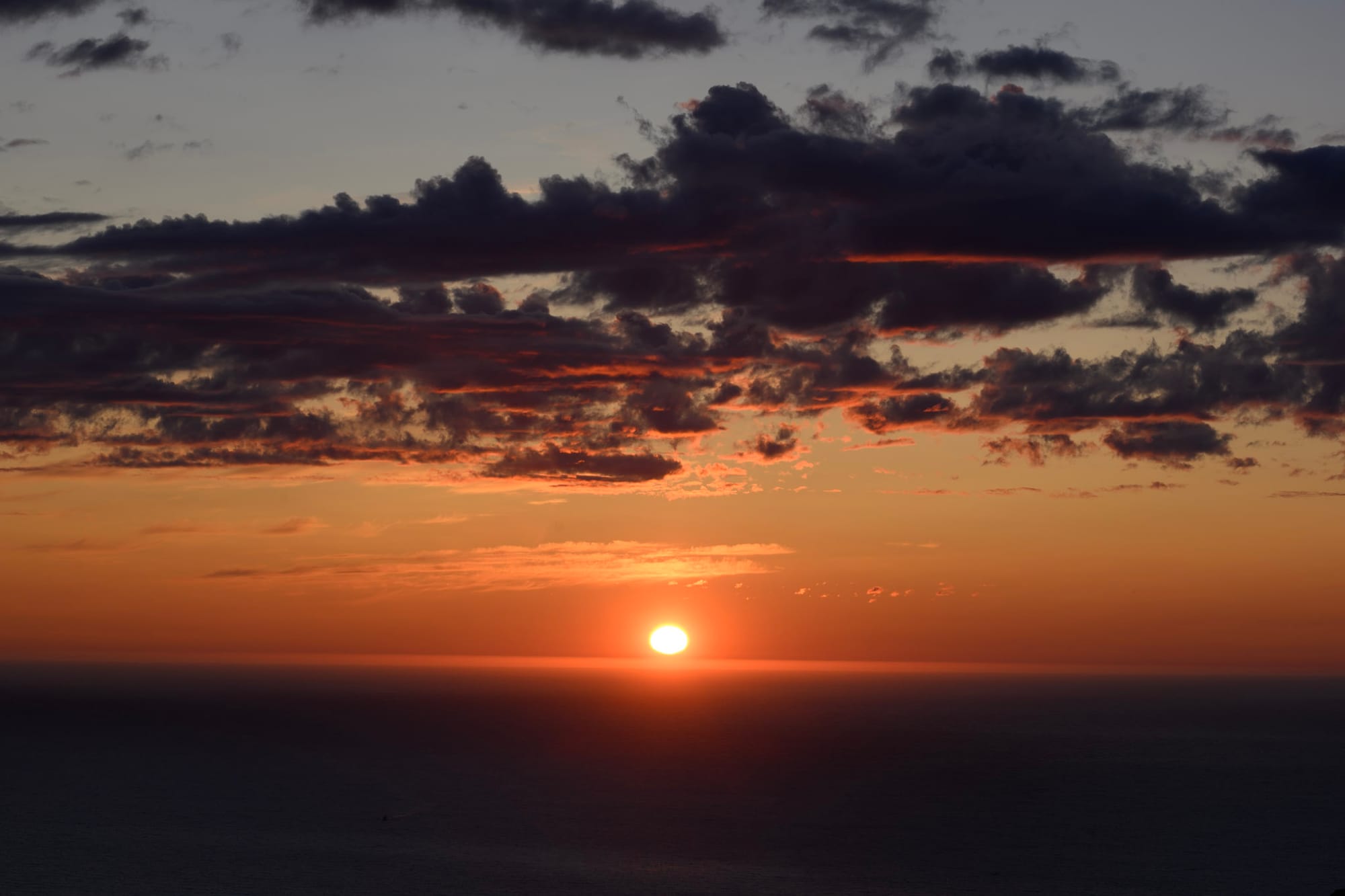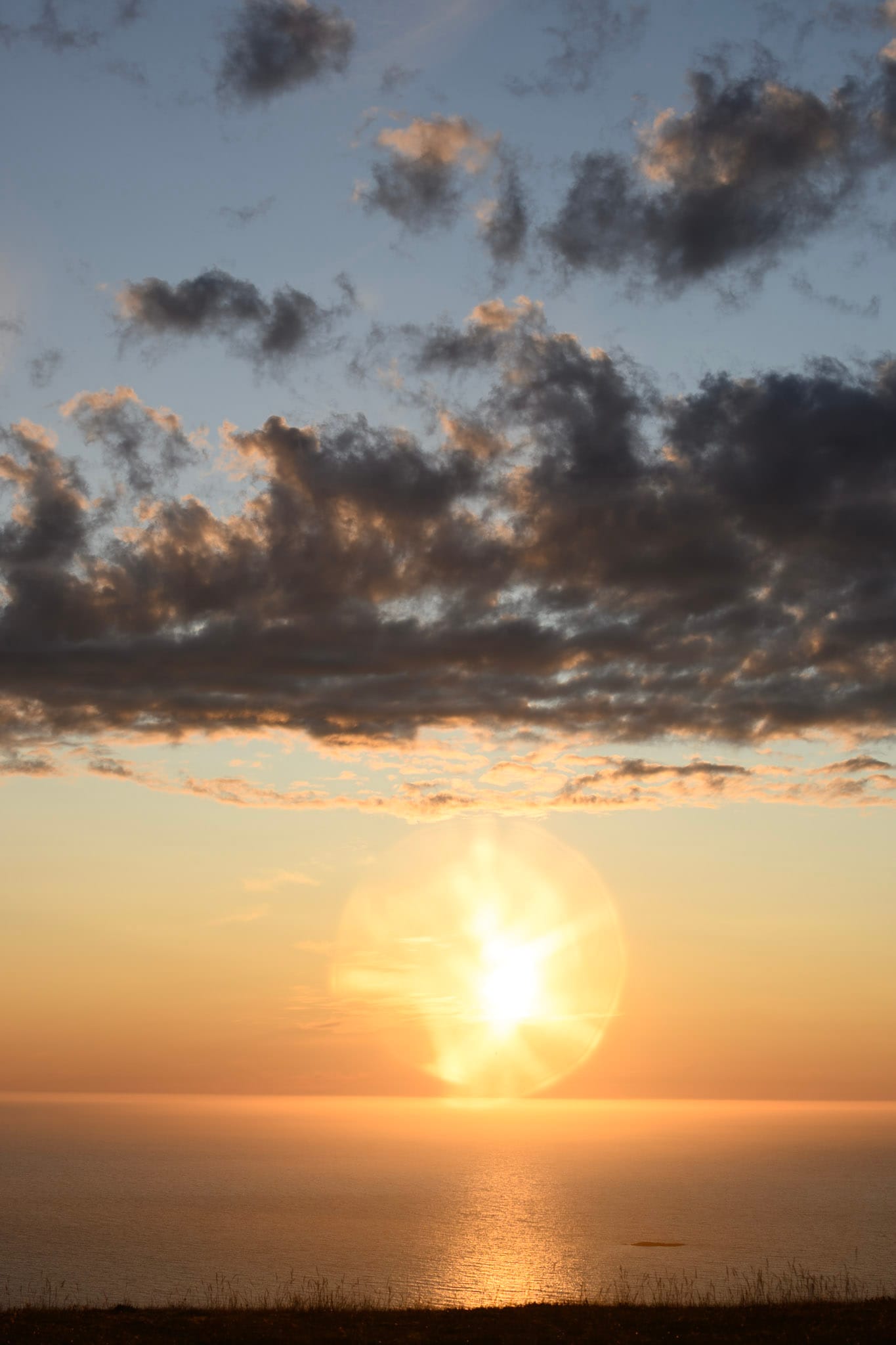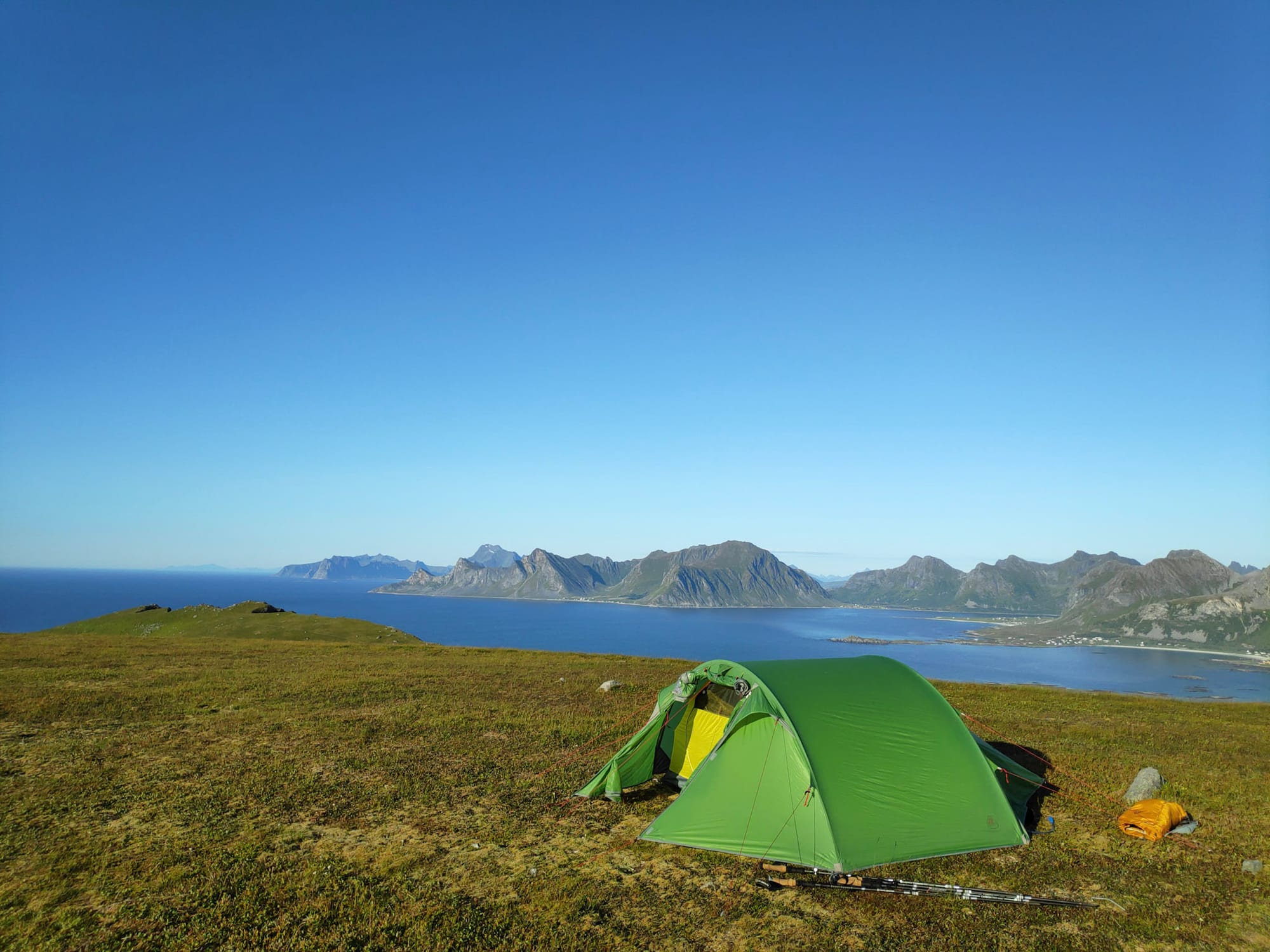 Der Aufstieg über Wiesenhänge auf die Hochfläche hat es vor allem zum Schluss in sich, aber die Aussicht auf die weite Bucht ist traumhaft und oben auf der Heide haben wir nordwärts freie Sicht bis zum Horizont. Wir erkunden noch eine Weile den langgezogenen Rücken und ziehen uns dann mit zwei Folgen “Stranger Things” und dem Abendessen ins Zelt zurück. Da es unser letzter Abend ist, brechen wir sogar den Instantpudding an und spät am Abend sehen wir die Sonne zum ersten Mal seit Wochen wieder unter den Horizont tauchen.