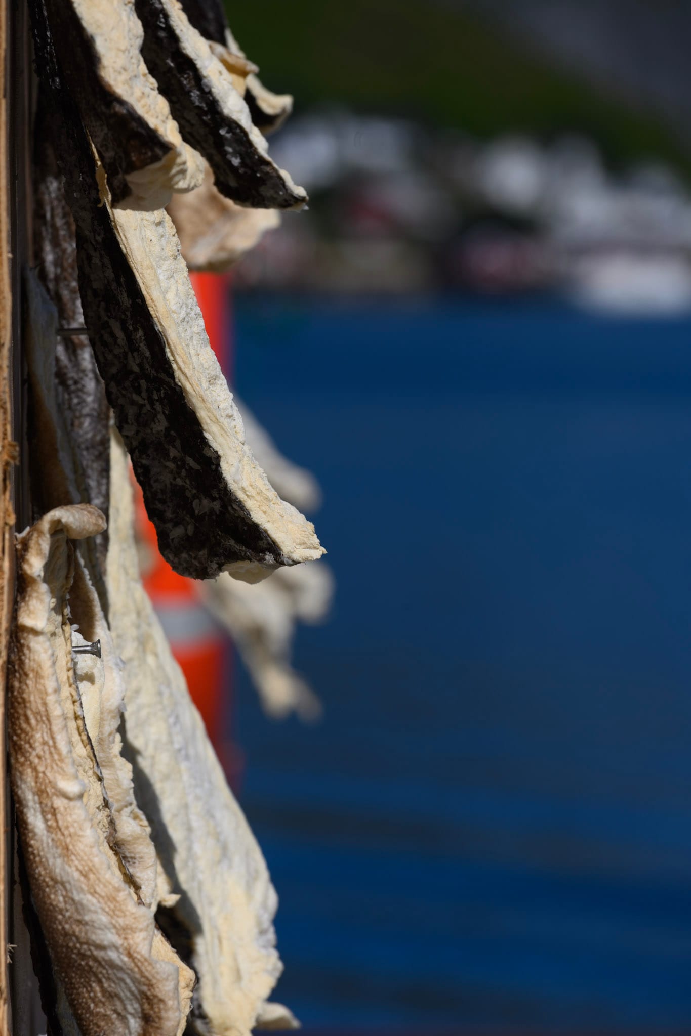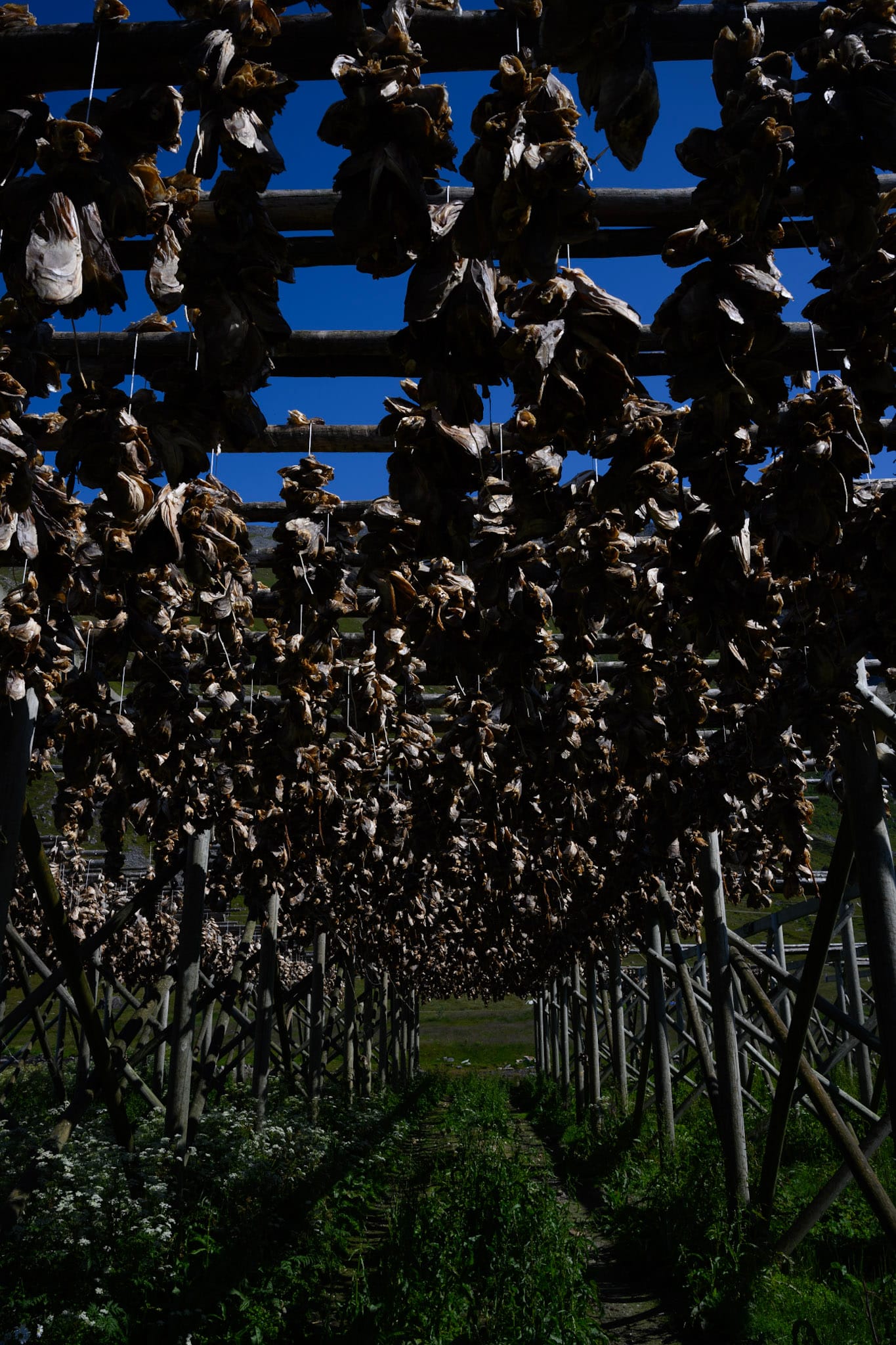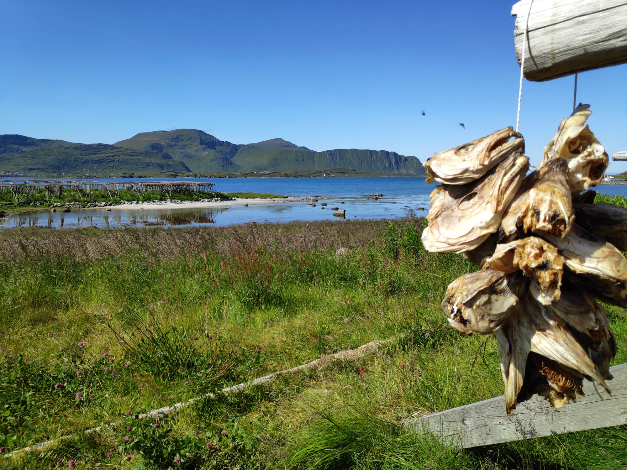 Die Fahrt ist wunderschön, wir kommen an türkisfarben leuchtenden Fjorden vorüber, an deren flachen Stränden Seesterne schwimmen und an großen Flächen voller Stockfischgestelle, an denen nur noch die Fischköpfe hängen. Zwischen den Inseln überspannen weiße Brücken das strömende Meer.