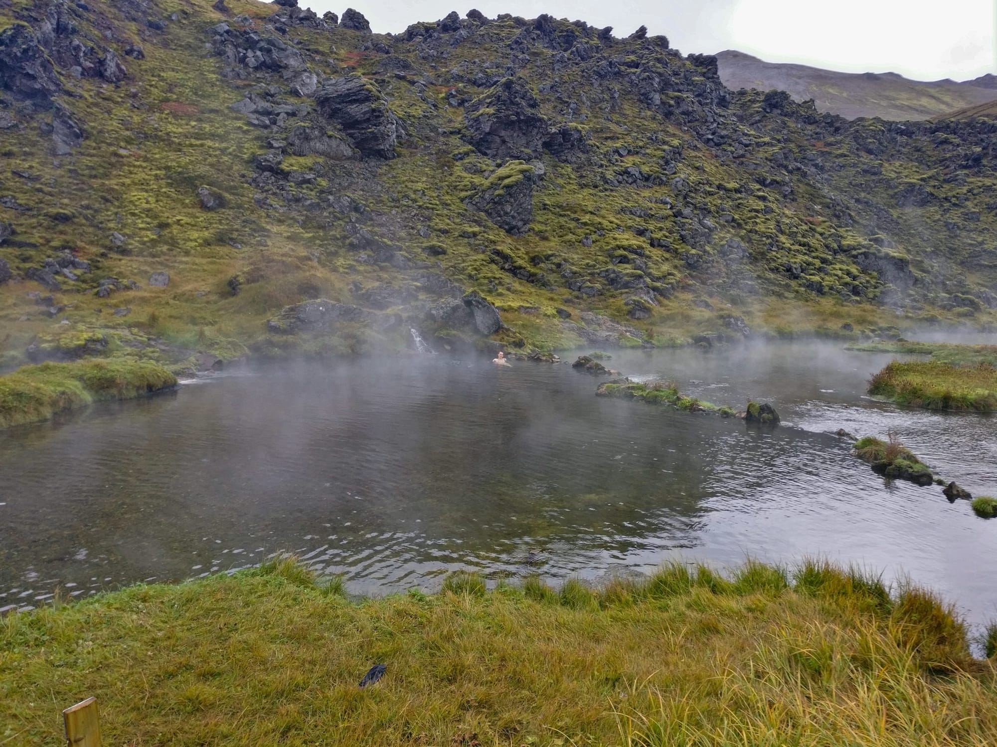 Das Wasser ist herrlich, eine heiße Quelle entspringt am Hang und plätschert an mehreren Stellen in einen Bach, der an dieser Stelle ein breites und flaches Bassin formt. Hier lässt es sich gemütlich sitzen, je nach Abstand zu den warmen Zuflüssen mal kühler und mal wärmer. Eine Zeitlang sind wir völlig allein und der Nebel trägt dazu bei, die anderen Menschen auf dem Parkplatz am anderen Ende des Tals völlig auszublenden.
