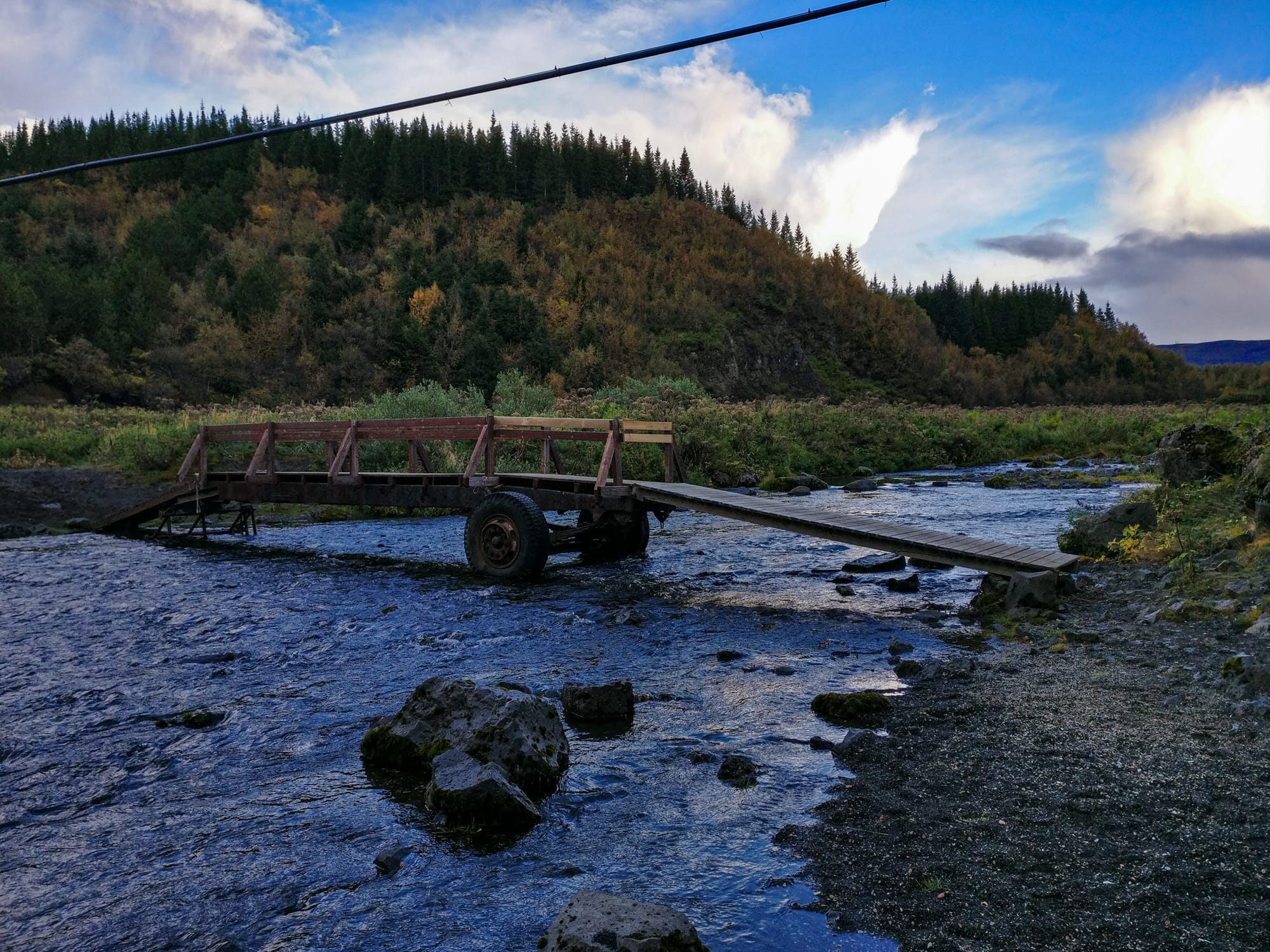 An den Campingplatz schließt sich ein Spazierpfad an und da es tatsächlich etwas aufklart, haben wir nach dem Zeltaufbau Zeit für eine Runde über eine sehr lustige Brücke, die aus einem LKW-Anhänger gebaut wurde, durch einen schon sehr authentisch riechenden kleinen Nadelwald. Es gibt sogar eine Feuerstelle, an der jemand in jüngster Zeit das weltkleinste Lagerfeuer aus dürren Fichtenzweigen entzündet hatte.