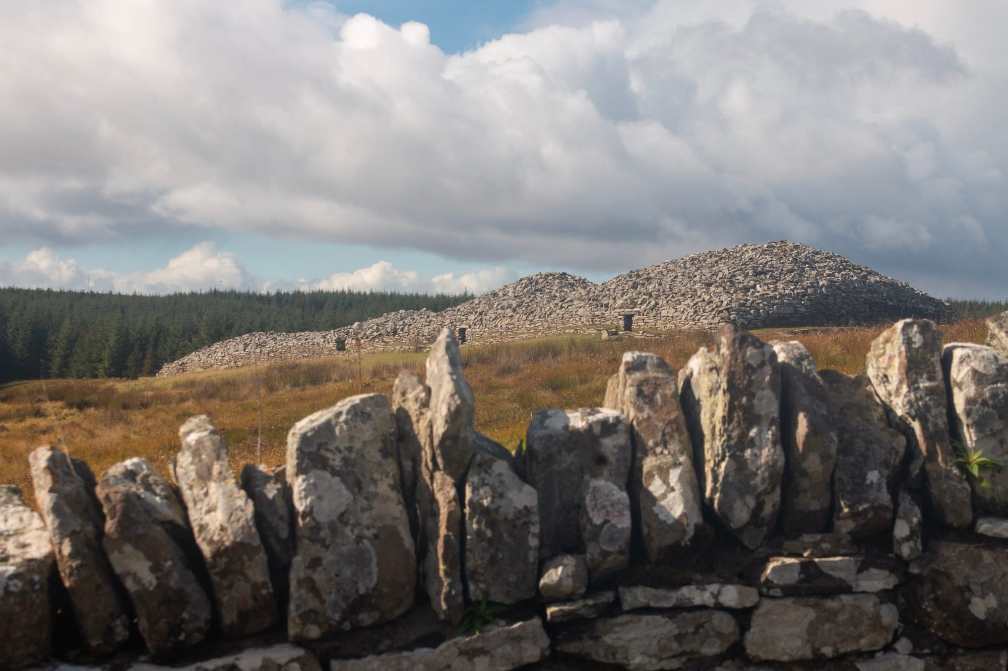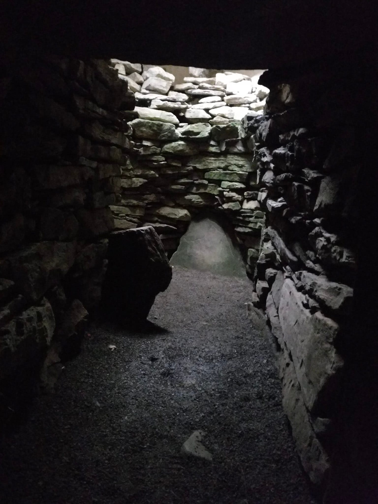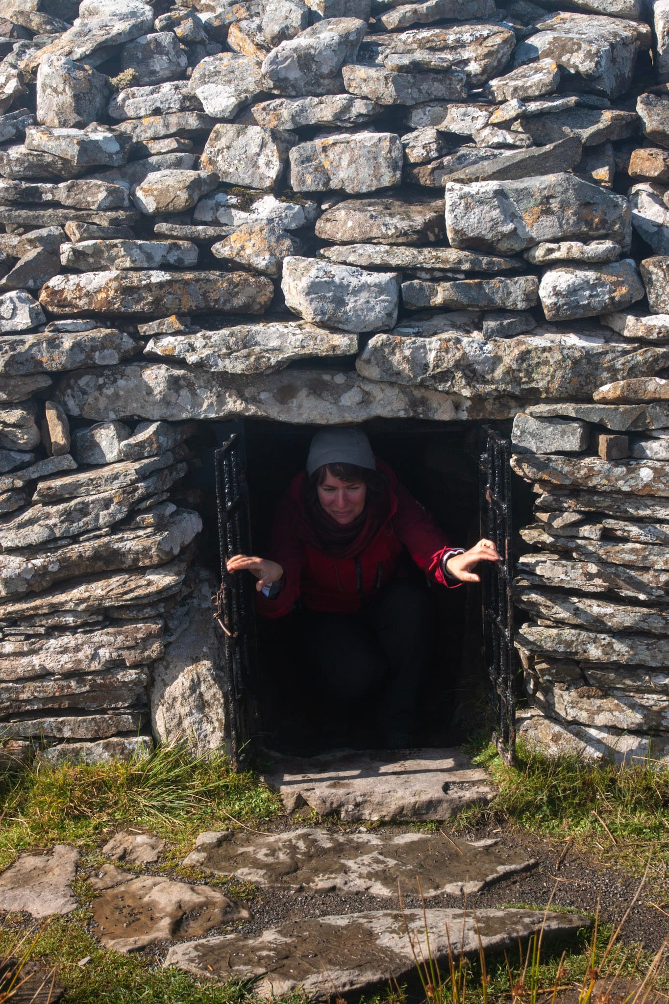 Der runde Cairn ist der kleinste, die Gänge der beiden anderen sind noch etwas bequemer zu “begehen”. Alle drei sind mit kleinen Gittern verschlossen, um die allgegenwärtigen Schafe draußen zu halten.