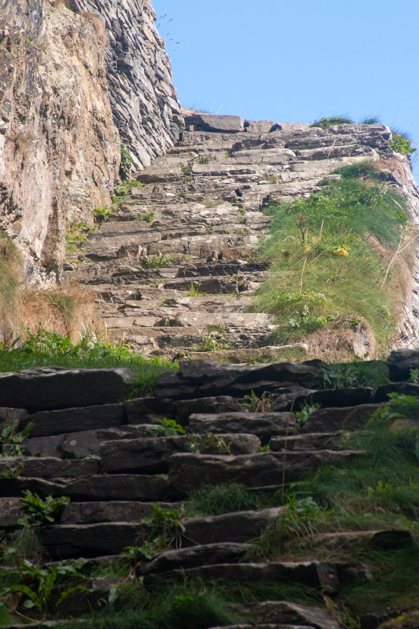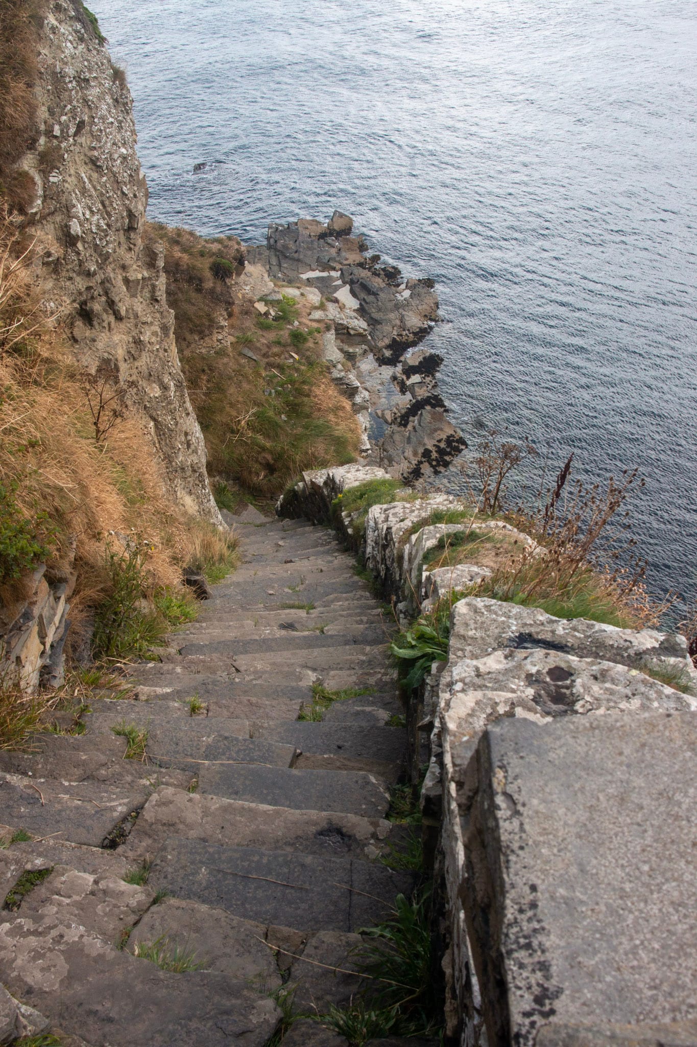 Auf der Suche nach den Whaligoe Steps fahren wir auch dieses Mal erst vorbei und finden beim dritten Anlauf die schmale Seitenstraße mit dem kleinen Parkplatz am Ende. Ein laminiertes Schild weist zu den Stufen, die unzeremoniell direkt hinter dem letzten Haus am Hang beginnen und in Serpentinen die senkrechte Klippe hinabführen - 360 waren es einmal, 330 sind es jetzt noch, gebaut wurden sie im 18. Jahrhundert während des Heringsbooms aufgrund eines Mangels an Häfen in der Gegend. Der Abstieg ist nicht sehr steil und nicht einmal sonderlich ausgesetzt, trotzdem wird mir beim Blick abwärts komisch im Bauch. Entlang der Klippen sitzen und fliegen Möwen, der Steilhang ist bewachsen mit Grasbüscheln und Resten von Sommerblumen. Nach ein paar Minuten stehen wir unten auf dem “bink”, der künstlich errichteten grasbewachsenen Mole, zwischen den Überresten des Salzhauses, der Teergrube und einer Winde. In die Klippenwand eingelassene rostige Ketten legen Zeugnis davon ab, wie die Schiffe vor Errichtung des bink befestigt wurden. Es ist ein eigenartiges Gefühl, auf dem Grund dieser tiefen Schlucht zu stehen, die nur auf einer Seite zum Meer hin offen ist und die jetzt am Nachmittag bereits im Schatten liegt. Auf mehr als eine Art ist dieser Ort voller Echos.