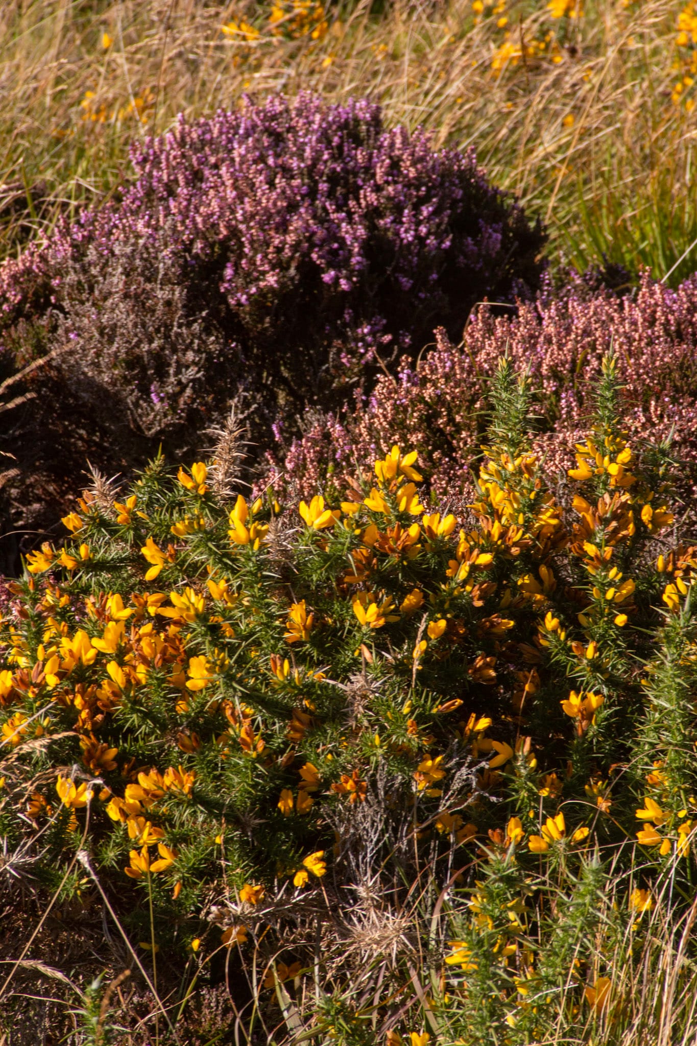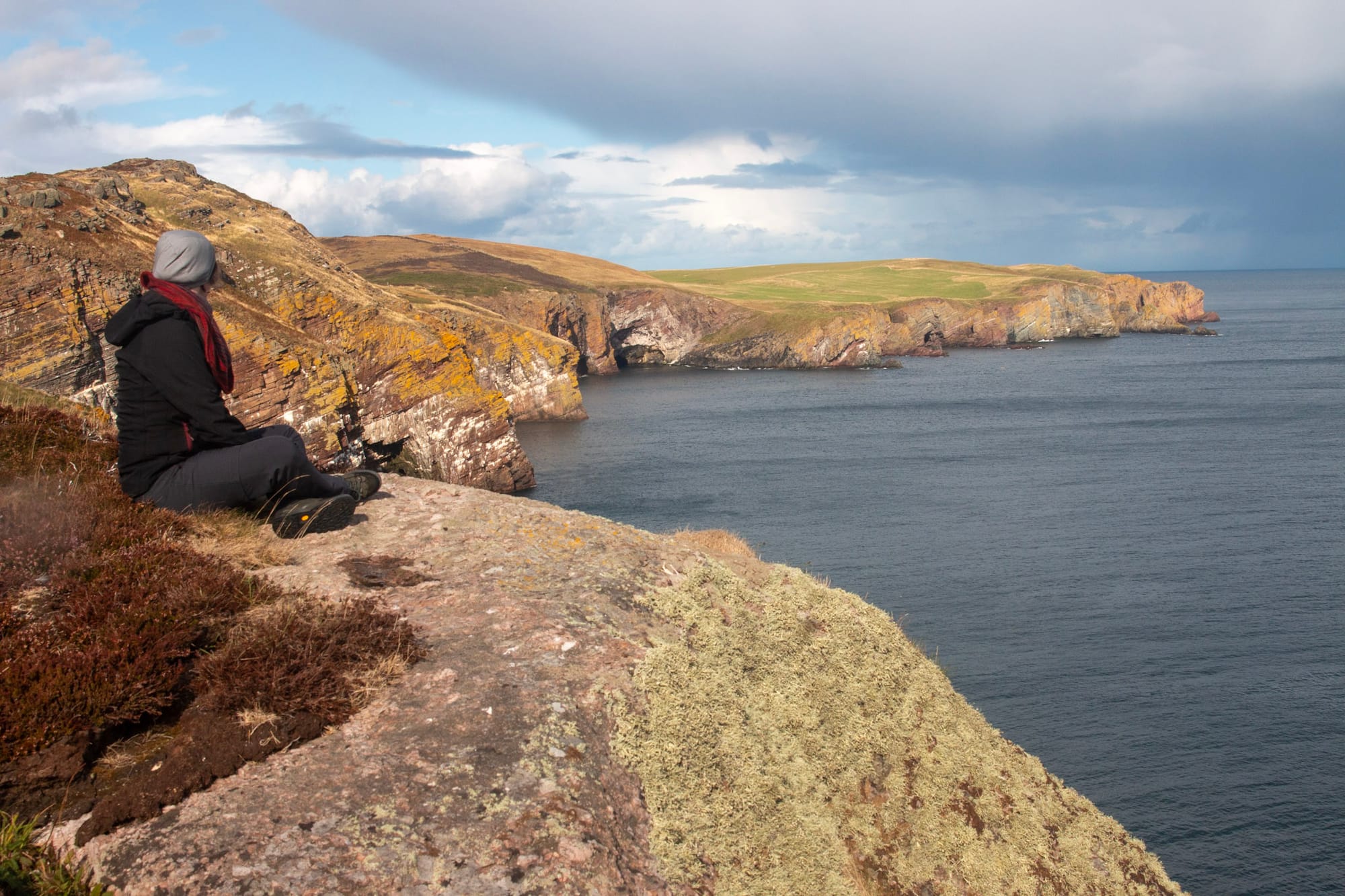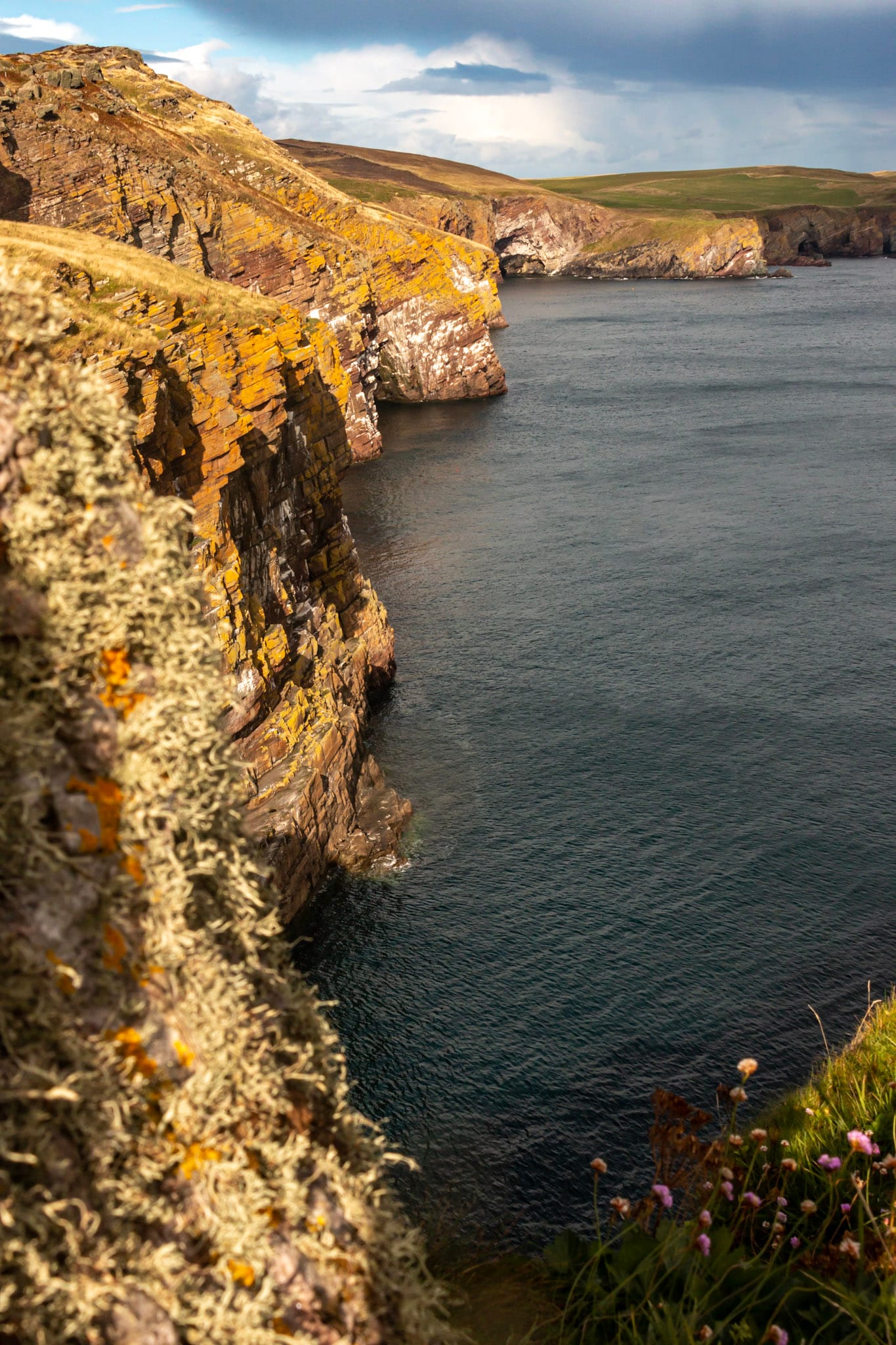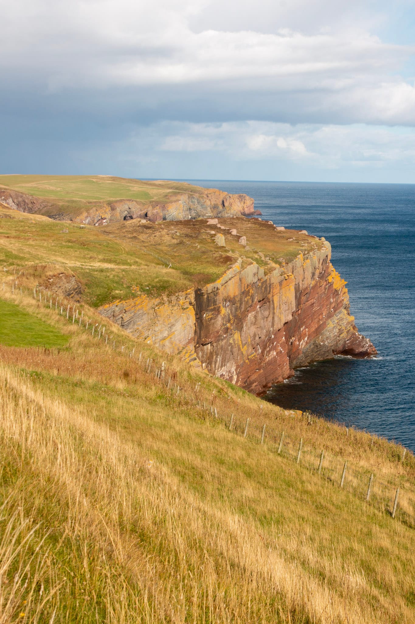 Wie fast überall in Schottland befinden sich auch auf den Klippen von Ostcaithness Schafweiden, die zum Abgrund hin eingezäunt sind und der Wanderweg, der im Hohen Gras kaum auszumachen ist, befindet sich zu einem großen teil jenseits des Zaunes, was mir besonders anfangs ein unangenehmes Flattern in der Magengrube beschert. Der Ausblick ist gigantisch, die senkrecht abfallenden Klippen leuchten in allen Tönen von Grau und flechtenbewachsenem Gelborang eim Sonnenlicht, zugleich ist absolute Aufmerksamkeit gefragt, ein Fehltritt könnte der letzte sein oder so empfinde ich es jedenfalls.