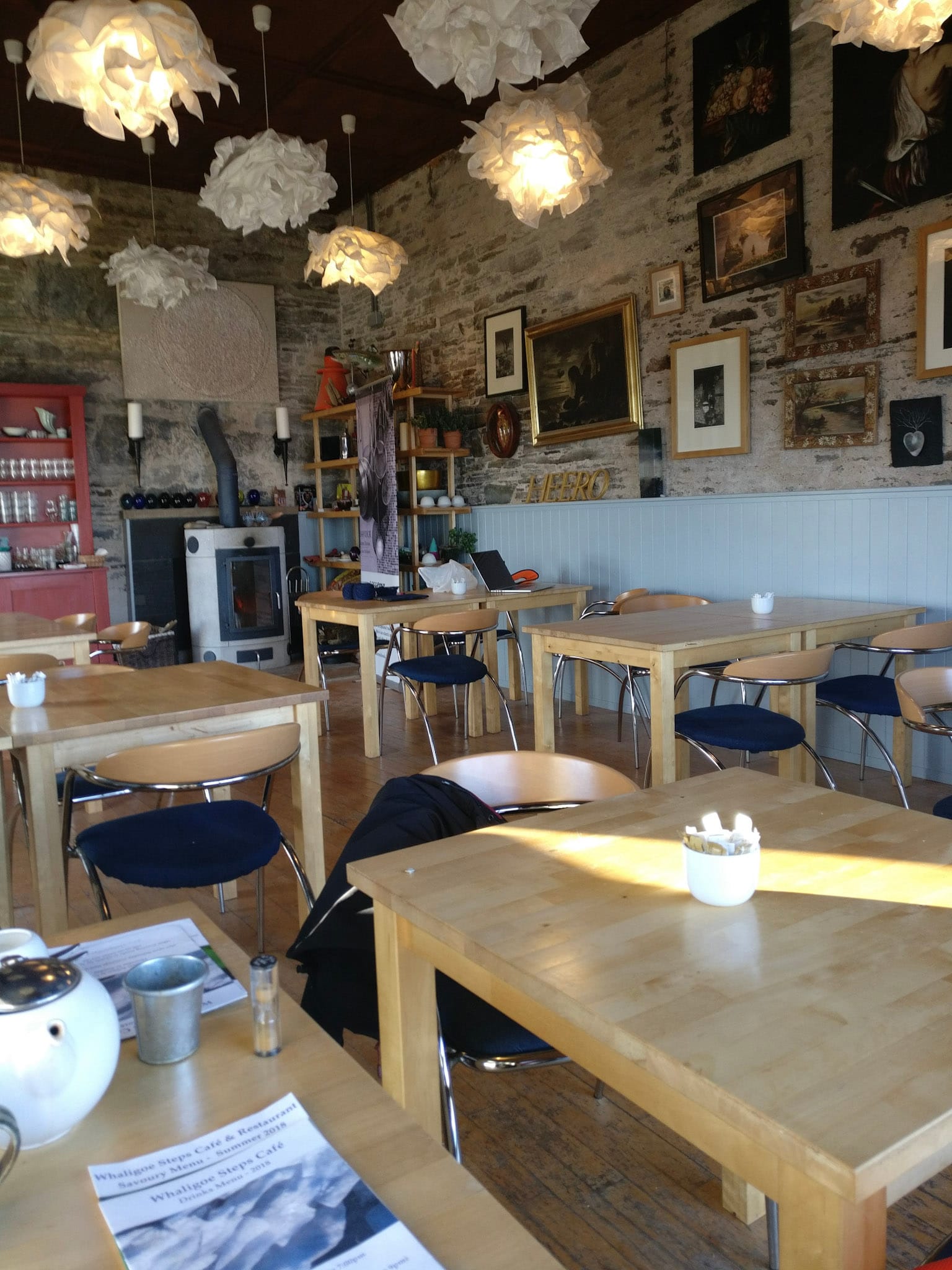 Auf dem Weg zurück fällt uns das Café direkt am Hang auf und wir kehren auf einen Tee ein. Die Gaststube verfügt über ein riesiges Panoramafenster, durch das man auf die Klippen und die Nordsee blicken kann, es ist warm und das Meer leuchtet blitzblau bis zum Horizont. Wir bleiben eine Weile sitzen und sind bald in ein Gespräch mit der Wirtin Karen und einigen Gästen aus der Gegend verwickelt, die uns Reisetips geben und uns darin bestärken, die Nacht unten im Hafen zu verbringen. Die Wirtin bietet uns sogar Holz für ein Lagerfeuer an und spätestens da ist das Nachtlager beschlossene Sache.