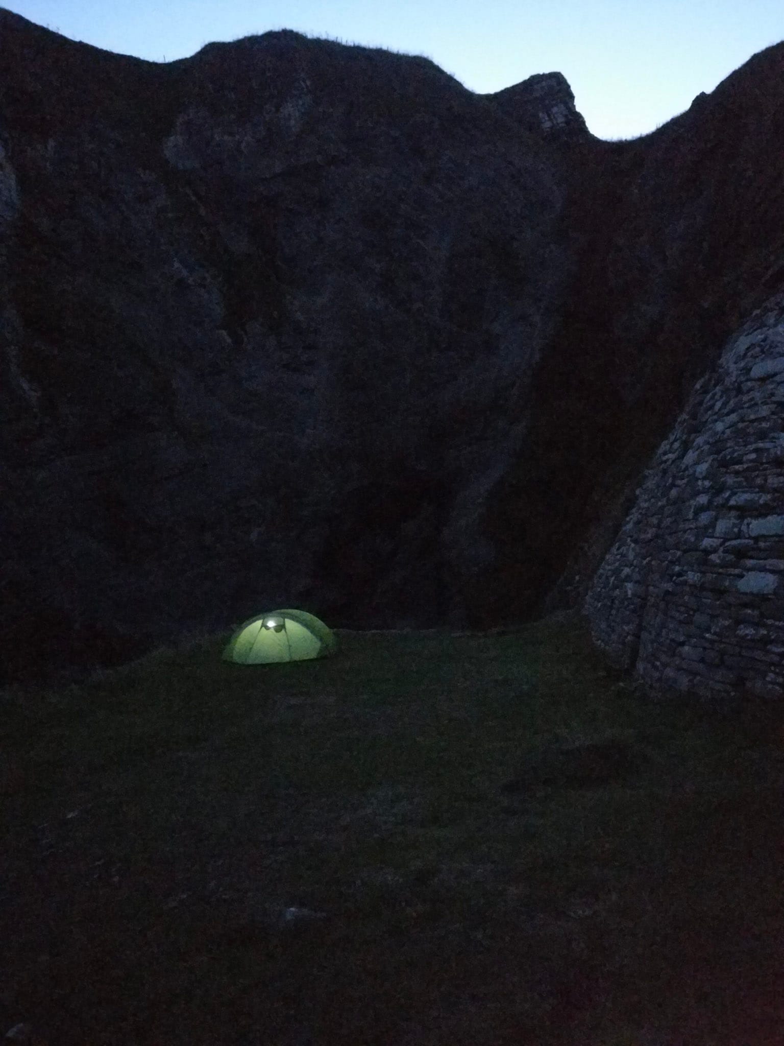 Wie die Speisekarte vermuten lässt, ist das Abendessen im Café hervorragend und als wir uns mit einem kleinen Armvoll Feuerholz treppab aufmachen, ist es schon dämmrig. Nach kurzem Suchen ist ein ausreichend ebener Platz auf dem bink gefunden und Heiko beginnt mit dem Feuermachen, was aber nur so halb funktioniert - es ist Ofenholz und muss ständig beblasen werden, damit es nicht ausgeht. Ein paar auf trockene Bärenklaustiele aufgespießte Marshmallows lassen sich dennoch rösten, dann treibt uns die Kälte in die Schlafsäcke. Beim Einschlafen hören wir immer wieder Meinungsverschiedenheiten der Möwen, die lautstark zwischen den Felswänden wiederhallen.
