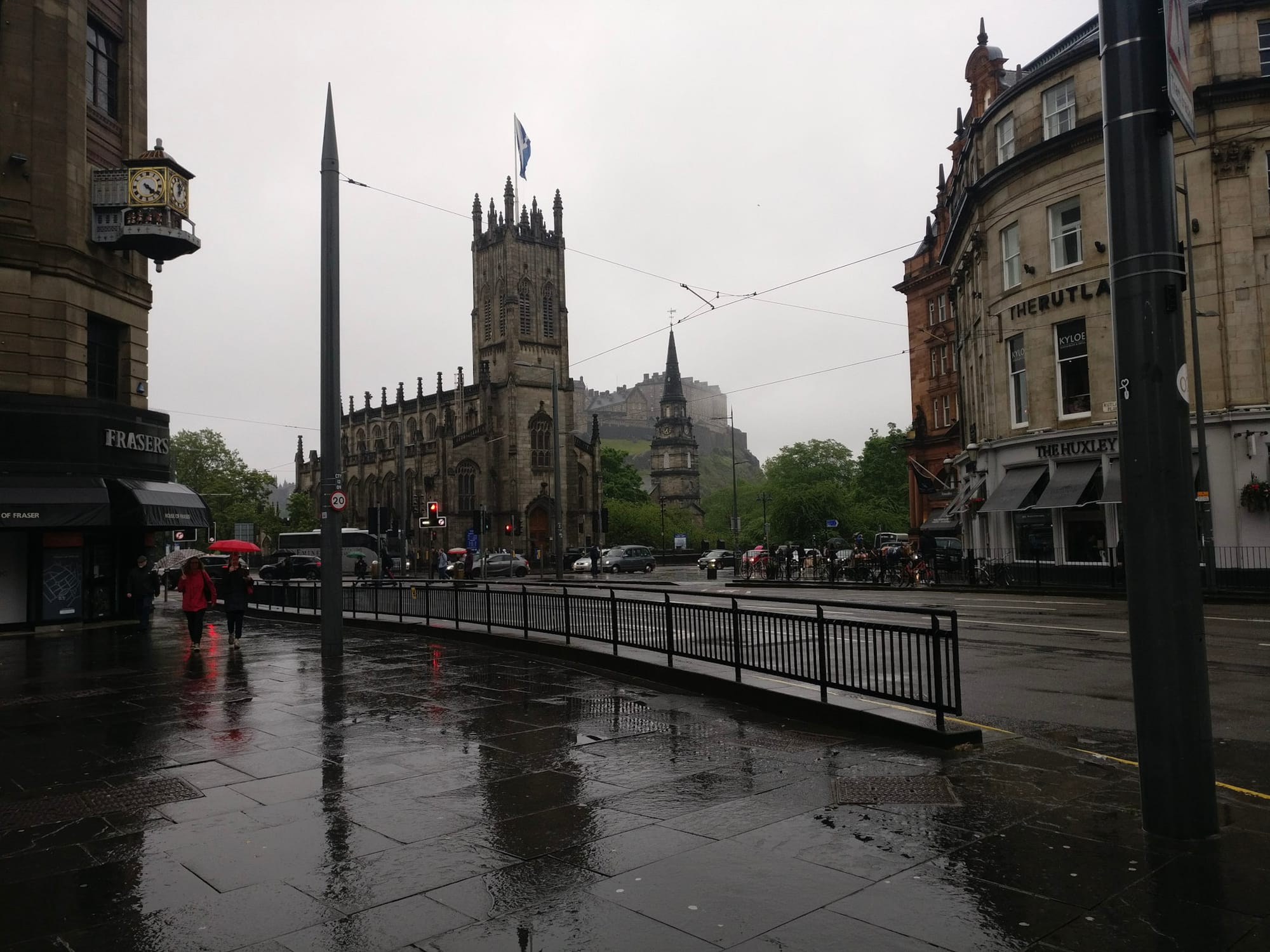Als bereits “Ortskundige” zeige ich beiden meine Entdeckungen, die hübschen alten Häuser am Leith und die düsteren Stadthäuser der New Town. Es ist trocken, aber grau und als wir auf die Princes Street zukommen, hinter der man den Burgfels aufragen sieht, ist dieser gänzlich im Nebel verschwunden.