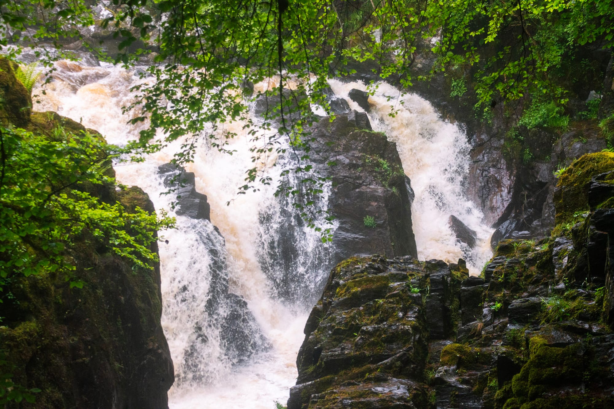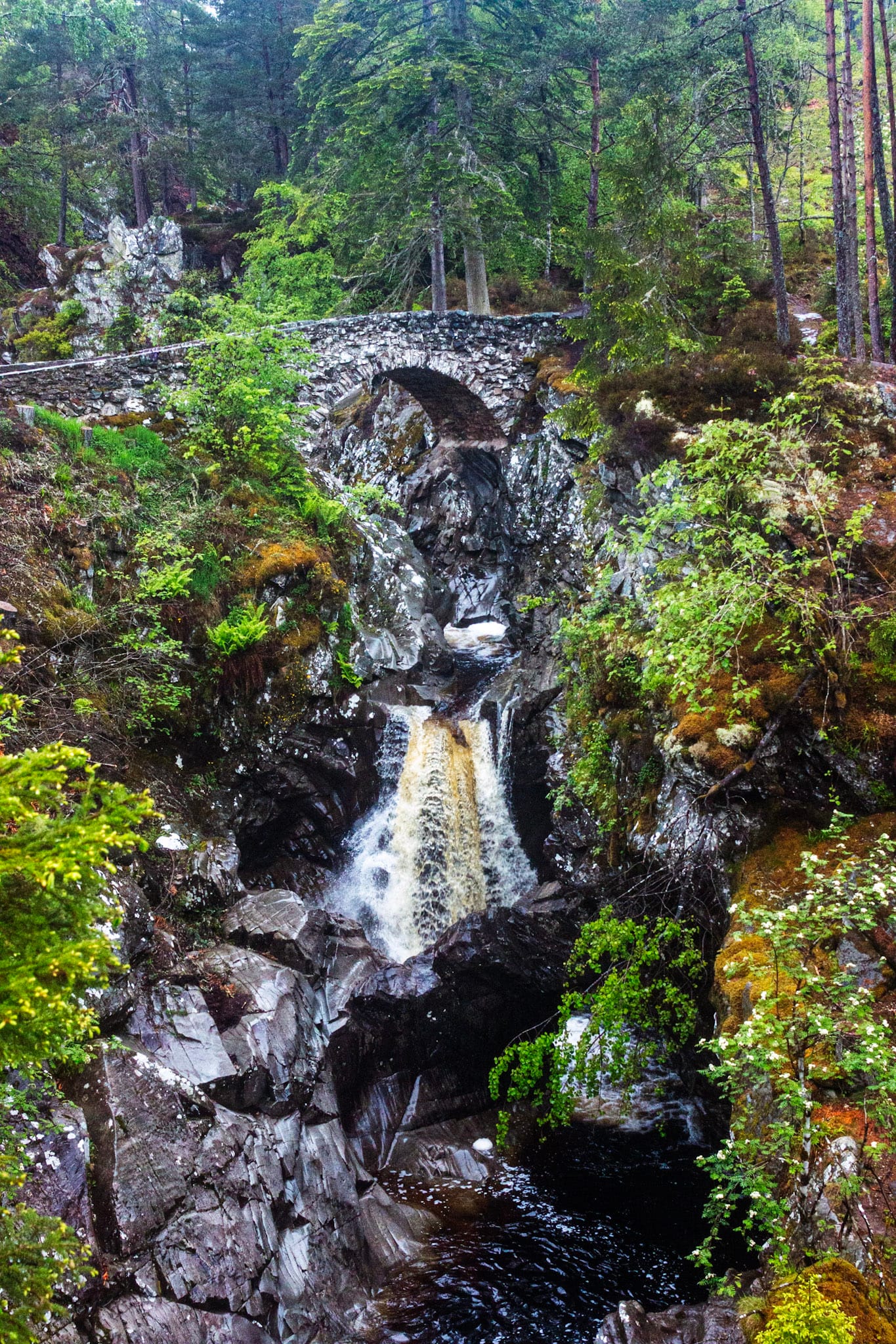 Wie schon letzten Herbst verlassen wir die M9 in Birnam und halten in Dunkeld; das pittoreske Städtchen mit der überraschend großen Kathedrale gefällt den beiden ebenso wie die preisgekrönten und auch diesmal wieder wohlschmeckenden Fish & Chips. An der Hermitage ist der Braan breit und reißend, der Wasserfall laut und beeindruckend - sprungwillige Fische hätten keine Chance. Im dichten Wald ist der Regen kaum zu spüren, alles tropft, ist leuchtend grün, moosüberzogen und verwunschen.