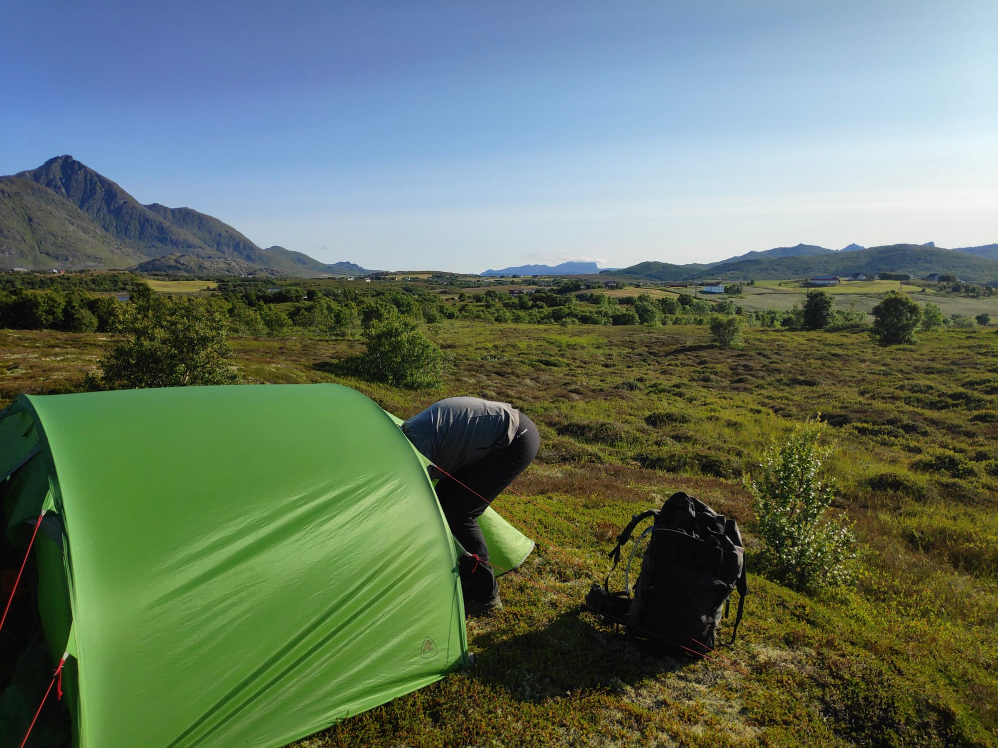 Zu Fuß marschieren wir auf einen Hot Dog zu der Tankstelle im Ort, packen danach die Rucksäcke und schlagen uns in die Heide, wo wir auf einer abgelegenen Kuppe das Zelt aufschlagen und uns mit drei Folgen “Stranger Things” von der misslichen Lage ablenken. Dann geht es in die Schlafsäcke - zumindest, bis mich morgens die erste Maschine Leknes - Bodo weckt.