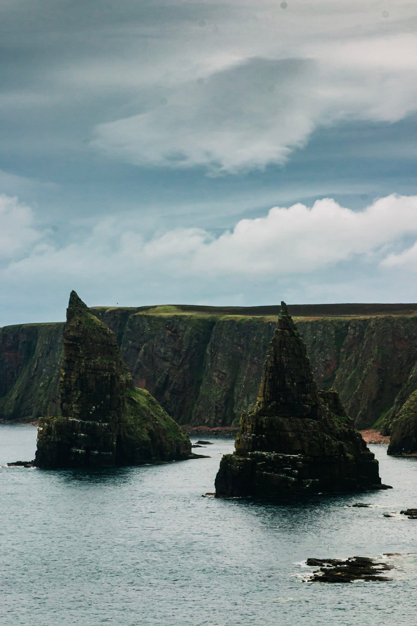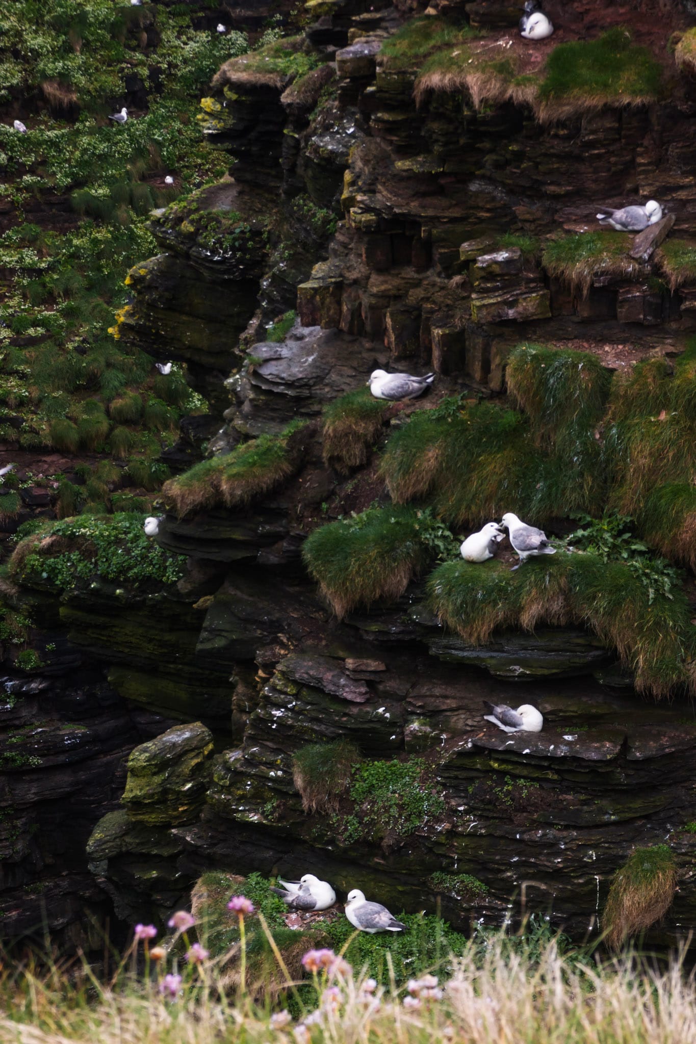 Bei unserer Rückkehr machen wir Pläne für das Heimatmuseum in Wick, werden dann aber erneut vom Wetter überrascht, das sich etwas besser entwickelt als vermutet: Es bleibt grau, aber trocken, so dass noch ein Klippenspaziergang zu den Duncansby Stacks drin ist. Am Schönsten daran ist der Blick auf die vielen brütenden Seevögel, die sich in den Nischen der verwinkelten Steilküste niedergelassen haben. Umgeben von den sich in jeder Ritze festkrallenden Grasnelken sieht es aus, als habe jede Möwenmutter ihre eigenen Balkonblumen.