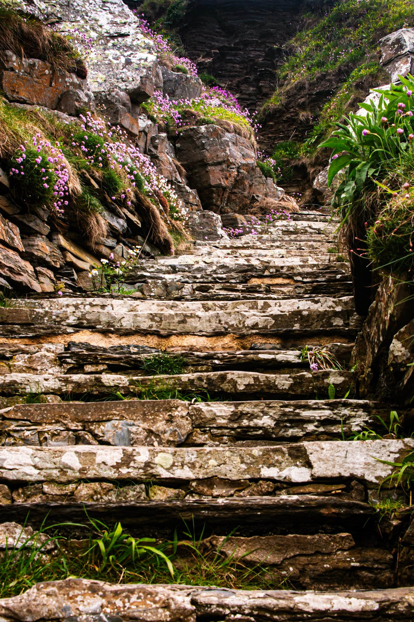 Angesichts des besseren Wetter entscheiden wir uns gegen das Schlechtwetterprogramm und halten uns an der Ostküste südwärts mit erstem Halt Whaligoe Steps. So ausführlich haben wir beiden von diesem Ort vorgeschwärmt und so skeptisch haben sie jedes Mal reagiert, aber da von so vielen Orten die Rede war, sind die beiden schon halb die Treppen herunter, bevor sie Gelegenheit bekommen, sich groß Gedanken zu machen. Heiko und ich werden von einem Anwohner abgefangen, der schon viel Zeit und Geld in die Instandhaltung der Stufen investiert hat und viel über die Geschichte des Ortes zu erzählen weiß, unter anderem, dass es die Aufgabe der Fischerfrauen war, die Kiepen mit Hering die Treppen hinaufzutragen, wobei sie auf halbem Weg an einer etwas breiteren Geländerplatte Pause machen konnten. Auch wenn das Licht dieses Mal weniger schön ist, machen die verwitterten, flechtenbewachsenen und blumenumrankten Stufen doch auch dieses Mal wieder Eindruck und die schiere Majestät des Ortes wirkt auch bei düsterer Beleuchtung - insofern sind auch unsere Reisegäste glücklich, sich dem Besuch nicht verweigert zu haben.