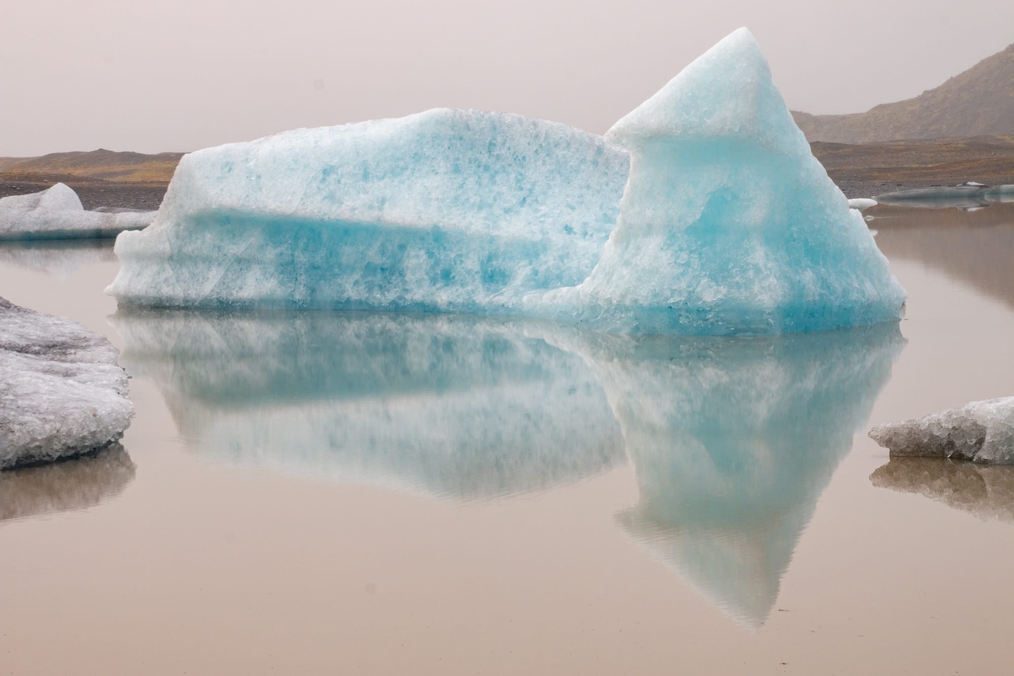 Unverdrossen besichtigen wir auch die nächste Gletscherzunge, den Heinabergsjökull, und spazieren dort zu einem Wasserfall und zum Gletschersee, wo sich gerade ein Trupp Kajakfahrer fertigmacht - man fragt sich, wie die alle auf der kleinen Lache Platz haben sollen! Bevor wir es herausfinden können, geht es schon weiter oder genauer: zurück, wir planen, ein Café in Höfn aufzusuchen und dort den regnerischen Mittag zu überbrücken. Leider scheitert der Plan daran, dass es in Höfn kein Café gibt, es gibt statt dessen einen Burger und ein Hummerbaguette in der Hafnarbudin, bevor wir zurück zum Auto schlendern und die Weiterfahrt Richtung Osten antreten. Natürlich können wir, wie gefühlt halb Europa, am Jökullsarlon nicht vorbeifahren. Langsam treiben Eisberge vom Gletscher aus hinaus aufs Meer, nur um dort wieder an den schwarzen Strand gespült zu werden und der Regen nimmt der Sache nichts von ihrer Faszination. Seehunde tauchen zwischen den Eisbergen. Ebenfalls unverdrossen: ein koreanisches Brautpaar, das sich vor besonderer Kulisse ablichten lassen will.