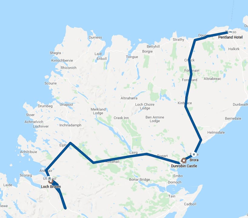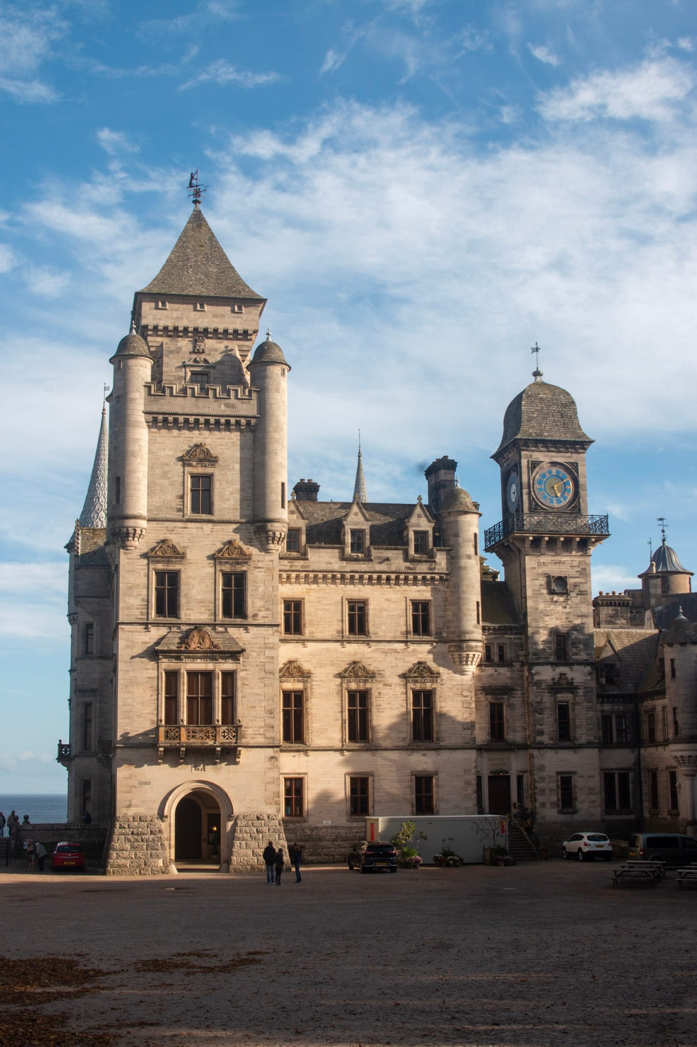 Als wir in Ullapool für einen Stadtrundgang anhalten, hat das Wetter schon wieder ausgelassen und es bleibt bei einem kurzen Kaffee. Einige Kilometer legen wir so im prasselnden Regen bei null Sicht zurück, bis ich den Wetterbericht neu sichte und wir uns auf einen Abstecher an die Ostküste einigen - dort soll es besser sein und auch diesmal enttäuscht die Präzision des schottischen Wetterberichts uns nicht, schon bald darauf hört der Regen auf und die Wolkendecke lichtet sich. Als wir nach der Fahrt über gewundene Hochlandstraßen, vorbei an wenigen einsam gelegenen Gehöften und vielen Schafen in Golspie ankommen, kann sich die Sonne schon stellenweise durchsetzen.
