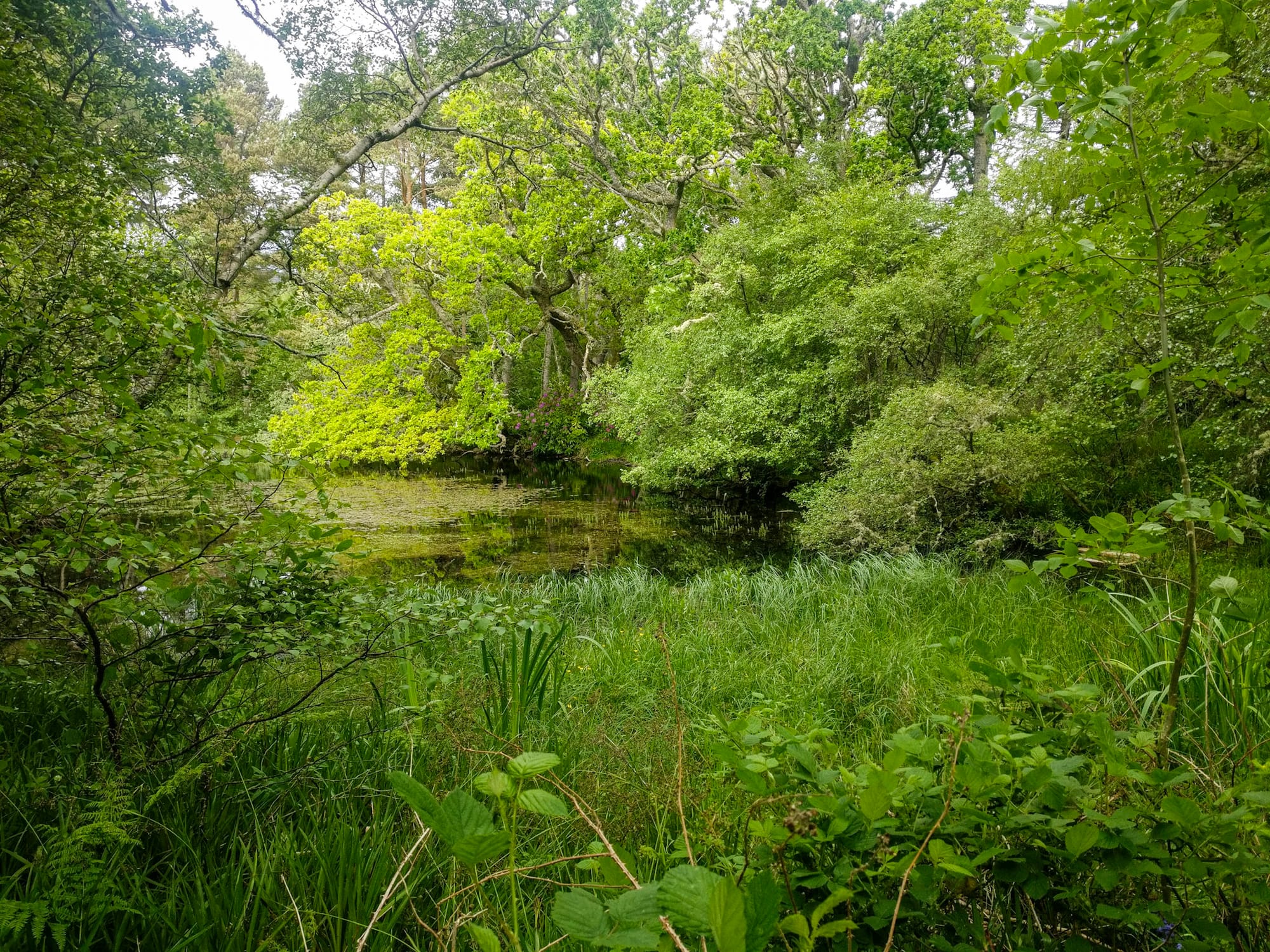 Der Big Burn Walk zwischen frischem Frühlingsgrün und Lichtungen voller bluebells ist um diese Jahreszeit noch schöner als im Herbst, im skating pond spiegelt sich der Rhododendron und an den Hängen der Schlucht leuchtet in den unmöglichsten Nischen sattgrün der Bärlauch. Der Big Burn ist kräftig angeschwollen und tost torfbraun und so stark schäumend in seinem Bett zu Tal, so dass wir ihn “Colafluss” taufen.