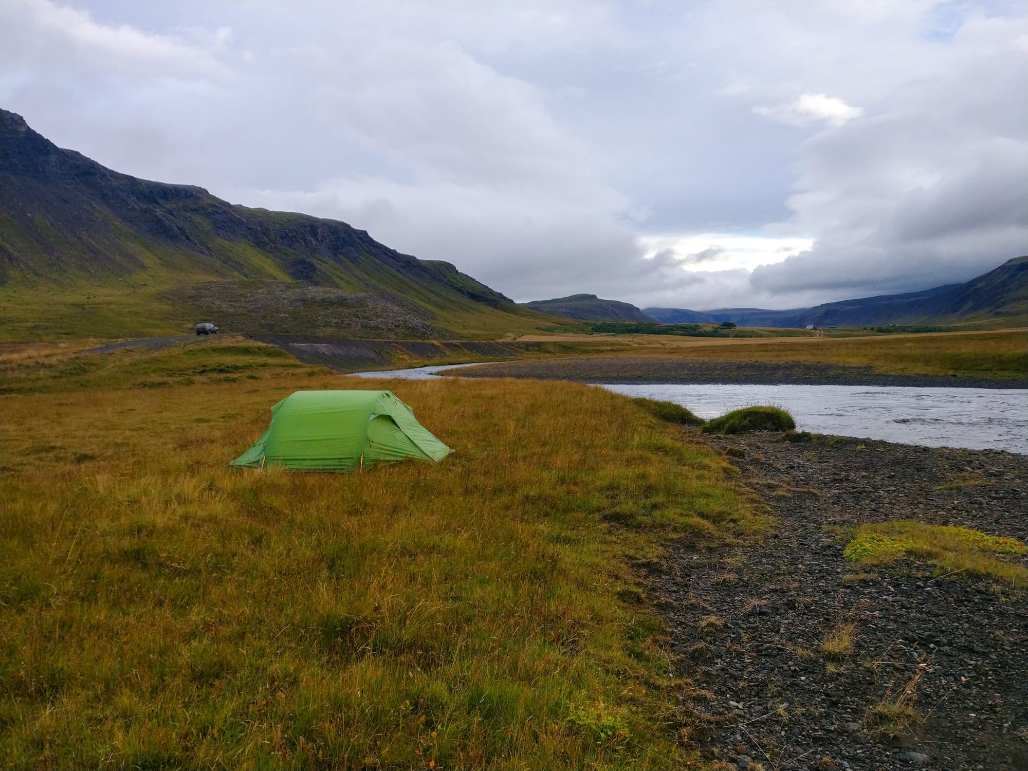 Wir folgen der Straße um die Halbinsel, durchqueren den Nationalpark, der erstaunlich gut besucht ist, an jedem Parkplatz mindestens eine Handvoll Autos. “Da vorn wird es heller”, ein halbes Dutzend Mal geäußert, entpuppt sich als Wunschdenken. Der Wetterbericht verspricht Sonne in Stykkisholmur, wo wir mit ratlosen Gesichtern auf dem Supermarktparkplatz warten, während der Regen in schweren Tropfen auf die Windschutzscheibe fällt. Eigentlich wollten wir mehr von Snaefellsnes sehen, wollen aber auch nicht im Auto warten, bis es - vielleicht - besser wird, also weiter nach Osten mit dem Fernziel Westfjorde. Wir folgen dem Alftafjord, kurz darauf einer Seitenstraße Richtung Süden, wo wir an einem Fluss ein ebenes Plätzchen finden und tatsächlich hat der Regen aufgehört. Der Fluss rauscht und gluckert, ist glasklar und heißt Stora Langadalsa.