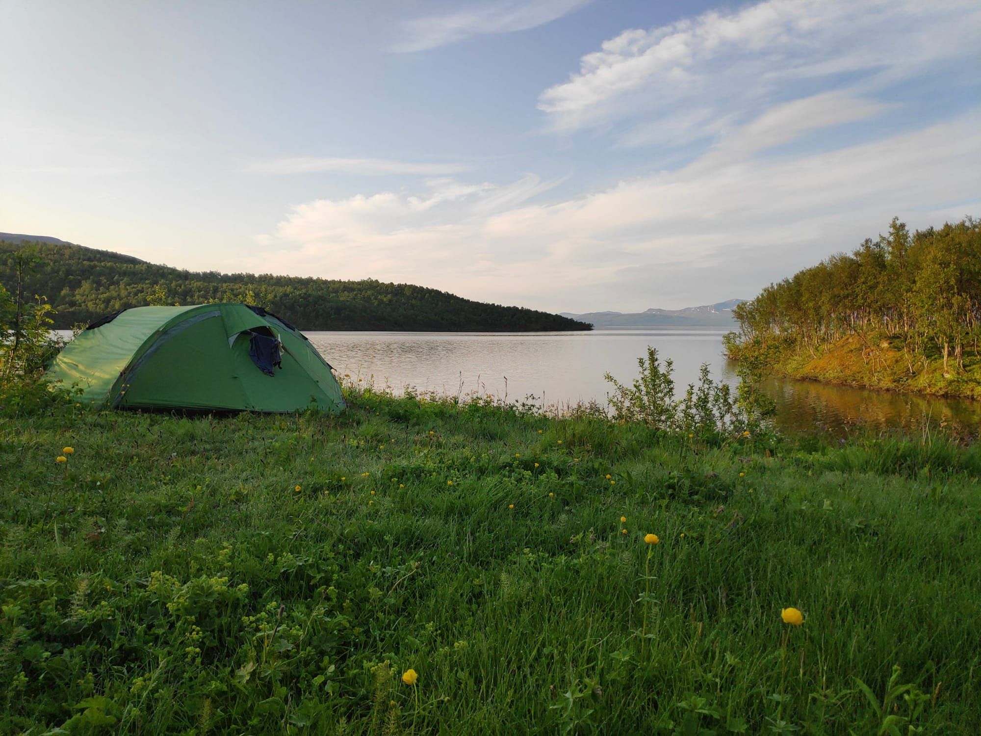 Das Wasser des Sees liegt spiegelglatt da, während ich barfuß auf dem Kieselstrand stehe und kurz habe ich Scheu, diese makellose Oberfläche zu stören. Ich stelle fest, dass Heiko nicht untertrieben hat, das Wasser ist eisig. Wie ich später lese, ist der Torneträsk häufig bis weit in den Juni hinein zugefroren. Kein Wunder, dass die Temperaturen da nicht zum Schwimmen einladen. Nach der Wäsche kommt der warme Schlafsack kurzzeitig noch einmal sehr gelegen.