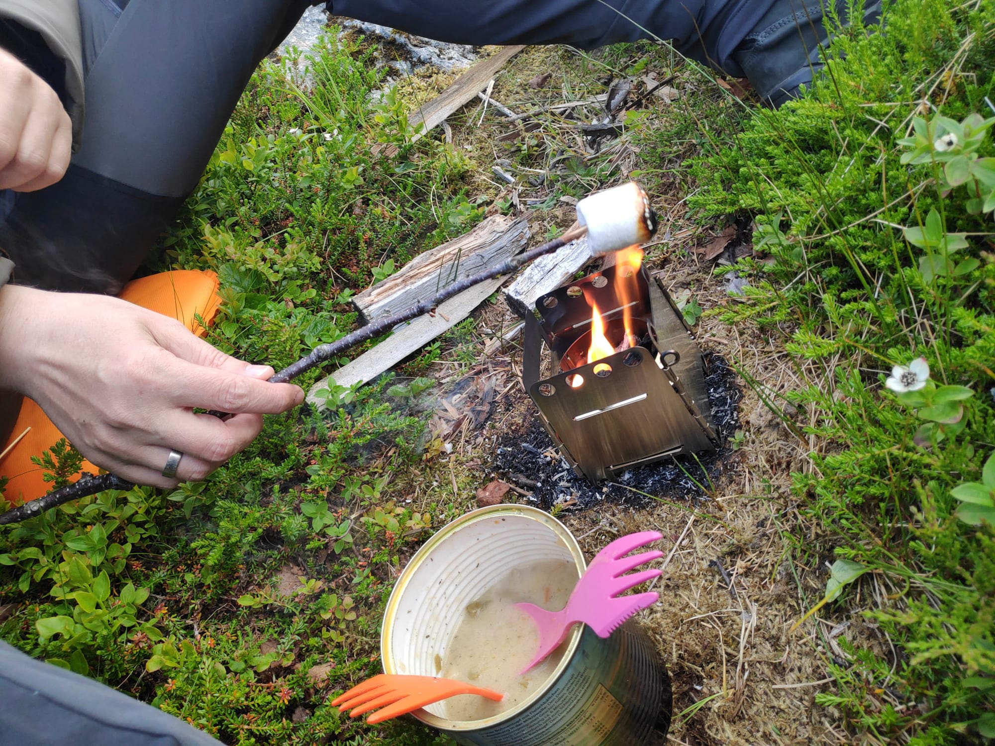 Der Zeltplatz in einer Mulde zwischen zwei glattgeschliffenen Felsen ist rechnerisch kaum einen Kilometer vom Auto entfernt und damit einer der kürzesten Wege des Urlaubs, mit Erkundungsgang, Packen, Gang mit Gepäck, Holzsammeln usw. vergehen aber doch etliche Stunden und es ist acht Uhr vorbei, bis wir uns eingerichtet haben. Es gibt nicht genug trockenes Holz für ein Lagerfeuer, Späne aus einer vergammelnden Holzbohle reichen aber, um den Hobokocher zu bestücken und stilecht eine Dose Bohneneintopf darauf zu erwärmen. Ich blicke fasziniert auf das kleine Feuer, das sogar rundum etwas Wärme abgibt und über dem wir zum Nachtisch noch Marshmallows rösten.