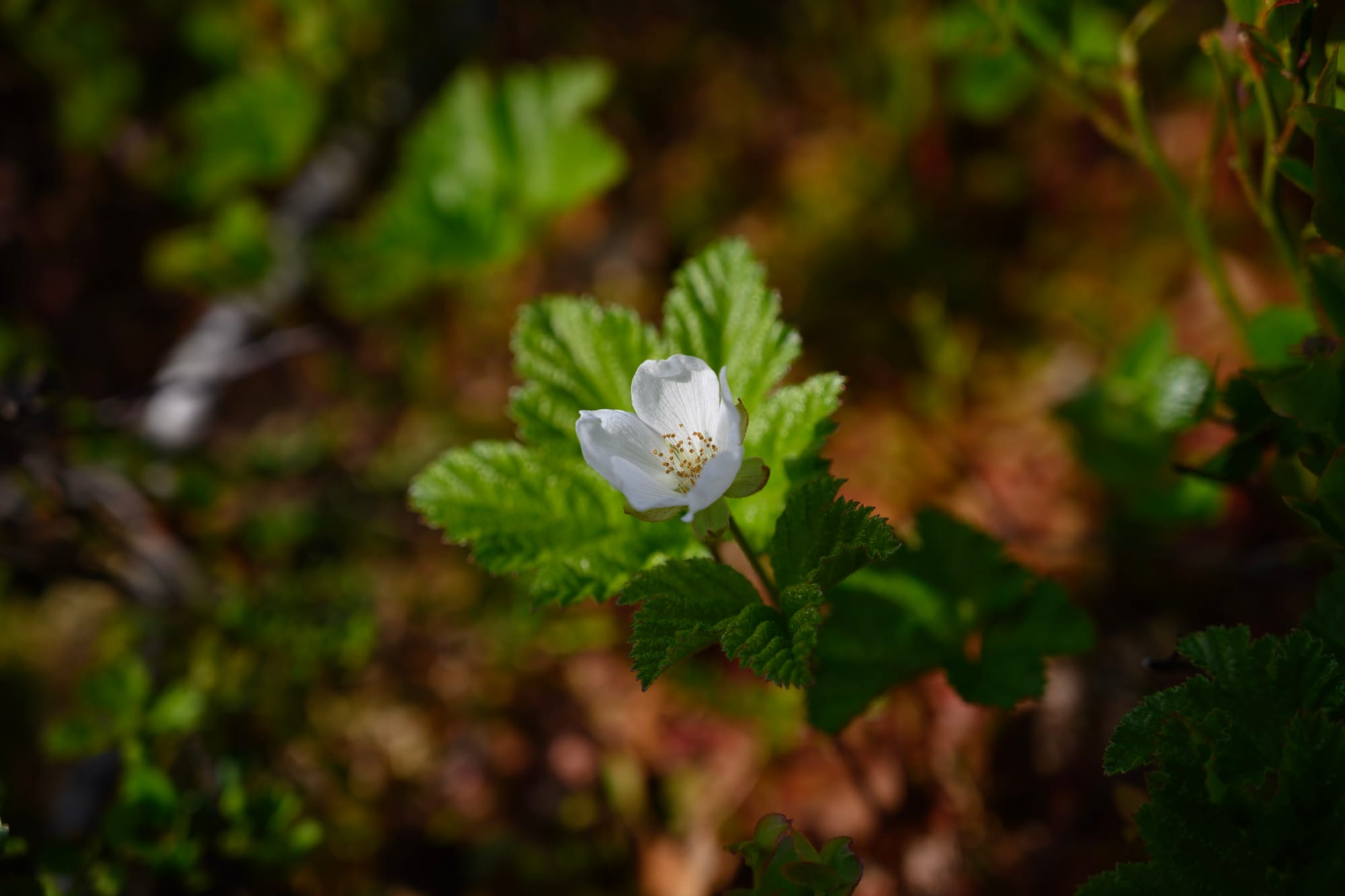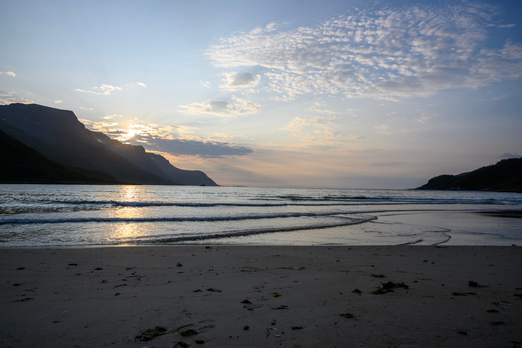 Vor Bardufoss biegen wir Richtung Finnsnes ab und sehen kurz zuvor das Meer wieder. Über die imposante Brücke geht es schließlich nach Senja. Der Süden der Insel ist wunderschön, bunte Holzhäuschen inmitten satter Wiesen, Millionen bunte Wildblumen und immer wieder das metallisch blaue Meer. Die Berge im Norden sind nur zu erahnen, werden aber imposanter, während wir auf Botnhamn zu halten. Der langgezogene Rücken des Astritind war auf dem Papier der Schlafplatz für heute nacht, aber nach den Erfahrungen in Lappland traue ich mir die 500 Meter Aufstieg heute nicht mehr zu (und bin unsicher, ob überhaupt!). Der Alternativschlafplatz liegt am Baltsfjord, einem kaum zugänglichen Fjord nördlich von Botnhamn, wo es einige schöne Sandstrände gibt. Dorthin biegen wir vor dem Ortskern von Botnhamn in eine Schotterstraße ein, die durch Sumpf und lichten Birkenwald vorbei an einem Steinbruch nach Norden führt.