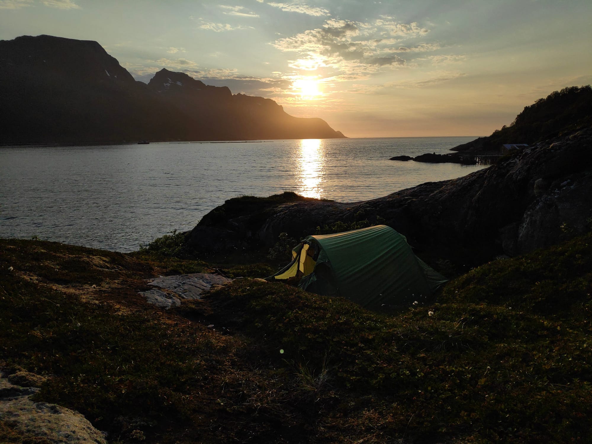 Es ist warm genug, um das Zelt offen zu lassen, und wenn ich auf H.s Seite durch das Moskitonetz luge, sehe ich hinter den abfallenden Felsen neben dem Zelt die steil aufragenden Berge der anderen Fjordseite - ein unwirkliches Bild, das die Illusion von Hochgebirge erzeugt.