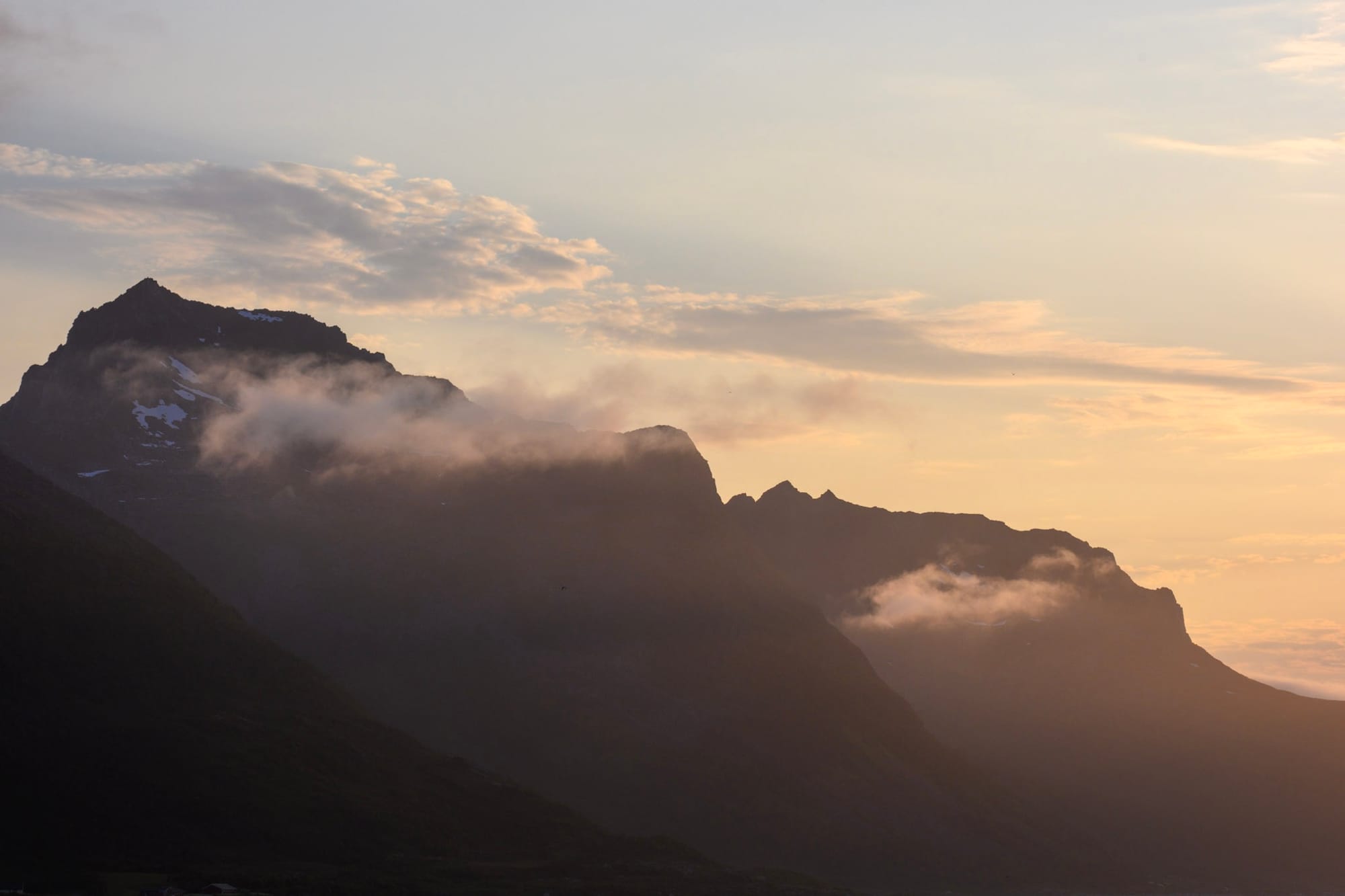 Gegen elf sind wir zurück am Zelt und dann doch zu müde, um die Mitternachtssonne abzuwarten, ich merke aber, wie sich immer mehr Wolken an den Berghängen materialisieren, die mit der Großwetterlage anscheinend nichts zu tun haben. Ironischerweise werde ich am Ende dieses pervers sonnigen Urlaubs eine Menge über Wolken gelernt haben.